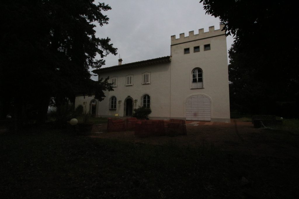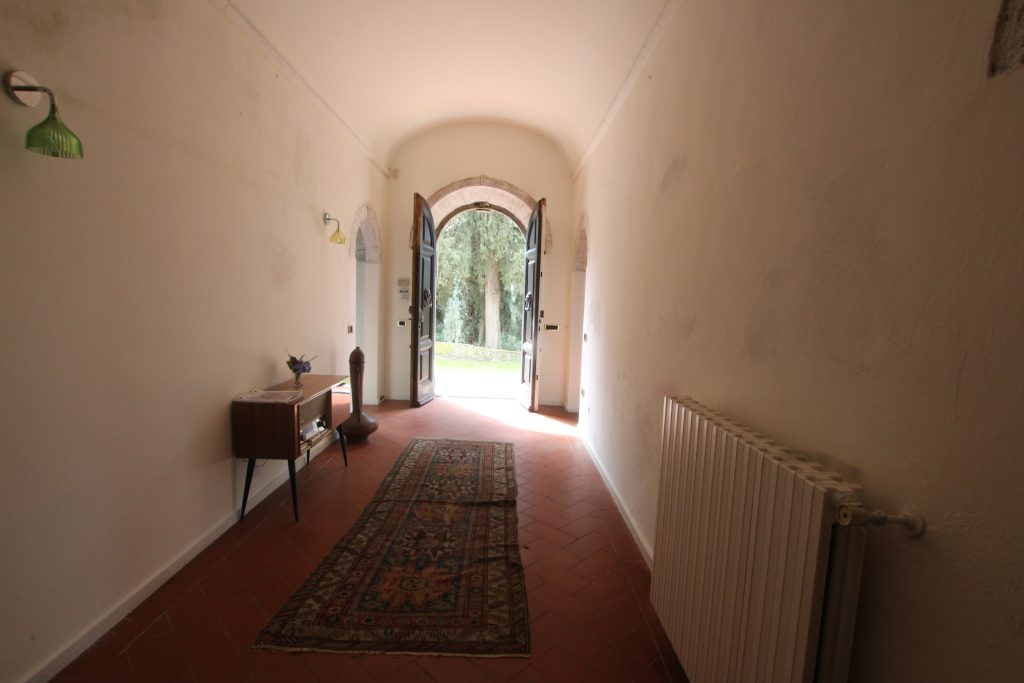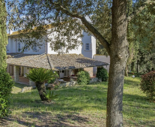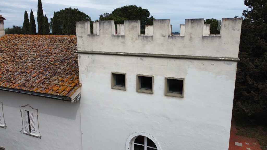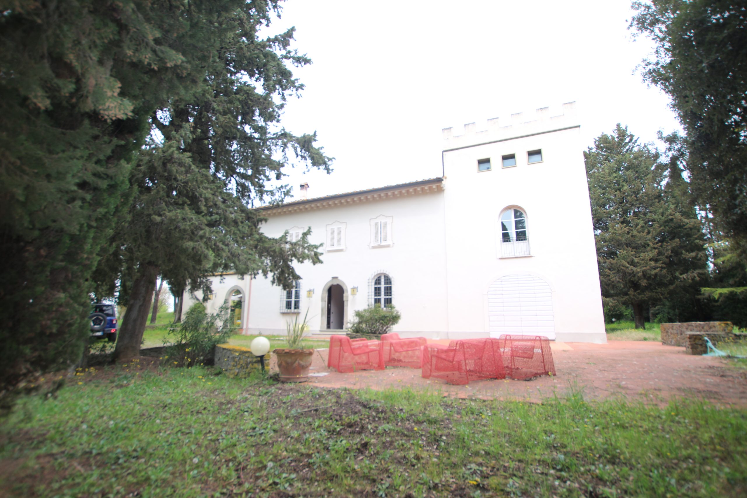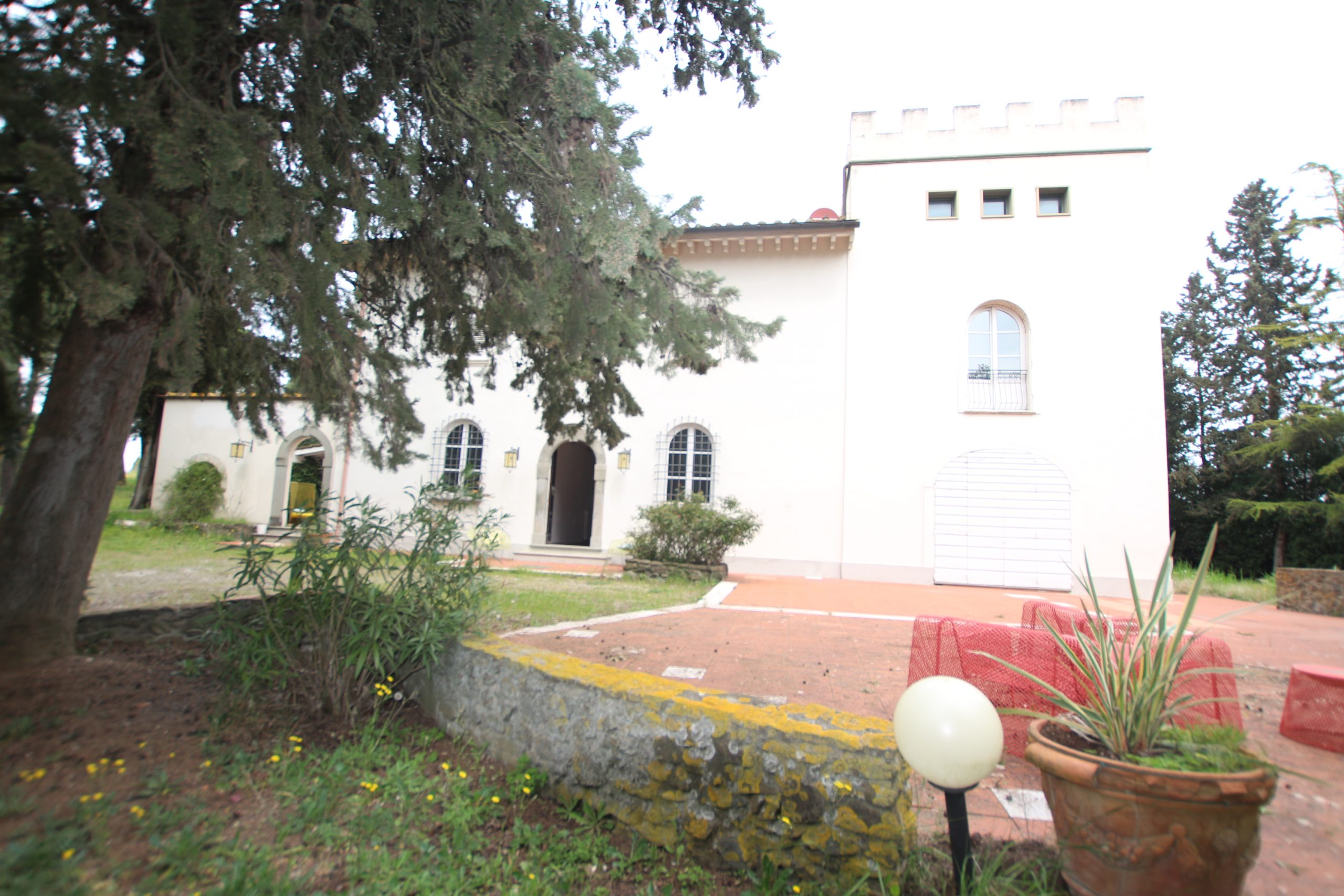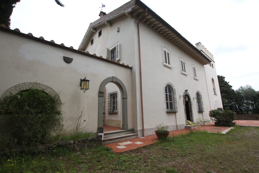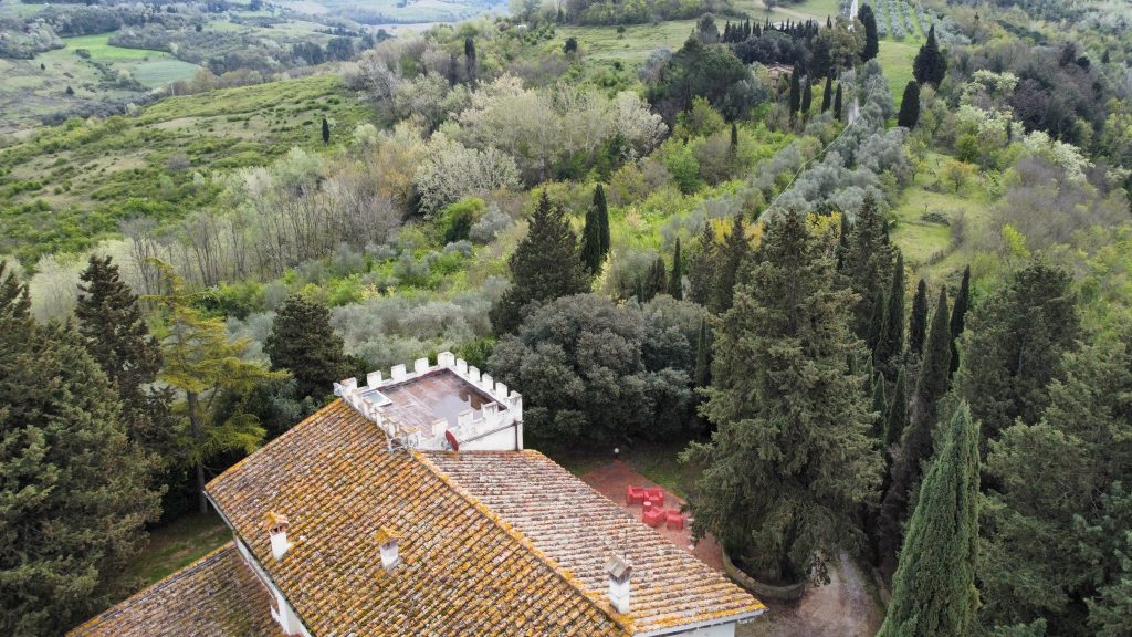 Villaen, som har blitt fullstendig og smakfullt renovert, er på 500 kvm på to etasjer og har et pittoresk tårn. Huset består av: stor gang, bred stue med peis, fullt utstyrt kjøkken med utgang til veranda, lesesal, bad, biljardrom og bod på bakkeplan. Innvendig trapp fører til første etasje som består av: et hovedsoverom med eget bad, 4 soverom og et bad til og tilgang til det sjarmerende panoramatårnet. Rommene er brede og lyse, badene er i marmor og alle renoveringer er utført med ekstremt høy kvalitet. Villaen ligger i en panoramisk beliggenhet, omgitt av 15 hektar tomt og nøyaktig: 5 hektar olivenlund, 5 hektar dyrkbar jord og vingård. Eiendommen kompletteres av et fantastisk svømmebasseng i en dominerende posisjon og en tennisbane som krever litt vedlikehold.