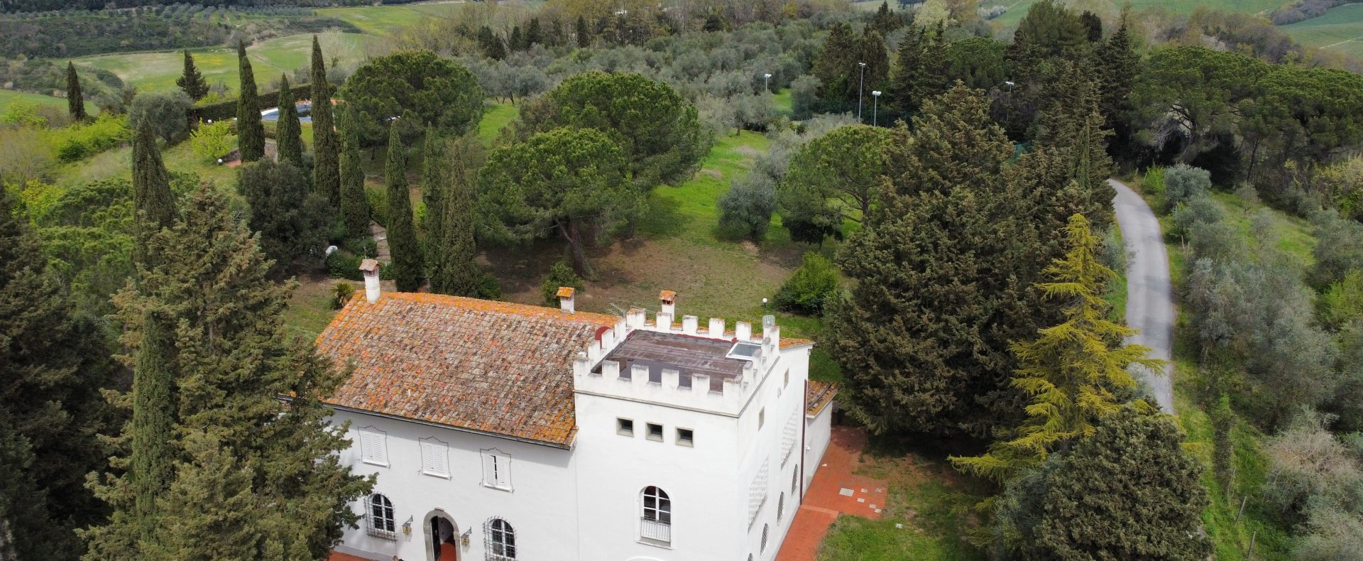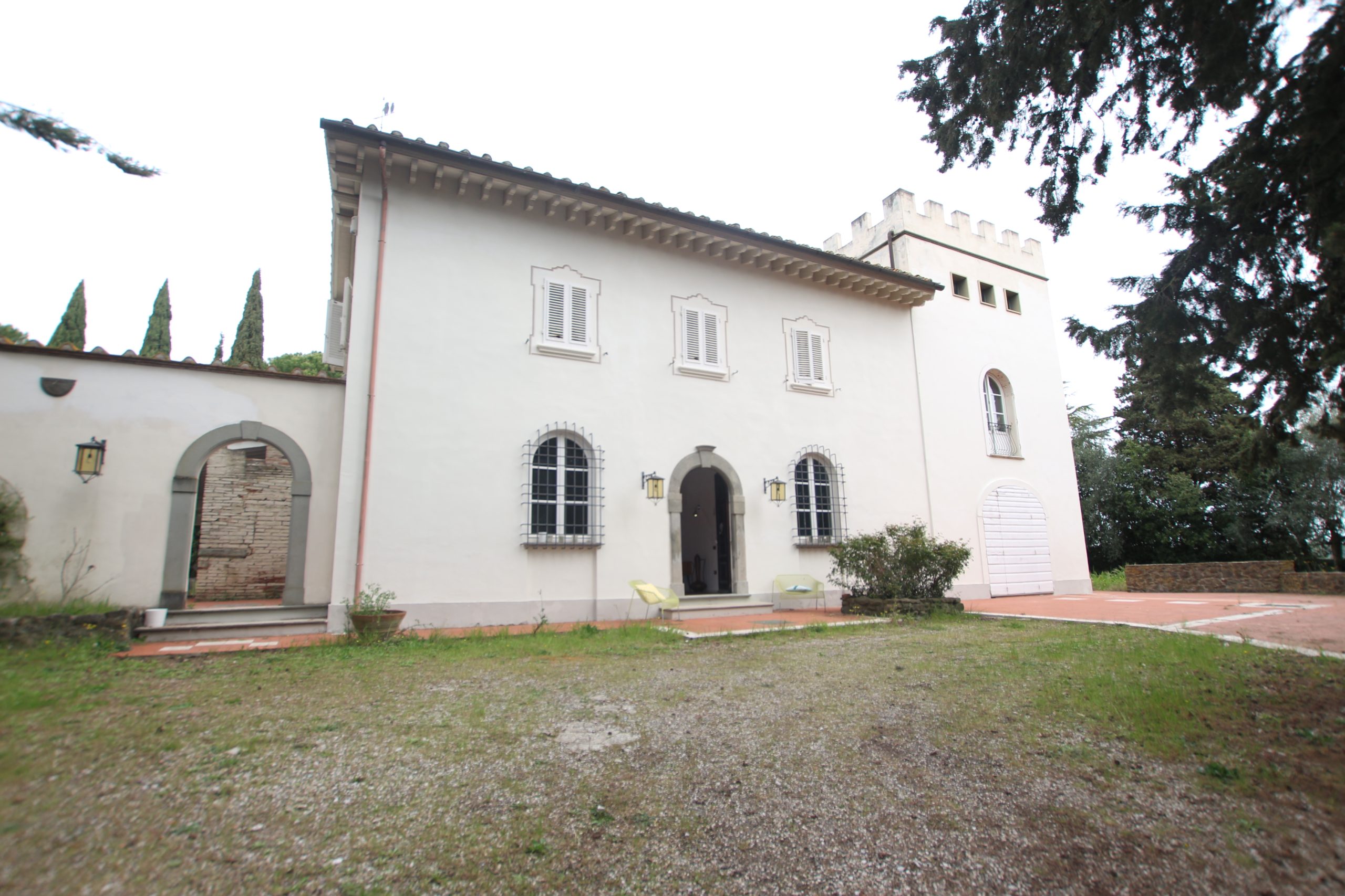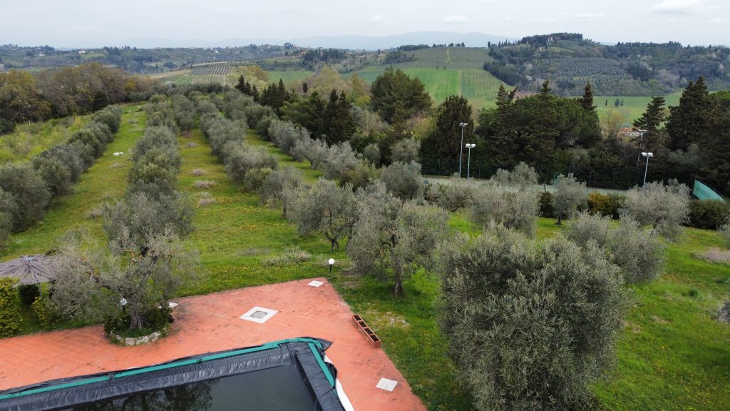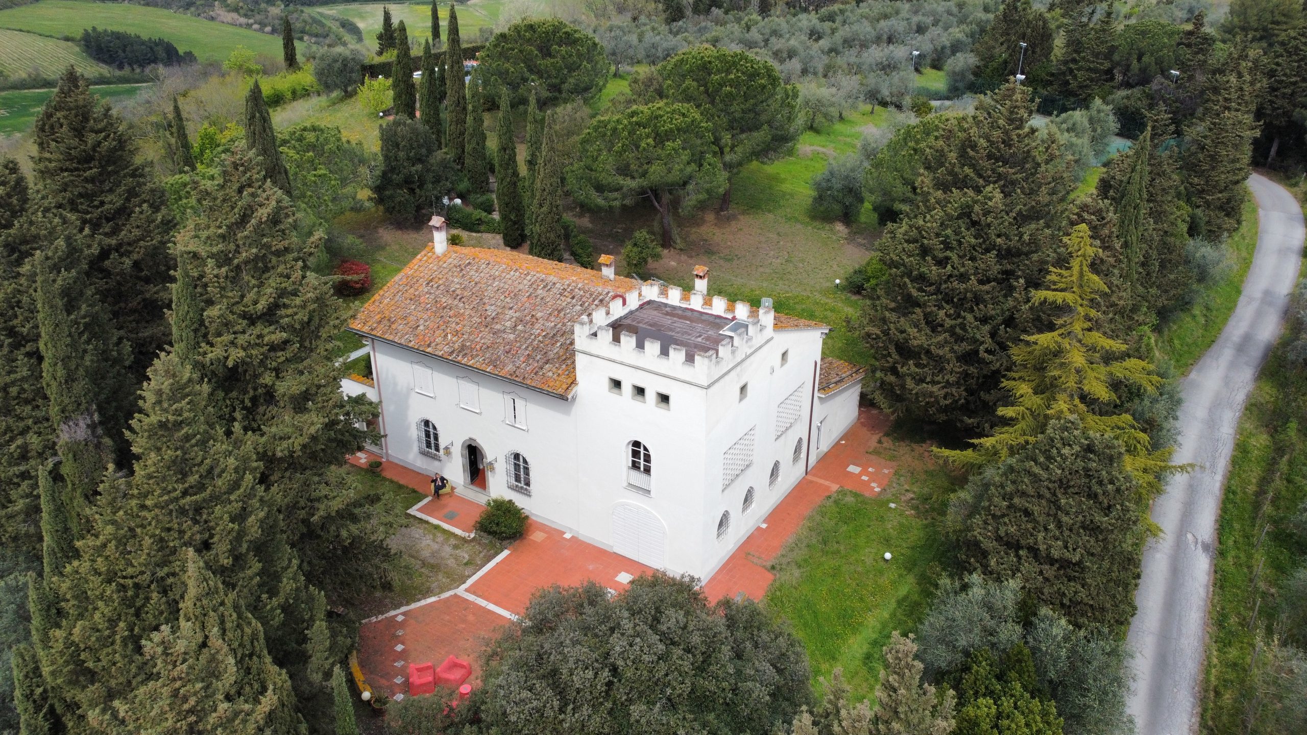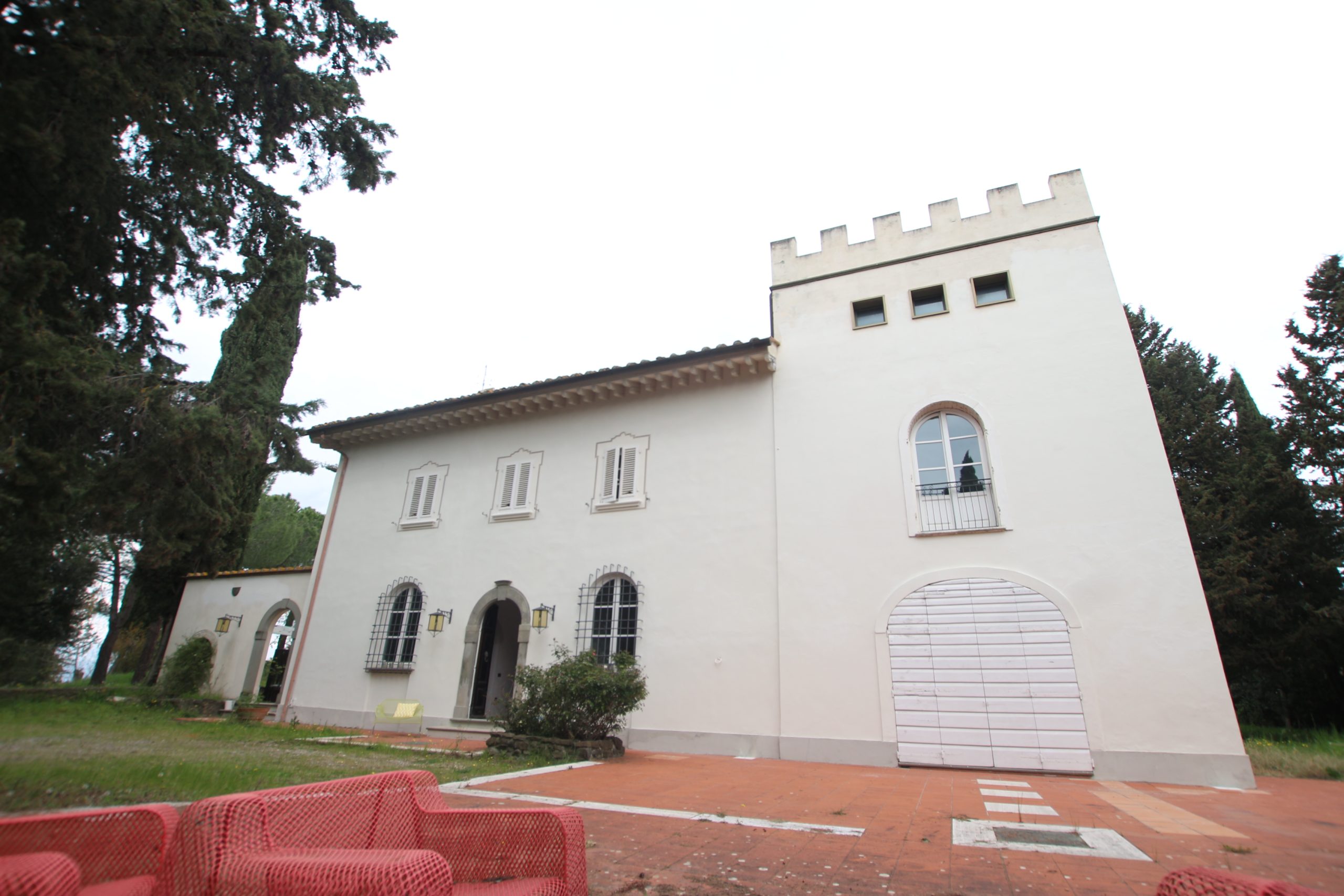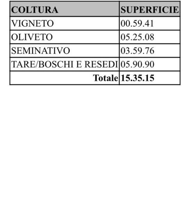 Villaen, som har blitt fullstendig og smakfullt renovert, er på 500 kvm på to etasjer og har et pittoresk tårn. Huset består av: stor gang, bred stue med peis, fullt utstyrt kjøkken med utgang til veranda, lesesal, bad, biljardrom og bod på bakkeplan. Innvendig trapp fører til første etasje som består av: et hovedsoverom med eget bad, 4 soverom og et bad til og tilgang til det sjarmerende panoramatårnet. Rommene er brede og lyse, badene er i marmor og alle renoveringer er utført med ekstremt høy kvalitet. Villaen ligger i en panoramisk beliggenhet, omgitt av 15 hektar tomt og nøyaktig: 5 hektar olivenlund, 5 hektar dyrkbar jord og vingård. Eiendommen kompletteres av et fantastisk svømmebasseng i en dominerende posisjon og en tennisbane som krever litt vedlikehold.