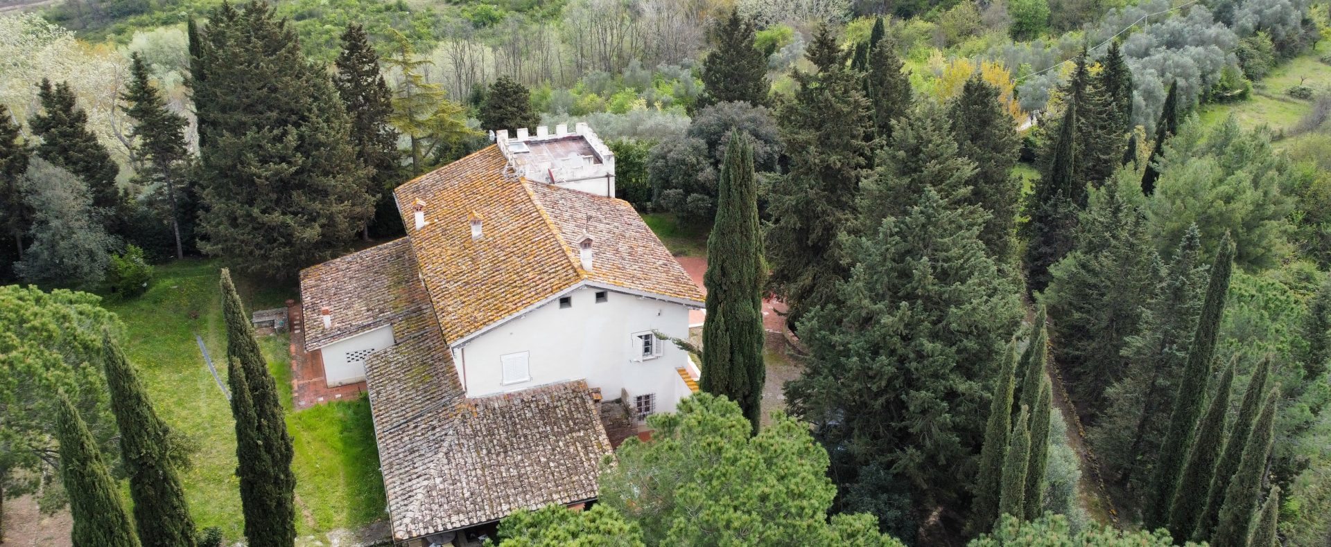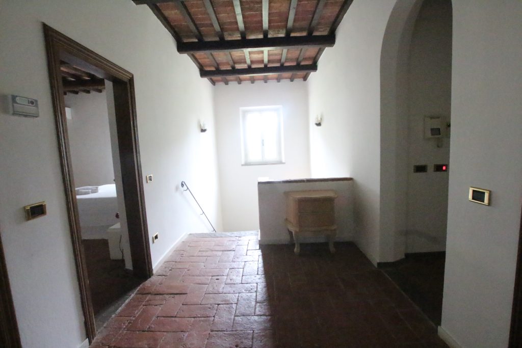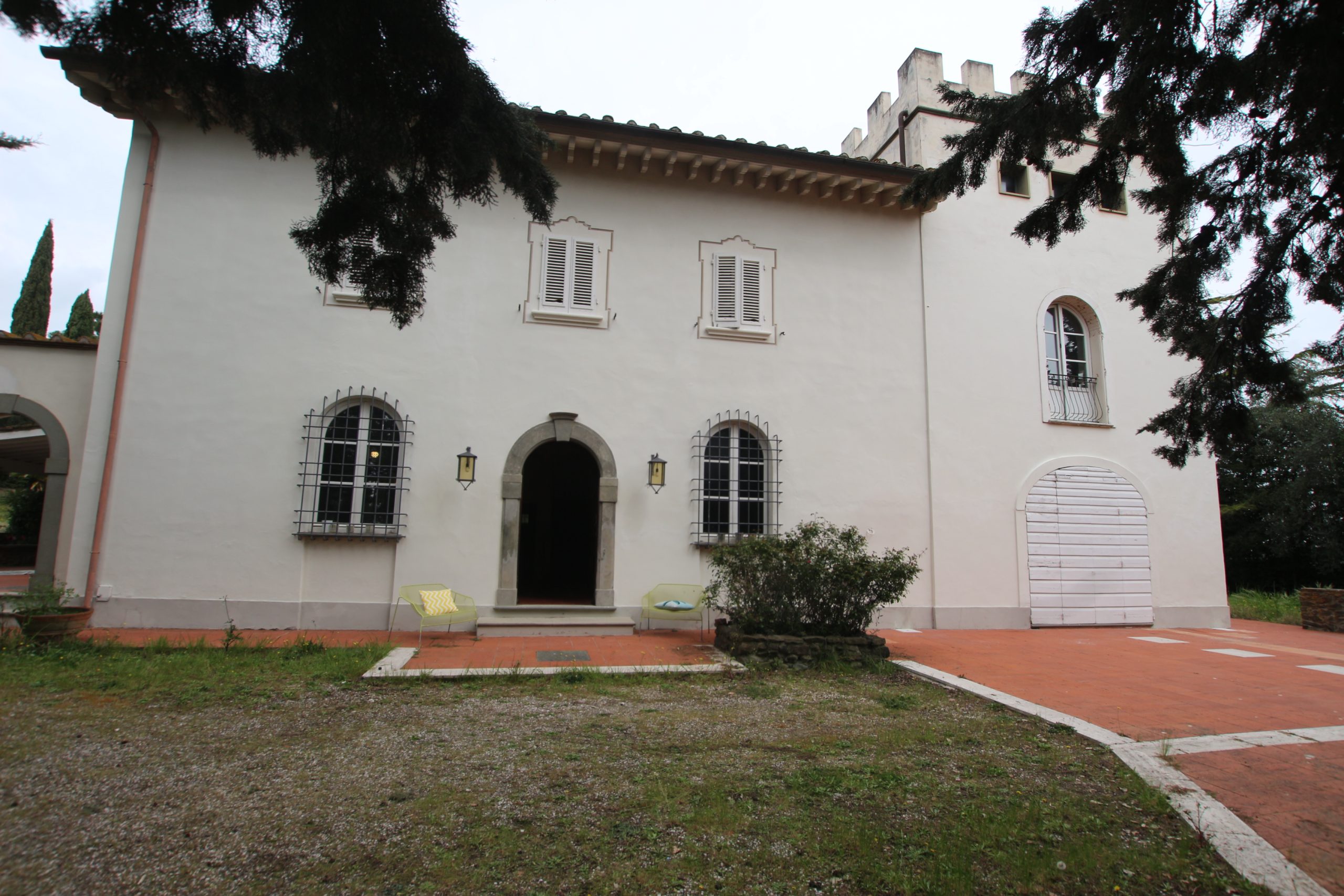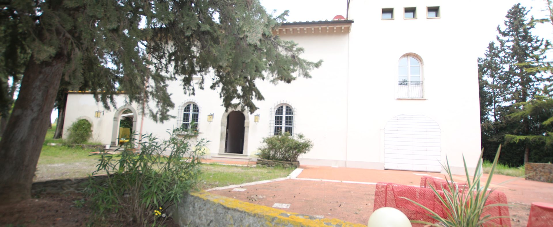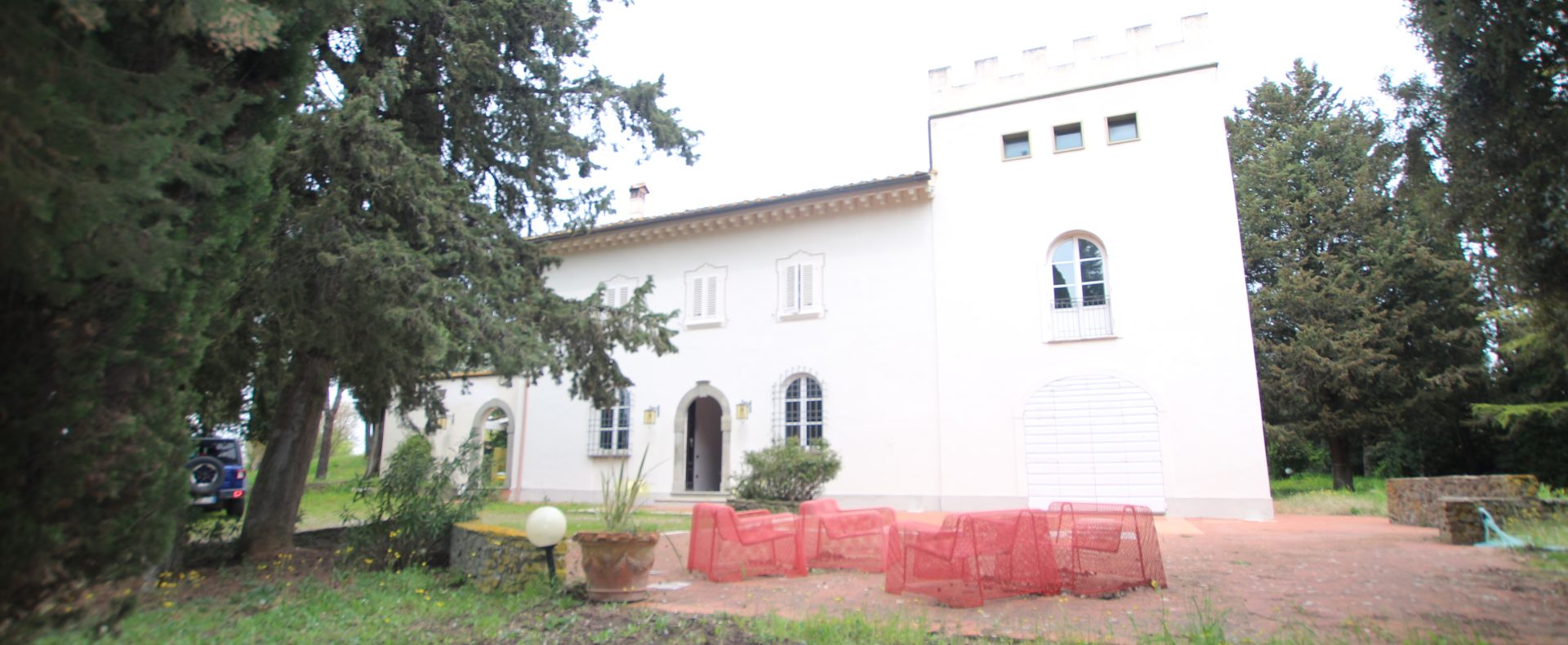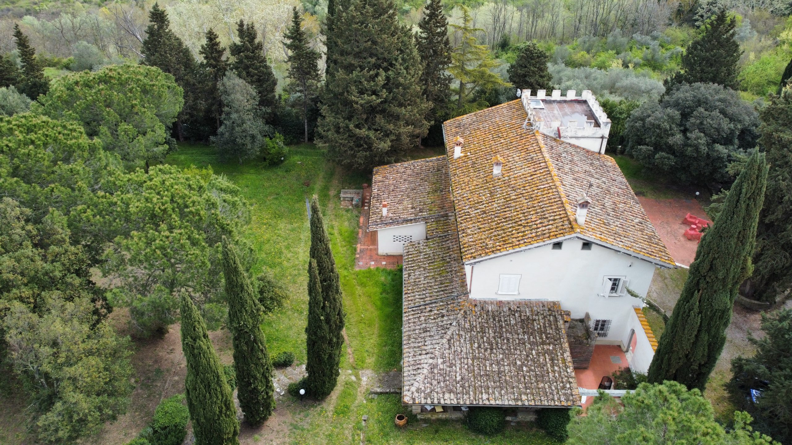 Villaen, som har blitt fullstendig og smakfullt renovert, er på 500 kvm på to etasjer og har et pittoresk tårn. Huset består av: stor gang, bred stue med peis, fullt utstyrt kjøkken med utgang til veranda, lesesal, bad, biljardrom og bod på bakkeplan. Innvendig trapp fører til første etasje som består av: et hovedsoverom med eget bad, 4 soverom og et bad til og tilgang til det sjarmerende panoramatårnet. Rommene er brede og lyse, badene er i marmor og alle renoveringer er utført med ekstremt høy kvalitet. Villaen ligger i en panoramisk beliggenhet, omgitt av 15 hektar tomt og nøyaktig: 5 hektar olivenlund, 5 hektar dyrkbar jord og vingård. Eiendommen kompletteres av et fantastisk svømmebasseng i en dominerende posisjon og en tennisbane som krever litt vedlikehold.