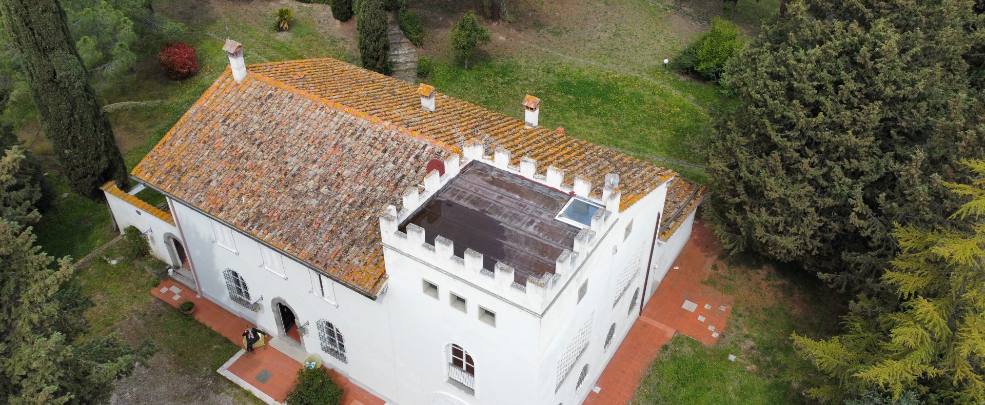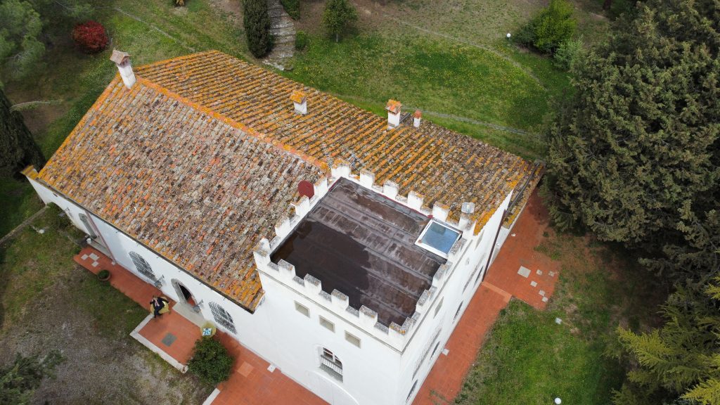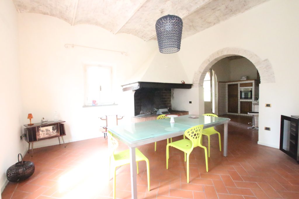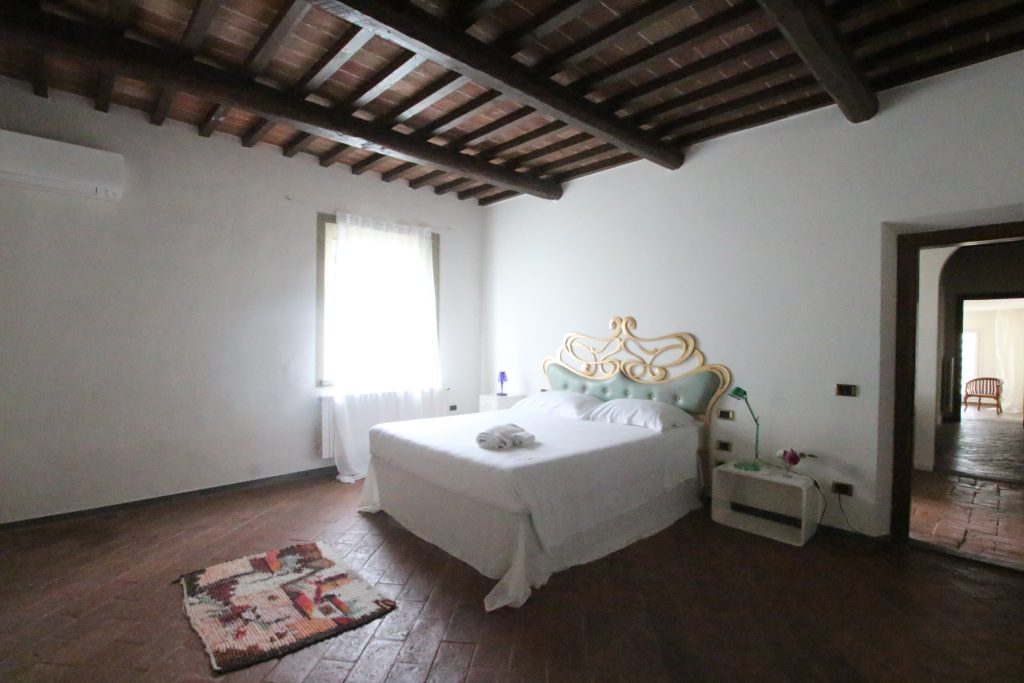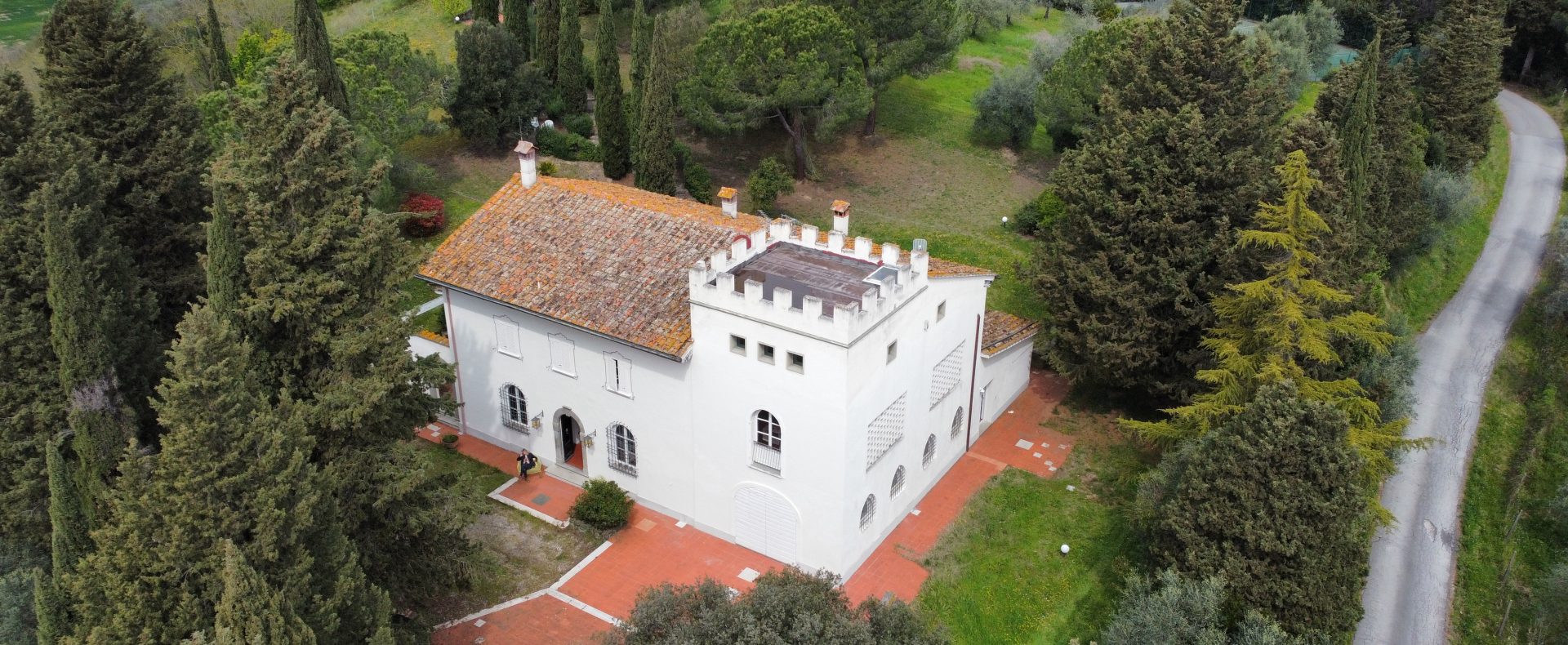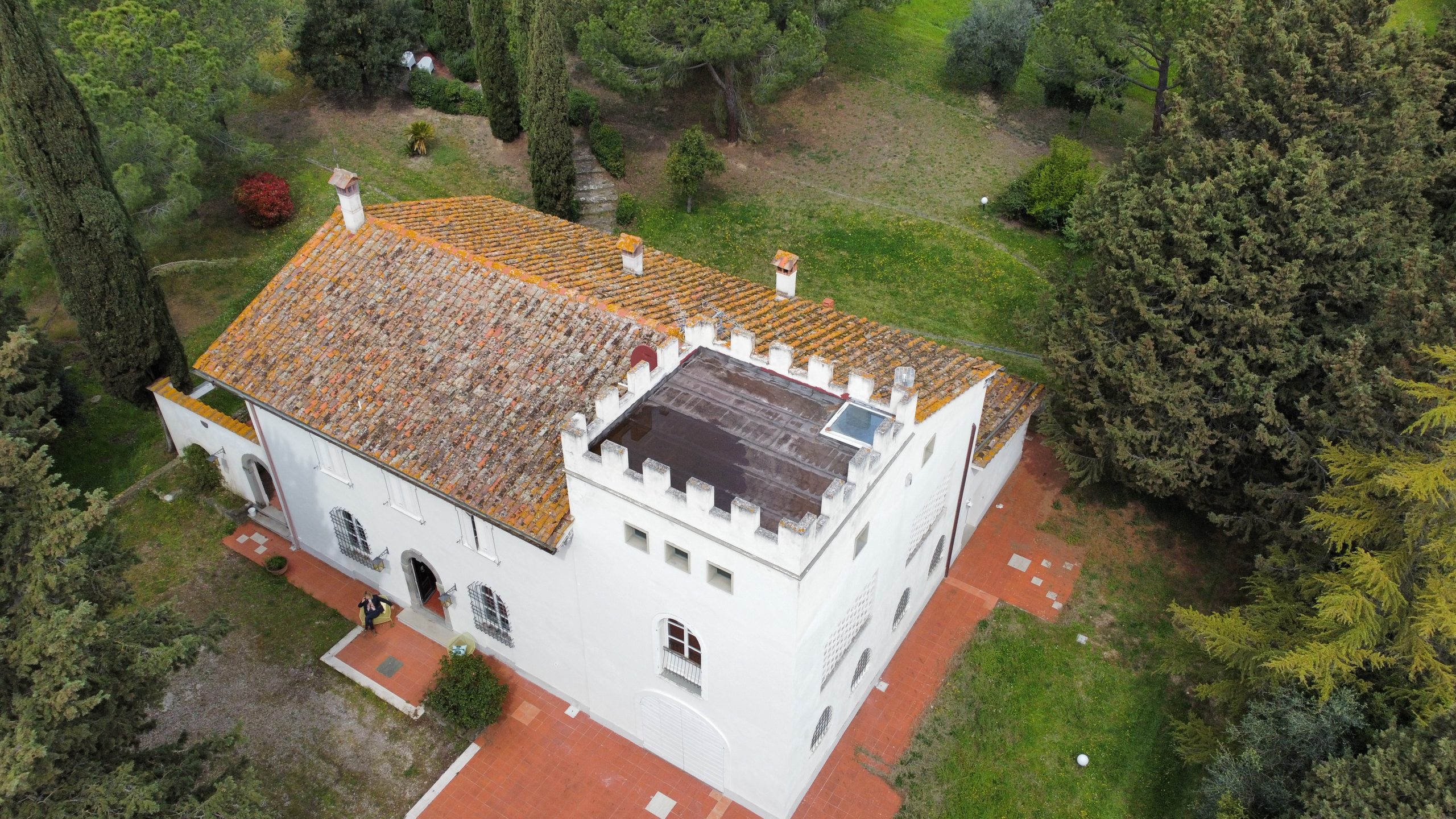 Villaen, som har blitt fullstendig og smakfullt renovert, er på 500 kvm på to etasjer og har et pittoresk tårn. Huset består av: stor gang, bred stue med peis, fullt utstyrt kjøkken med utgang til veranda, lesesal, bad, biljardrom og bod på bakkeplan. Innvendig trapp fører til første etasje som består av: et hovedsoverom med eget bad, 4 soverom og et bad til og tilgang til det sjarmerende panoramatårnet. Rommene er brede og lyse, badene er i marmor og alle renoveringer er utført med ekstremt høy kvalitet. Villaen ligger i en panoramisk beliggenhet, omgitt av 15 hektar tomt og nøyaktig: 5 hektar olivenlund, 5 hektar dyrkbar jord og vingård. Eiendommen kompletteres av et fantastisk svømmebasseng i en dominerende posisjon og en tennisbane som krever litt vedlikehold.