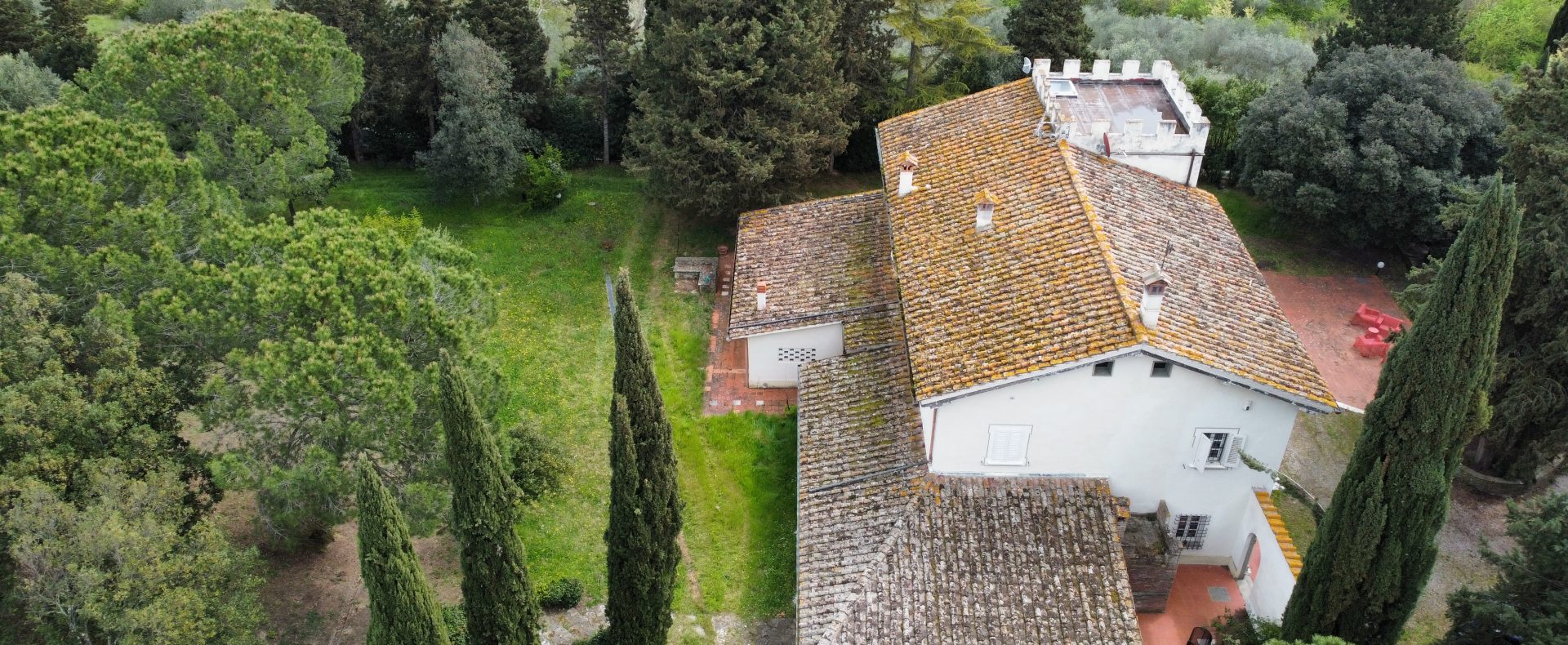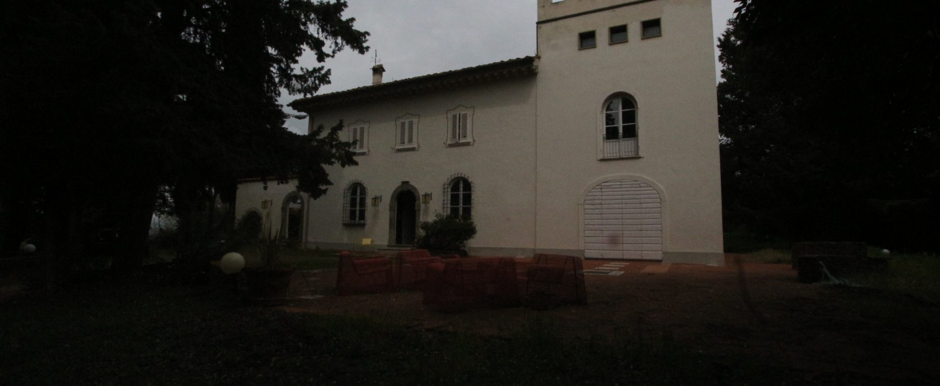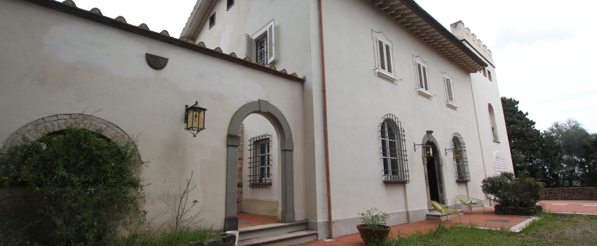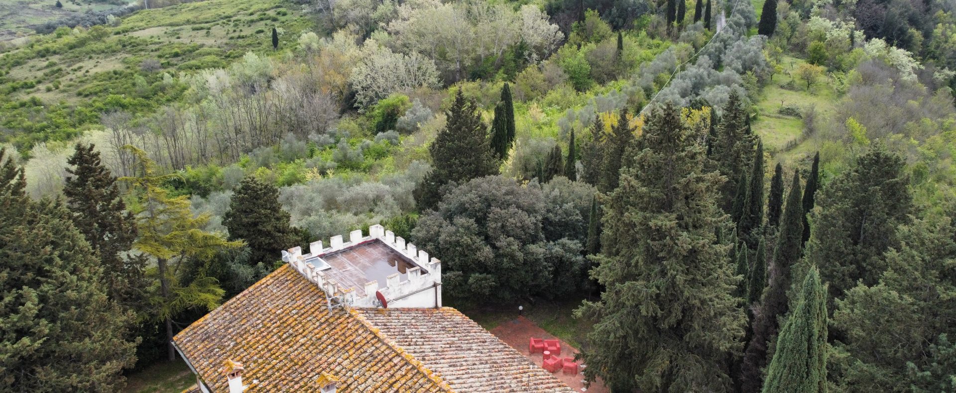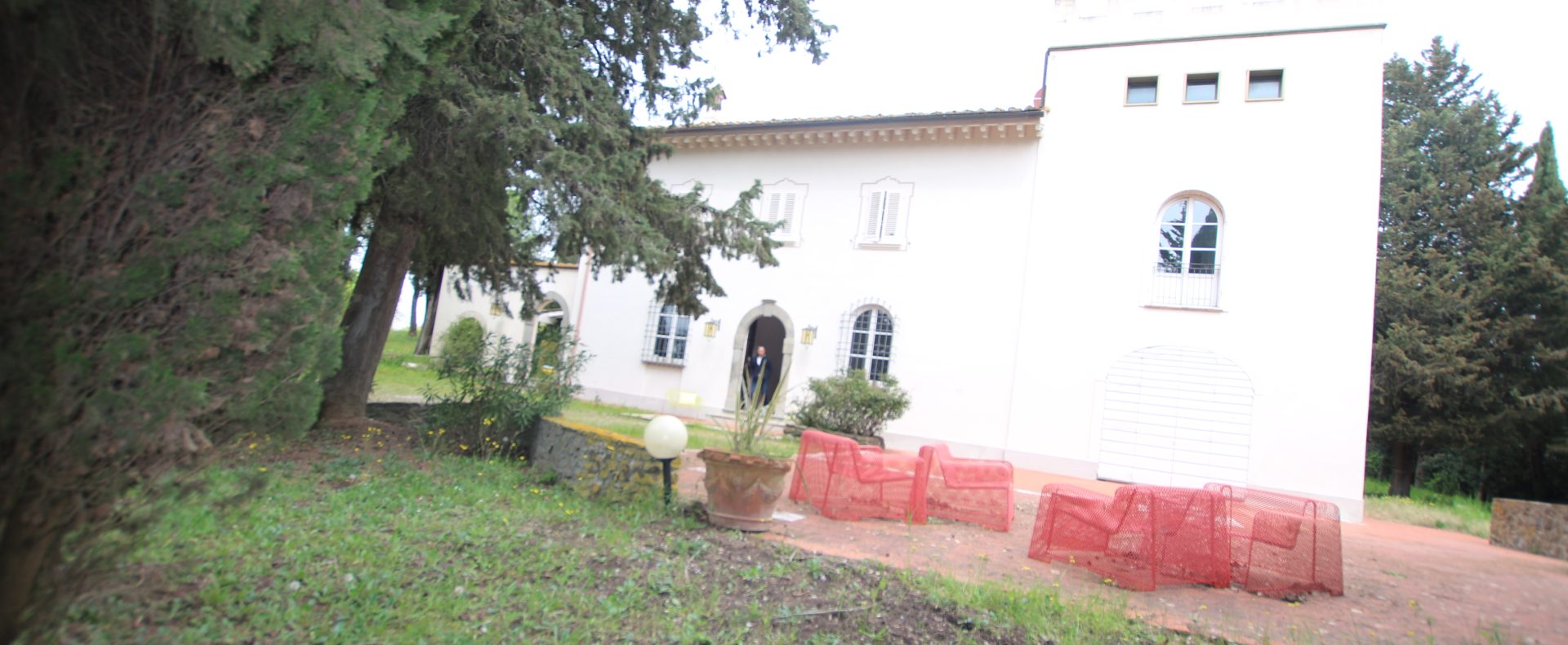 Villaen, som har blitt fullstendig og smakfullt renovert, er på 500 kvm på to etasjer og har et pittoresk tårn. Huset består av: stor gang, bred stue med peis, fullt utstyrt kjøkken med utgang til veranda, lesesal, bad, biljardrom og bod på bakkeplan. Innvendig trapp fører til første etasje som består av: et hovedsoverom med eget bad, 4 soverom og et bad til og tilgang til det sjarmerende panoramatårnet. Rommene er brede og lyse, badene er i marmor og alle renoveringer er utført med ekstremt høy kvalitet. Villaen ligger i en panoramisk beliggenhet, omgitt av 15 hektar tomt og nøyaktig: 5 hektar olivenlund, 5 hektar dyrkbar jord og vingård. Eiendommen kompletteres av et fantastisk svømmebasseng i en dominerende posisjon og en tennisbane som krever litt vedlikehold.