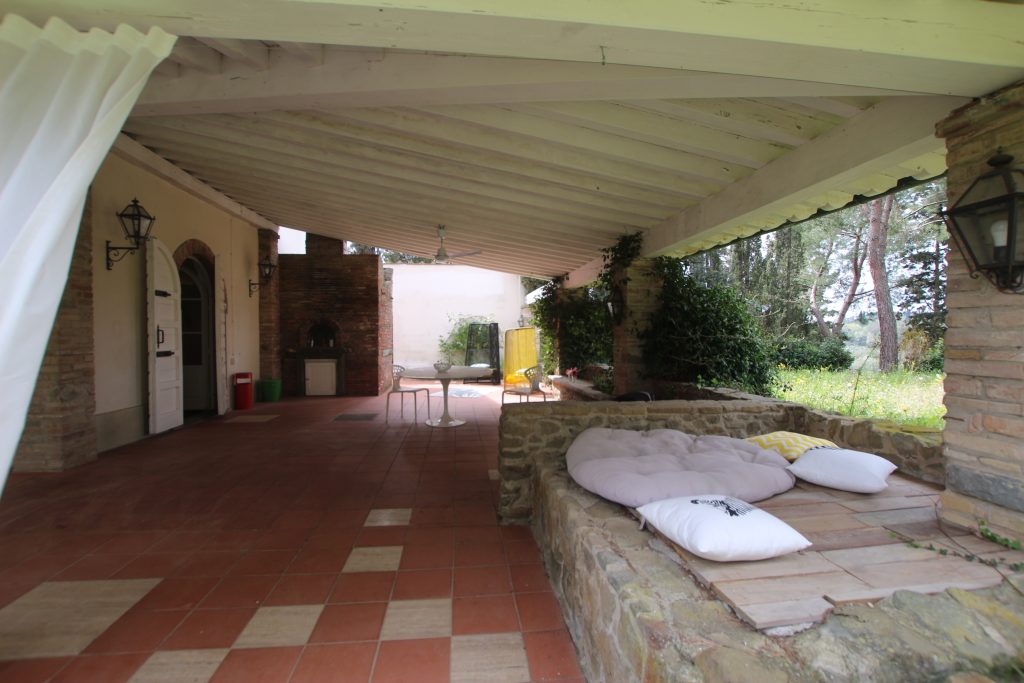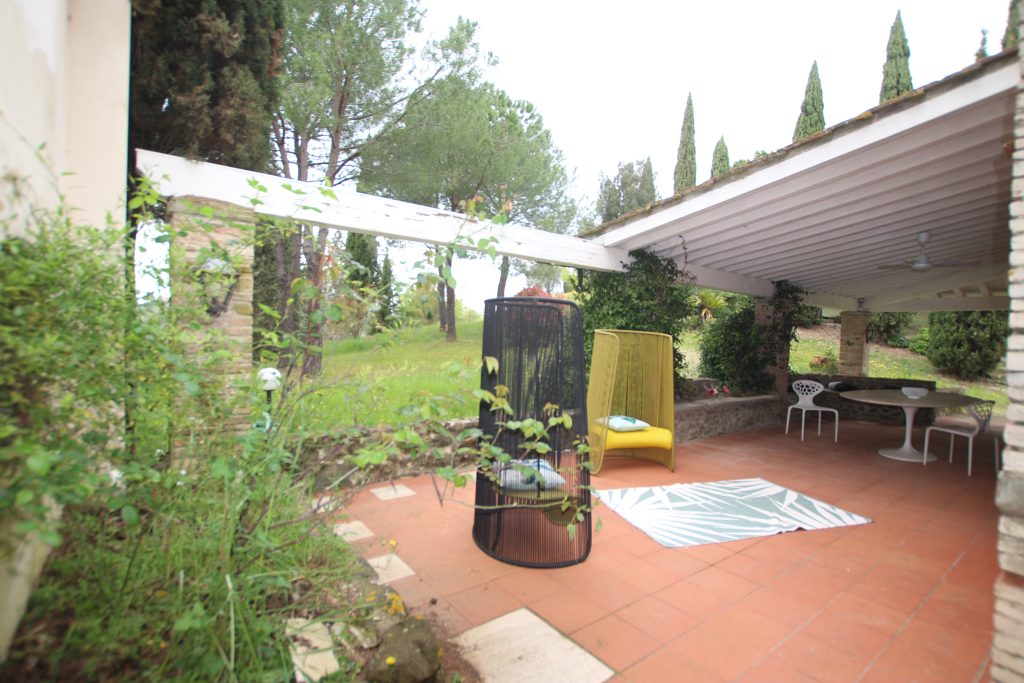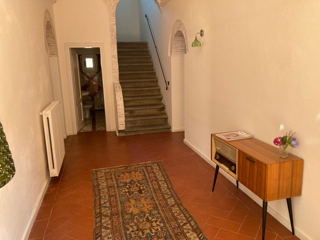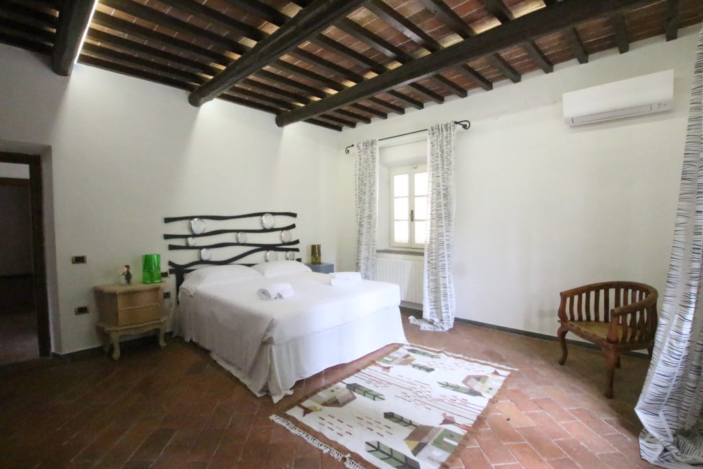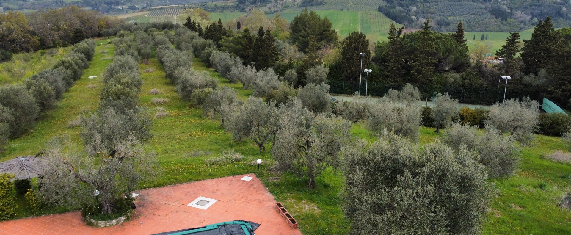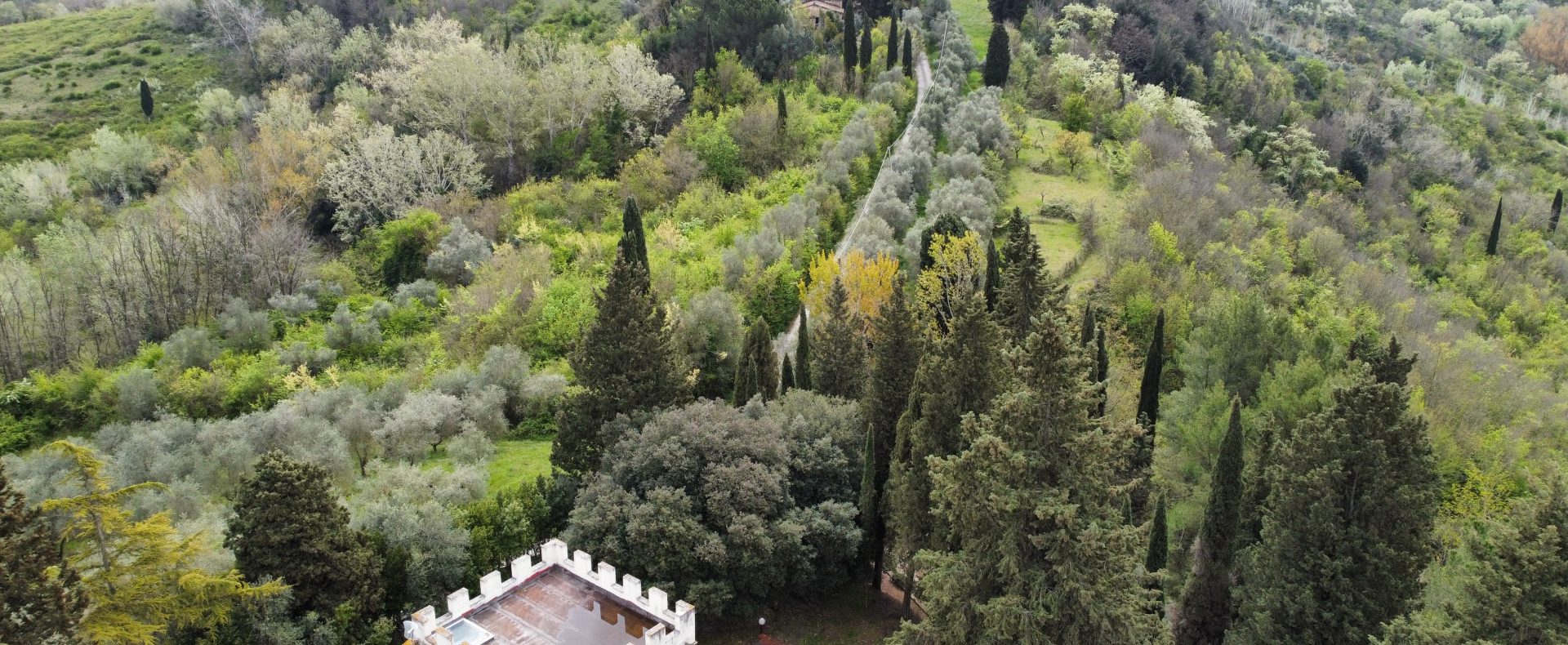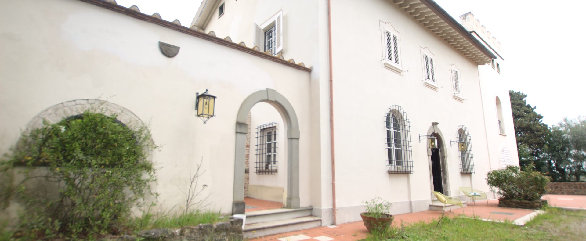 Villaen, som har blitt fullstendig og smakfullt renovert, er på 500 kvm på to etasjer og har et pittoresk tårn. Huset består av: stor gang, bred stue med peis, fullt utstyrt kjøkken med utgang til veranda, lesesal, bad, biljardrom og bod på bakkeplan. Innvendig trapp fører til første etasje som består av: et hovedsoverom med eget bad, 4 soverom og et bad til og tilgang til det sjarmerende panoramatårnet. Rommene er brede og lyse, badene er i marmor og alle renoveringer er utført med ekstremt høy kvalitet. Villaen ligger i en panoramisk beliggenhet, omgitt av 15 hektar tomt og nøyaktig: 5 hektar olivenlund, 5 hektar dyrkbar jord og vingård. Eiendommen kompletteres av et fantastisk svømmebasseng i en dominerende posisjon og en tennisbane som krever litt vedlikehold.
