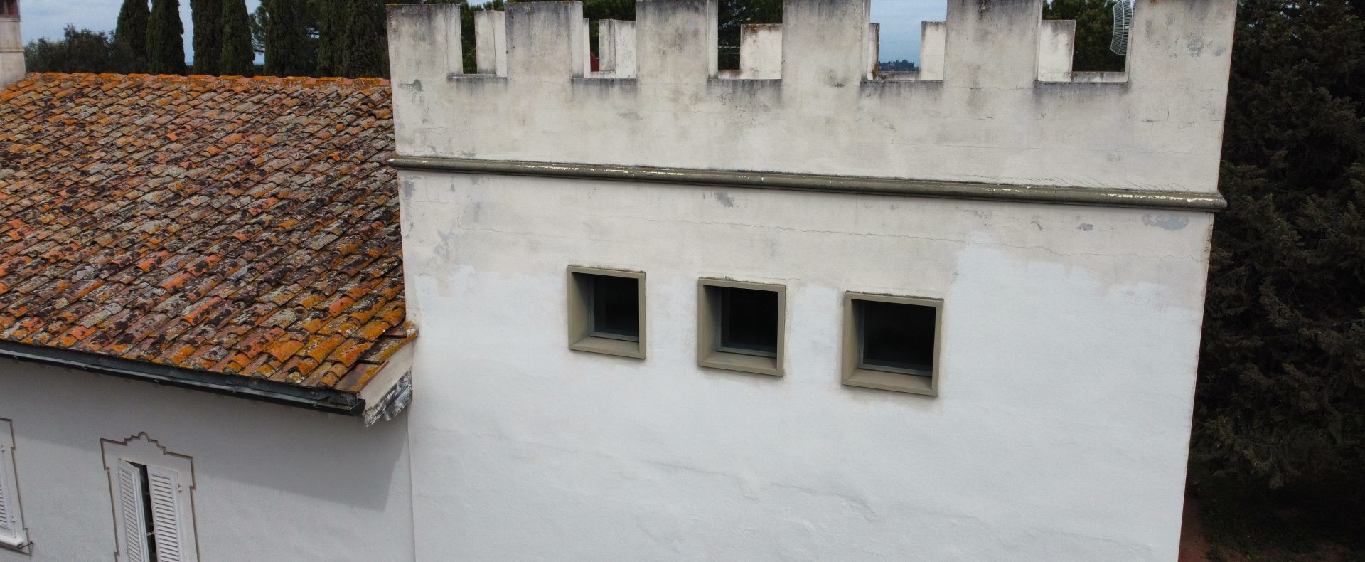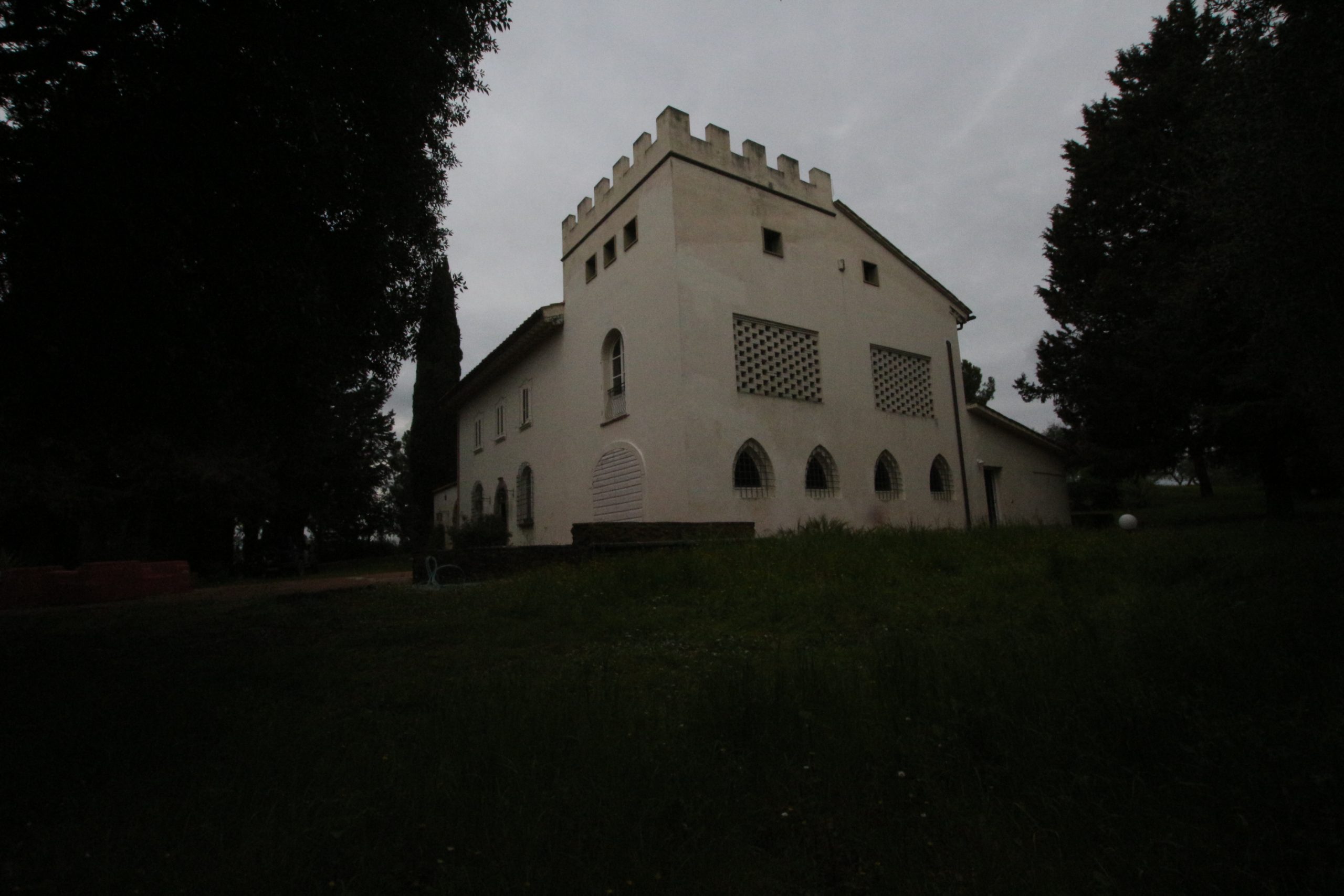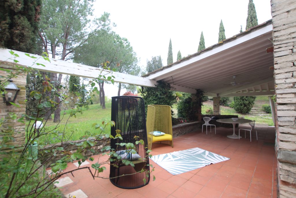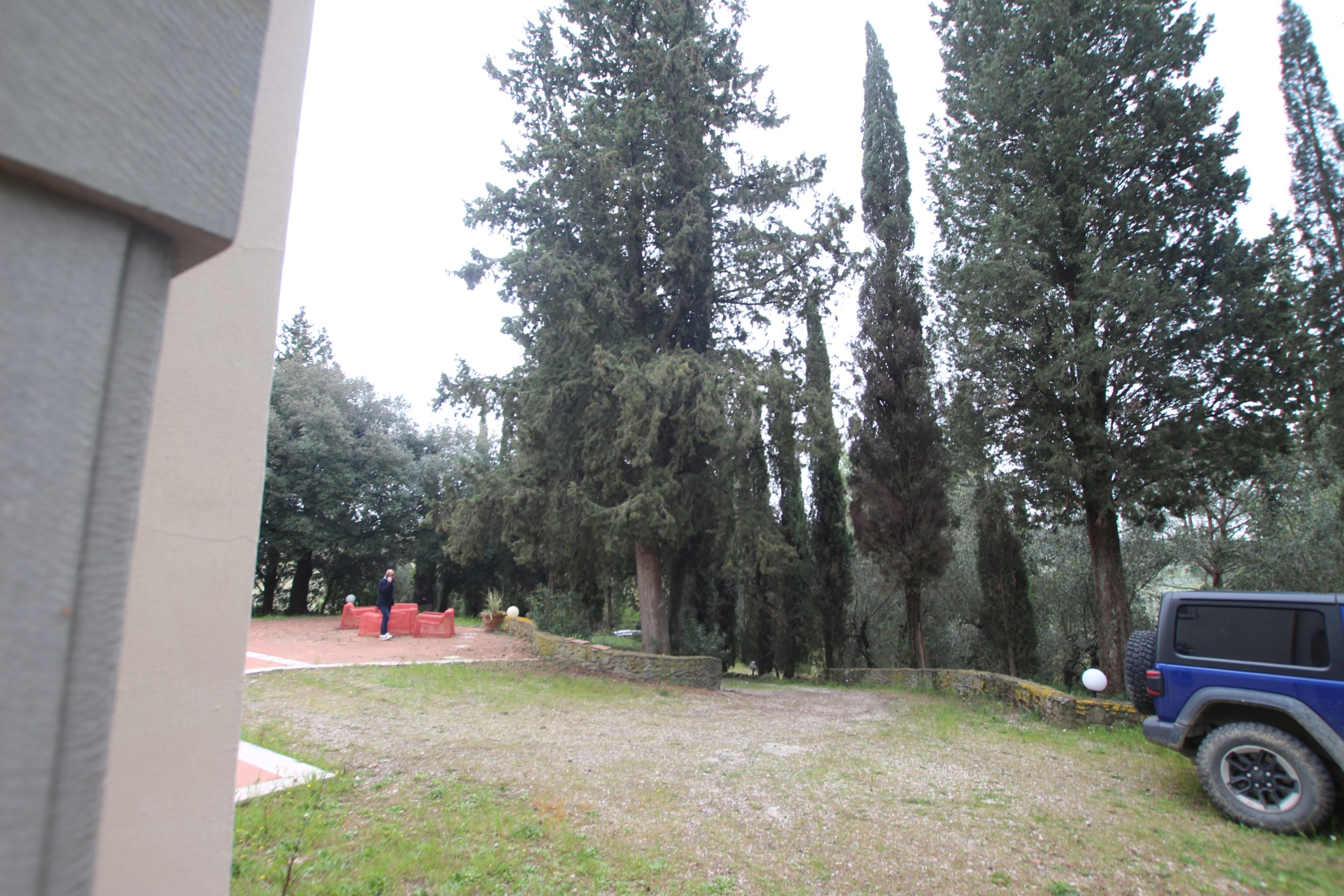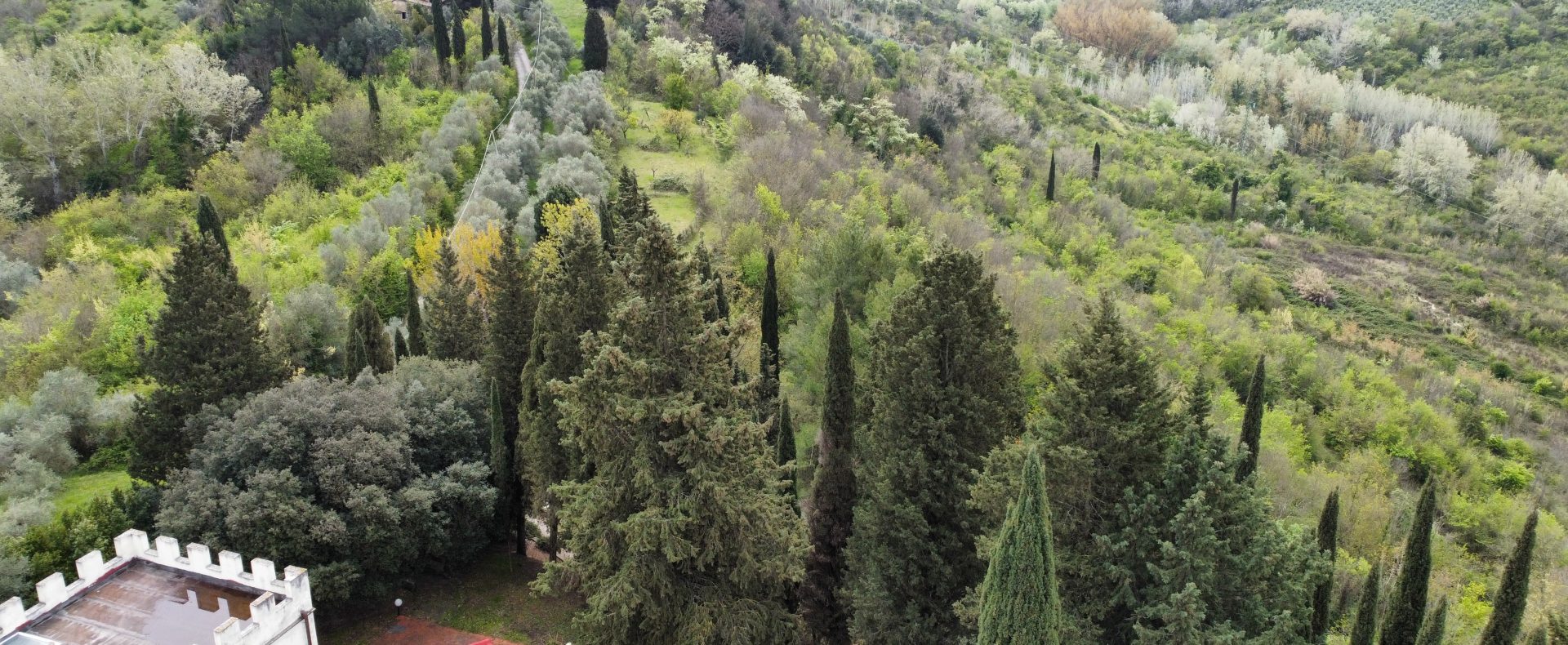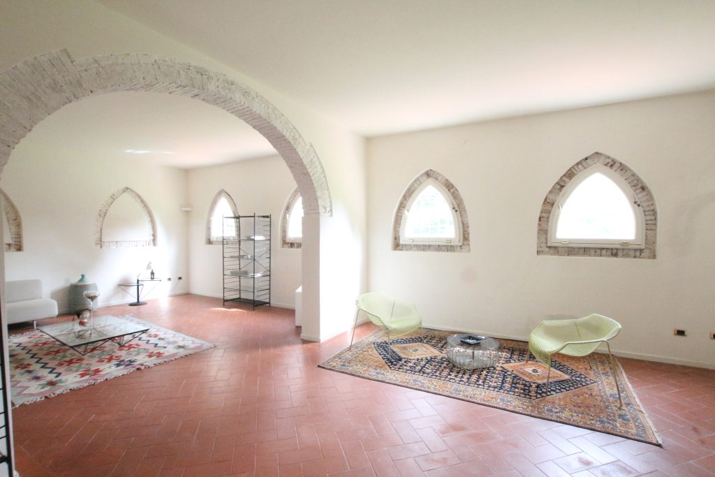 Villaen, som har blitt fullstendig og smakfullt renovert, er på 500 kvm på to etasjer og har et pittoresk tårn. Huset består av: stor gang, bred stue med peis, fullt utstyrt kjøkken med utgang til veranda, lesesal, bad, biljardrom og bod på bakkeplan. Innvendig trapp fører til første etasje som består av: et hovedsoverom med eget bad, 4 soverom og et bad til og tilgang til det sjarmerende panoramatårnet. Rommene er brede og lyse, badene er i marmor og alle renoveringer er utført med ekstremt høy kvalitet. Villaen ligger i en panoramisk beliggenhet, omgitt av 15 hektar tomt og nøyaktig: 5 hektar olivenlund, 5 hektar dyrkbar jord og vingård. Eiendommen kompletteres av et fantastisk svømmebasseng i en dominerende posisjon og en tennisbane som krever litt vedlikehold.