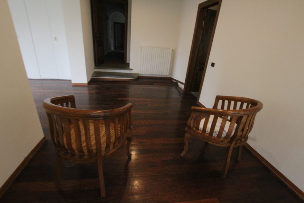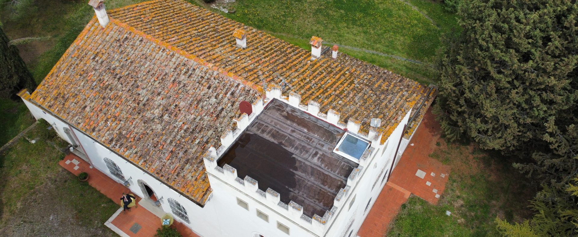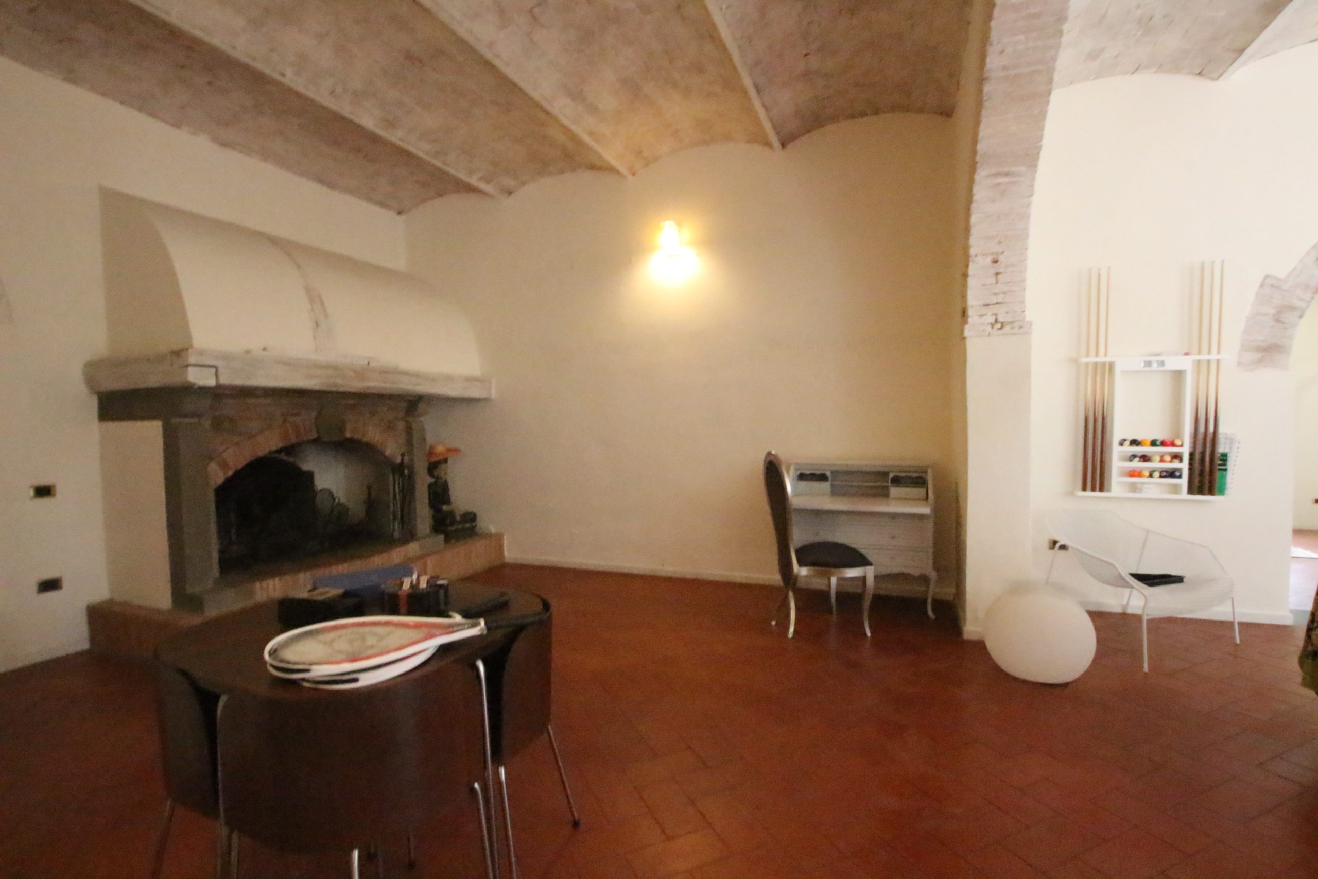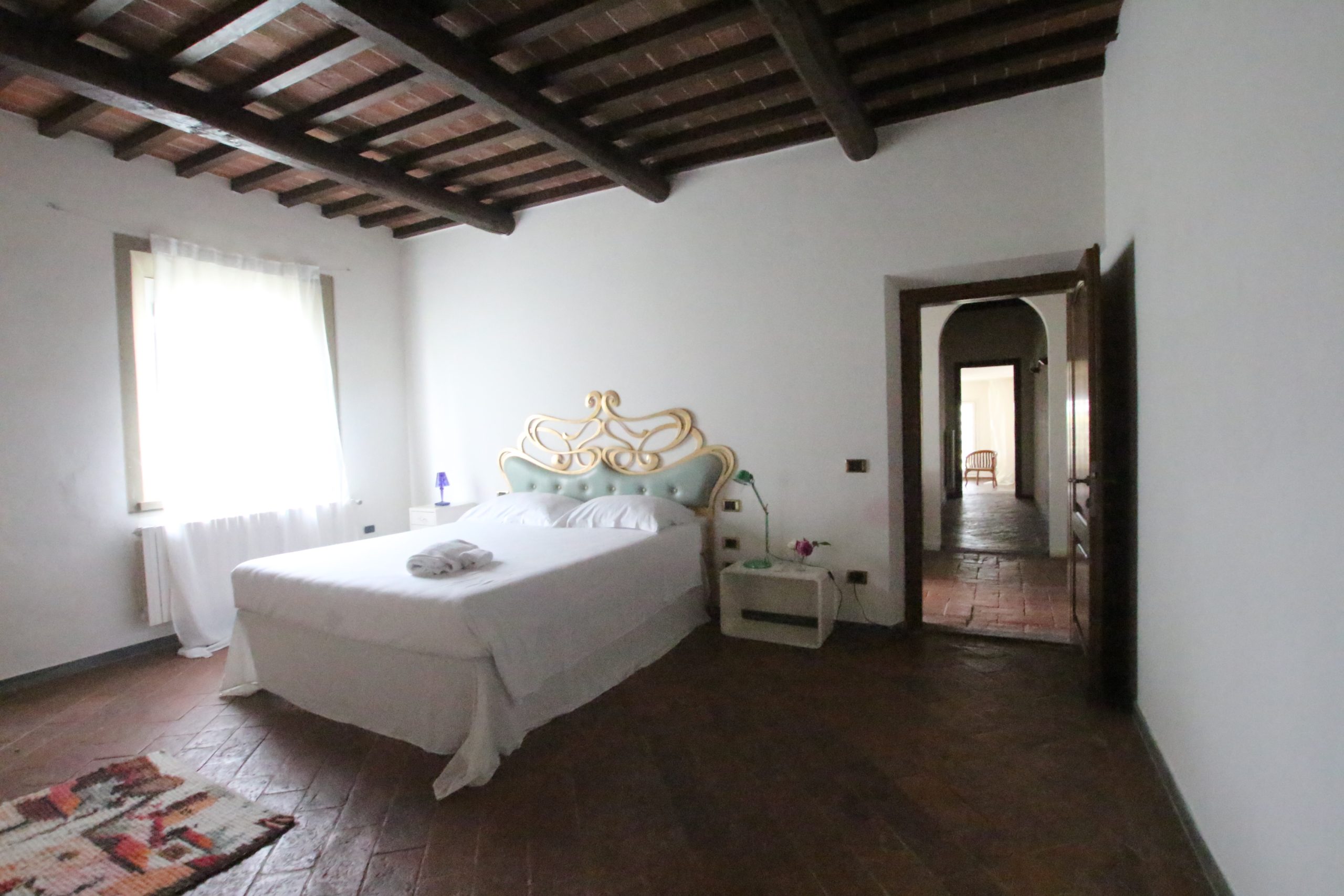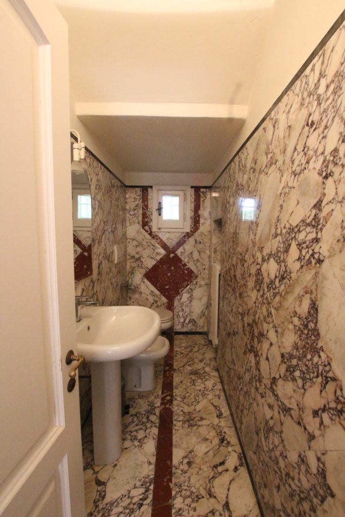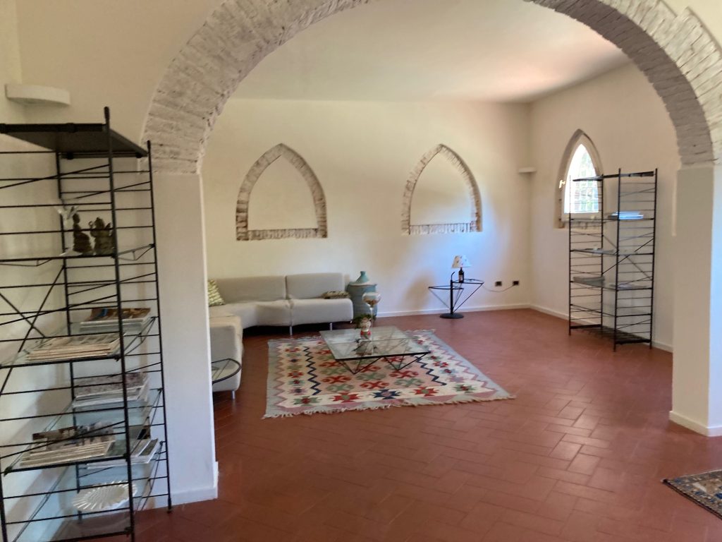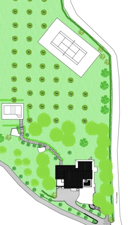 Villaen, som har blitt fullstendig og smakfullt renovert, er på 500 kvm på to etasjer og har et pittoresk tårn. Huset består av: stor gang, bred stue med peis, fullt utstyrt kjøkken med utgang til veranda, lesesal, bad, biljardrom og bod på bakkeplan. Innvendig trapp fører til første etasje som består av: et hovedsoverom med eget bad, 4 soverom og et bad til og tilgang til det sjarmerende panoramatårnet. Rommene er brede og lyse, badene er i marmor og alle renoveringer er utført med ekstremt høy kvalitet. Villaen ligger i en panoramisk beliggenhet, omgitt av 15 hektar tomt og nøyaktig: 5 hektar olivenlund, 5 hektar dyrkbar jord og vingård. Eiendommen kompletteres av et fantastisk svømmebasseng i en dominerende posisjon og en tennisbane som krever litt vedlikehold.