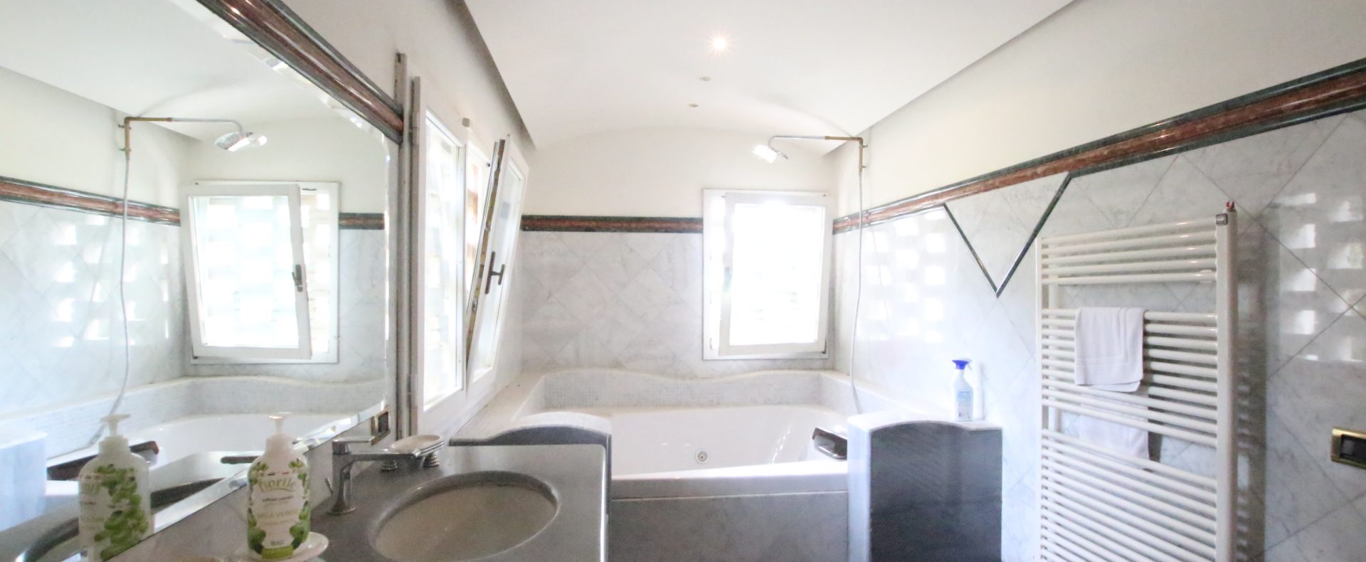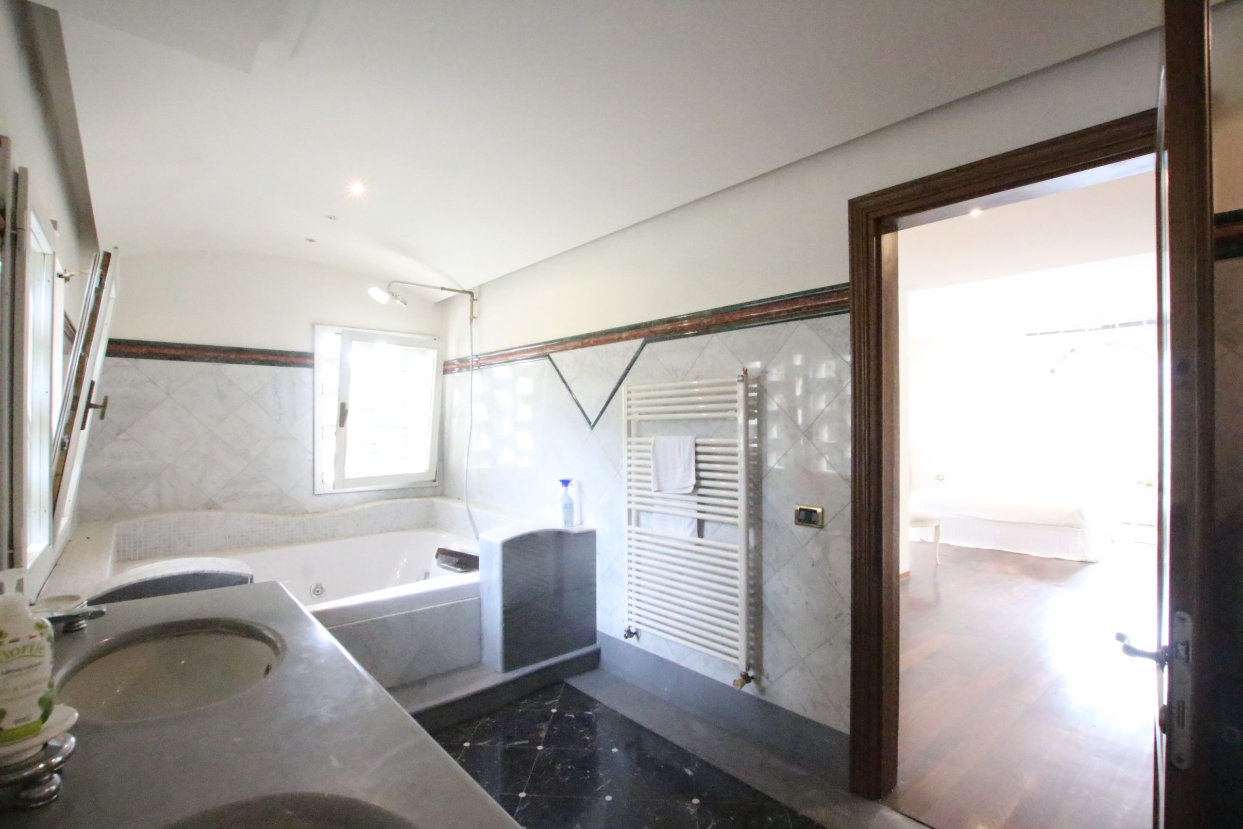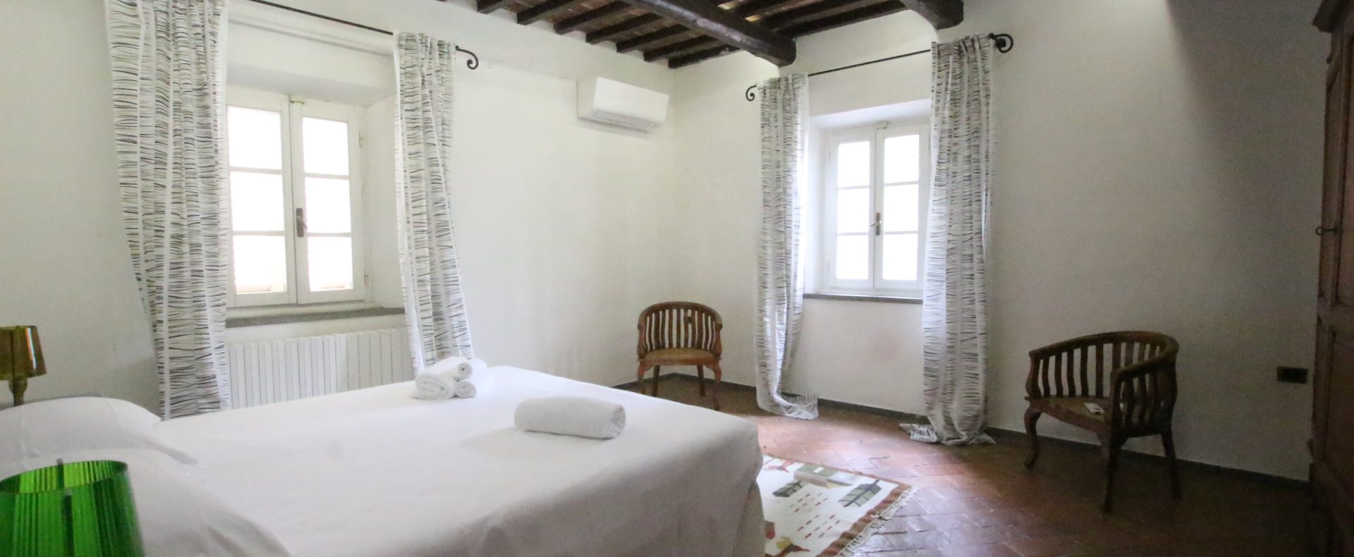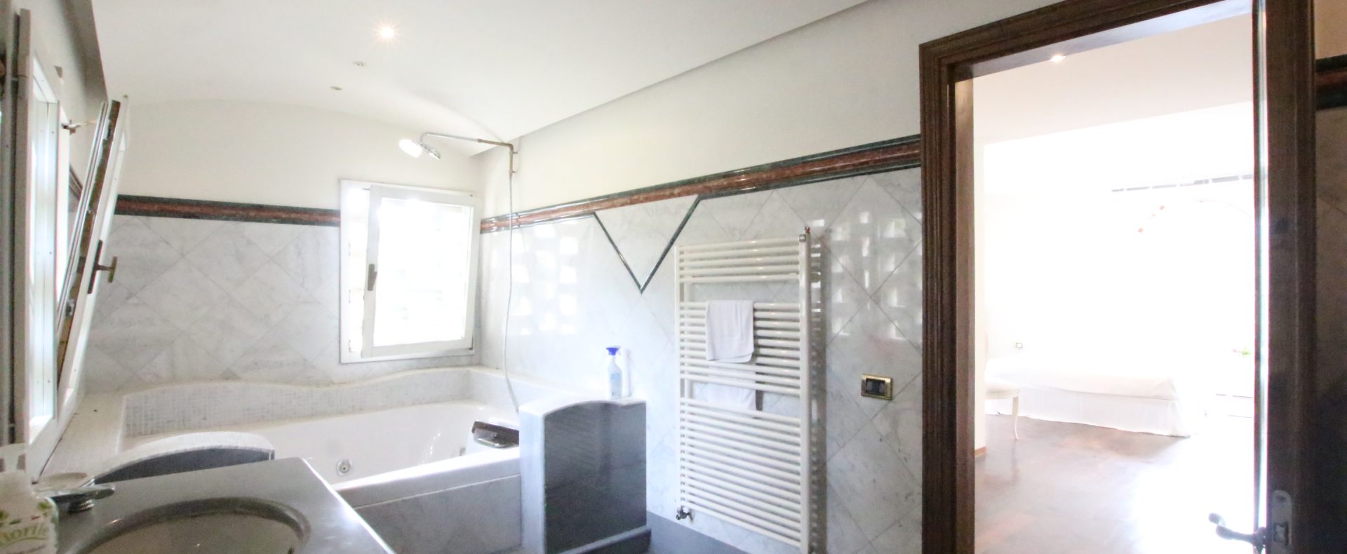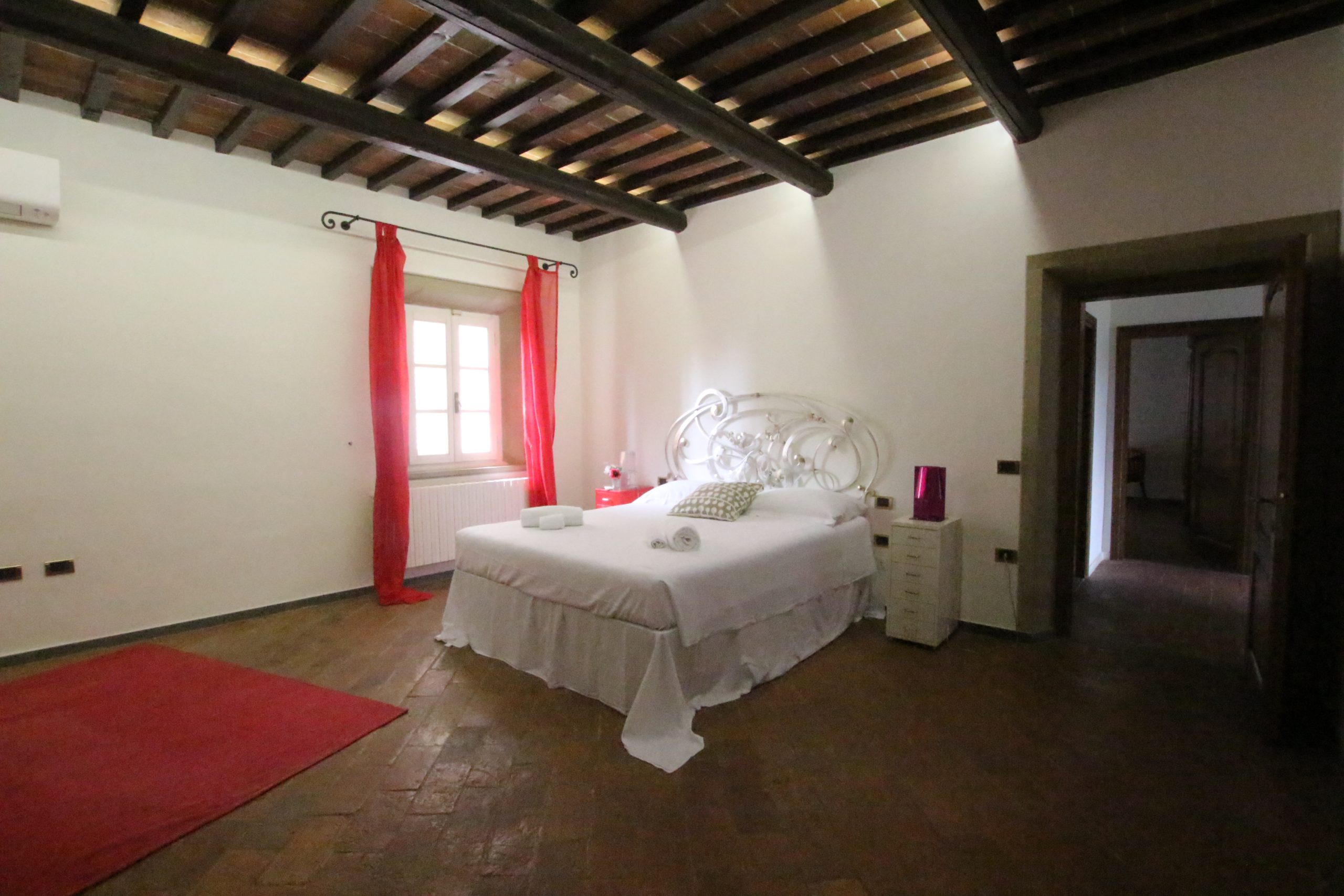 Villaen, som har blitt fullstendig og smakfullt renovert, er på 500 kvm på to etasjer og har et pittoresk tårn. Huset består av: stor gang, bred stue med peis, fullt utstyrt kjøkken med utgang til veranda, lesesal, bad, biljardrom og bod på bakkeplan. Innvendig trapp fører til første etasje som består av: et hovedsoverom med eget bad, 4 soverom og et bad til og tilgang til det sjarmerende panoramatårnet. Rommene er brede og lyse, badene er i marmor og alle renoveringer er utført med ekstremt høy kvalitet. Villaen ligger i en panoramisk beliggenhet, omgitt av 15 hektar tomt og nøyaktig: 5 hektar olivenlund, 5 hektar dyrkbar jord og vingård. Eiendommen kompletteres av et fantastisk svømmebasseng i en dominerende posisjon og en tennisbane som krever litt vedlikehold.