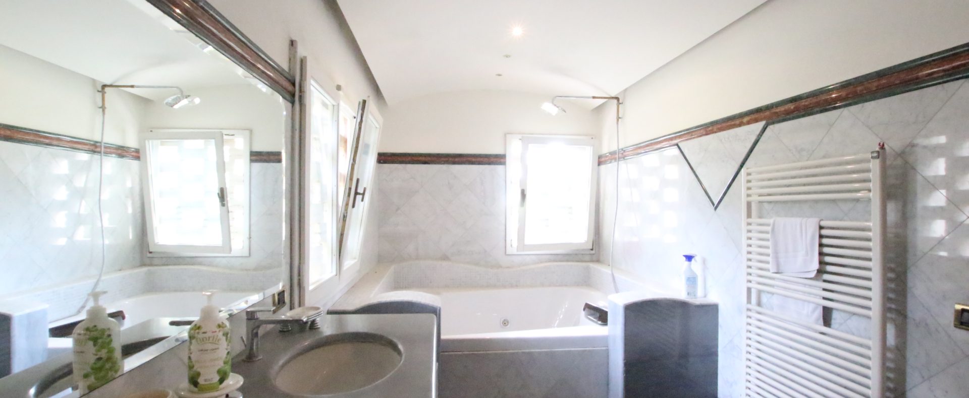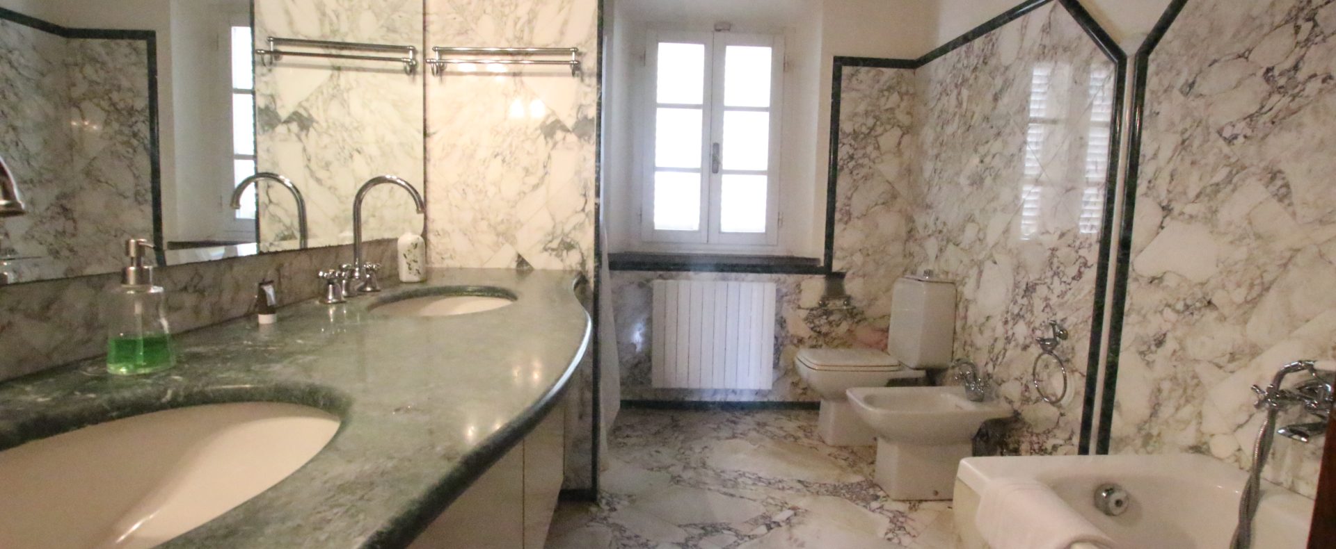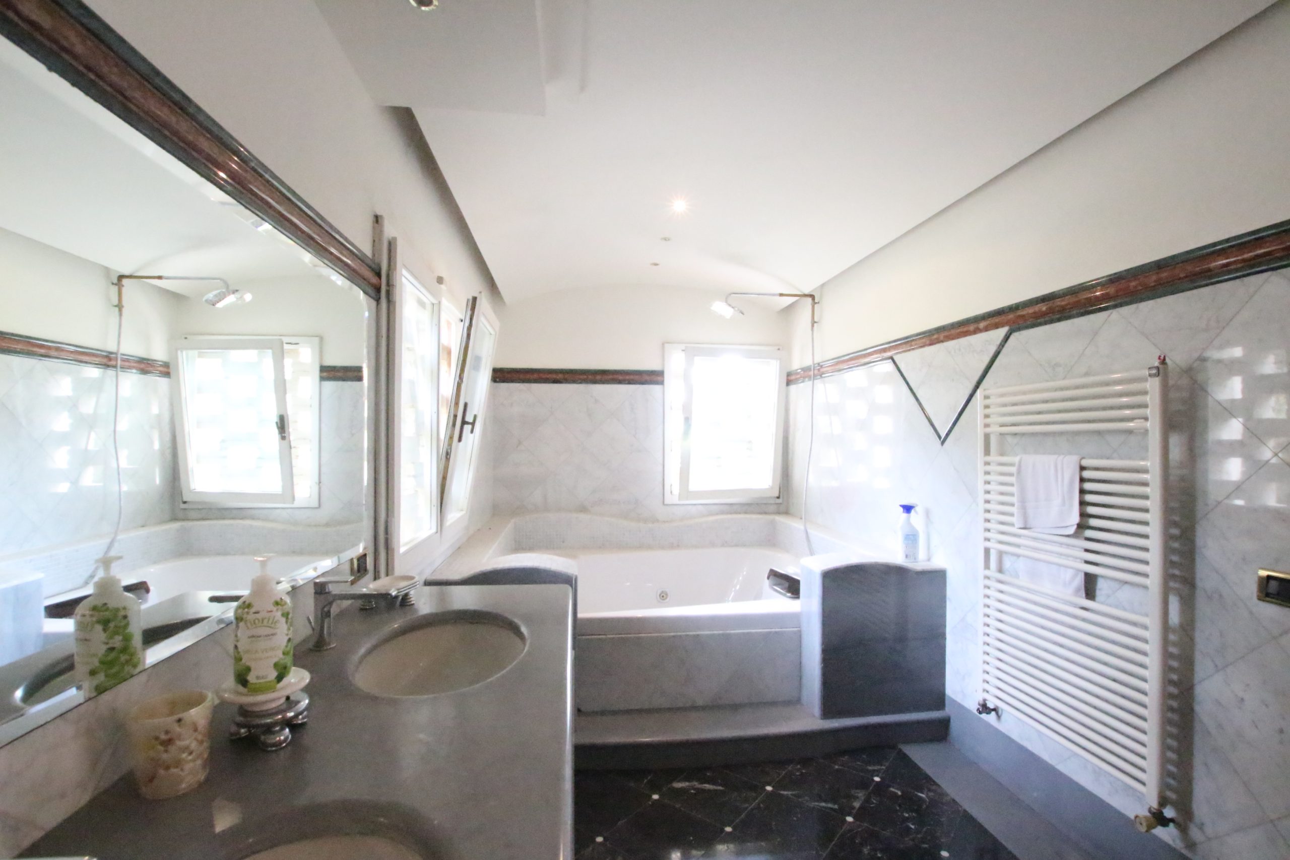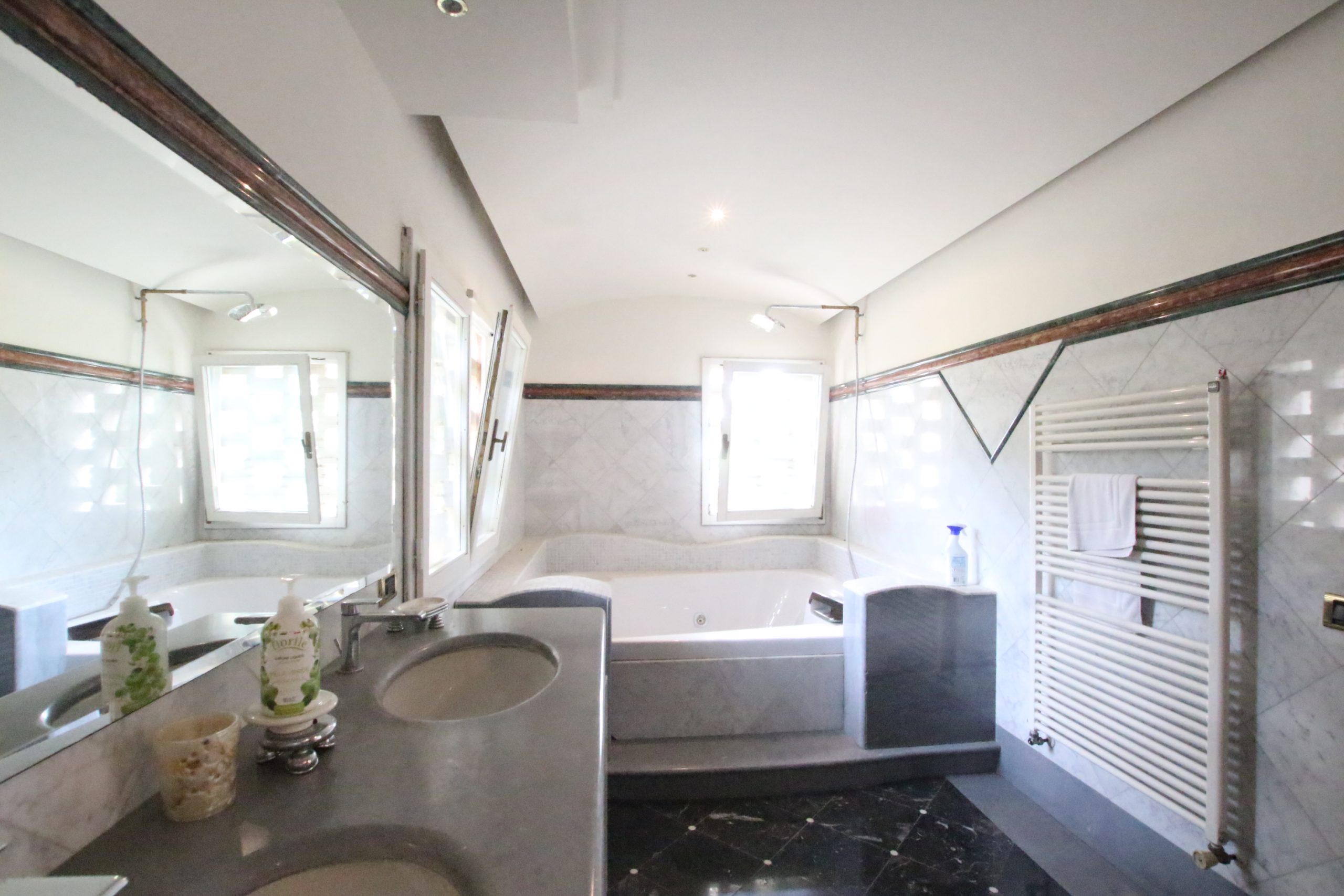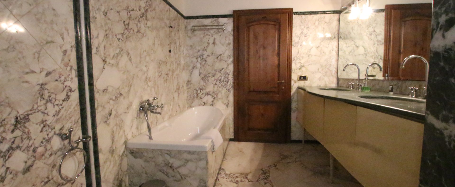 Villaen, som har blitt fullstendig og smakfullt renovert, er på 500 kvm på to etasjer og har et pittoresk tårn. Huset består av: stor gang, bred stue med peis, fullt utstyrt kjøkken med utgang til veranda, lesesal, bad, biljardrom og bod på bakkeplan. Innvendig trapp fører til første etasje som består av: et hovedsoverom med eget bad, 4 soverom og et bad til og tilgang til det sjarmerende panoramatårnet. Rommene er brede og lyse, badene er i marmor og alle renoveringer er utført med ekstremt høy kvalitet. Villaen ligger i en panoramisk beliggenhet, omgitt av 15 hektar tomt og nøyaktig: 5 hektar olivenlund, 5 hektar dyrkbar jord og vingård. Eiendommen kompletteres av et fantastisk svømmebasseng i en dominerende posisjon og en tennisbane som krever litt vedlikehold.