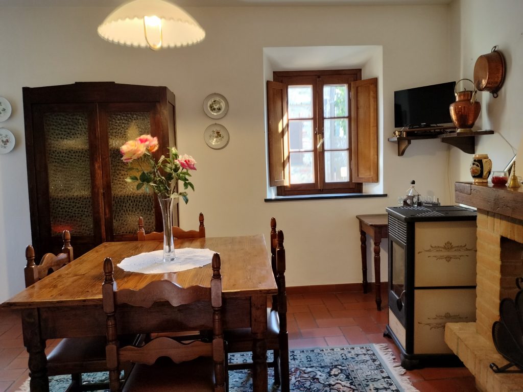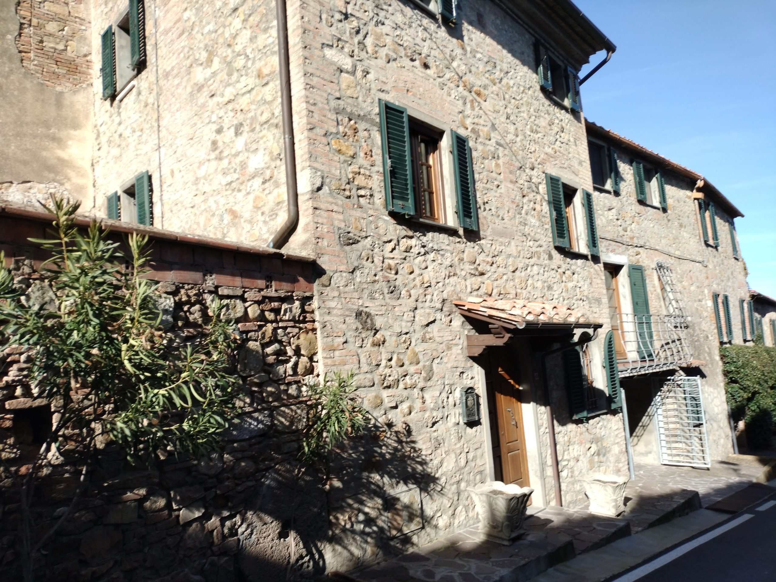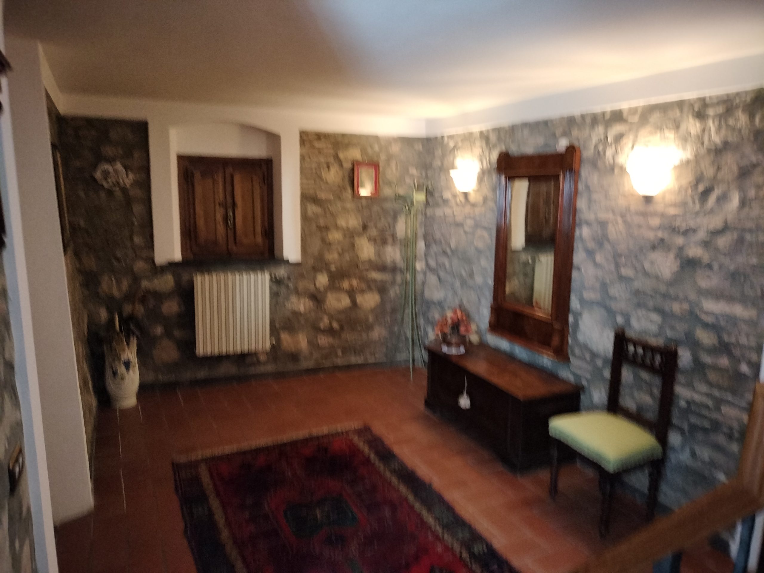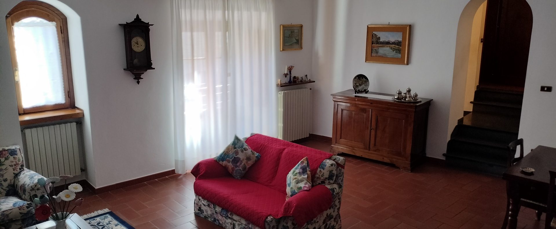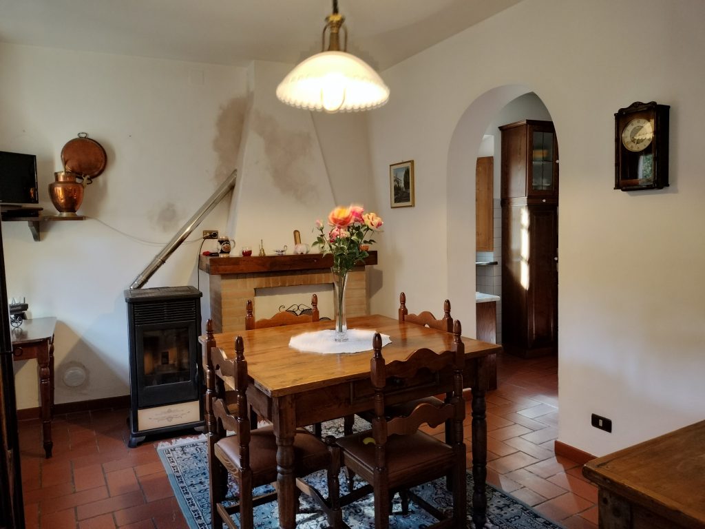 Ypperlig renovert 300 kvm treetasjes rekkehus til salgs beliggende i den pittoreske middelalderlandsbyen Orciatico, i Lajatico kommune. Denne pittoreske lille byen i Toscana er godt kjent av mange som hjemmet til Andrea Bocelli, hvor sangeren hvert år har sine lyriske konserter på det omtalte Stillhetens Teater, et åpent naturlig amfiteater hvor det er mulig å beundre en 360° fantastisk panoramautsikt rundt de omkringliggende åsene og over Volterra by. Lajatico tilbyr alle nødvendige tjenester som bank, postkontor, apotek, dagligvarer, restauranter, barer, lege og andre butikker. Landsbyen ligger kun 45 minutters kjøring fra Pisa internasjonale flyplass samt fra de nærmeste strendene; 20 minutters kjøring fra motorveien og jernbanestasjonen, 10 minutter fra større supermarkeder, 25 minutter fra den etruskiske byen Volterra, 40 minutter fra pittoreske San Gimignano og på halvannen time er det mulig å nå de mest attraktive byene i Toscana som Firenze, Siena og Lucca. Landsbyen Orciatico er en ekte juvel, og den tilbyr en bar og en liten dagligvare. Rekkehuset er tilgjengelig gjennom en gang med god størrelse med synlige steiner på veggene og trapper som fører til første etasje som består av: på venstre side et kjøkken/spisestue med pelletsovn installert inne i en peis, til høyre side er det en utrolig stor stue med vedfyrt peis og en balkong som vender mot landsbygaten og et første soverom med terrasse.