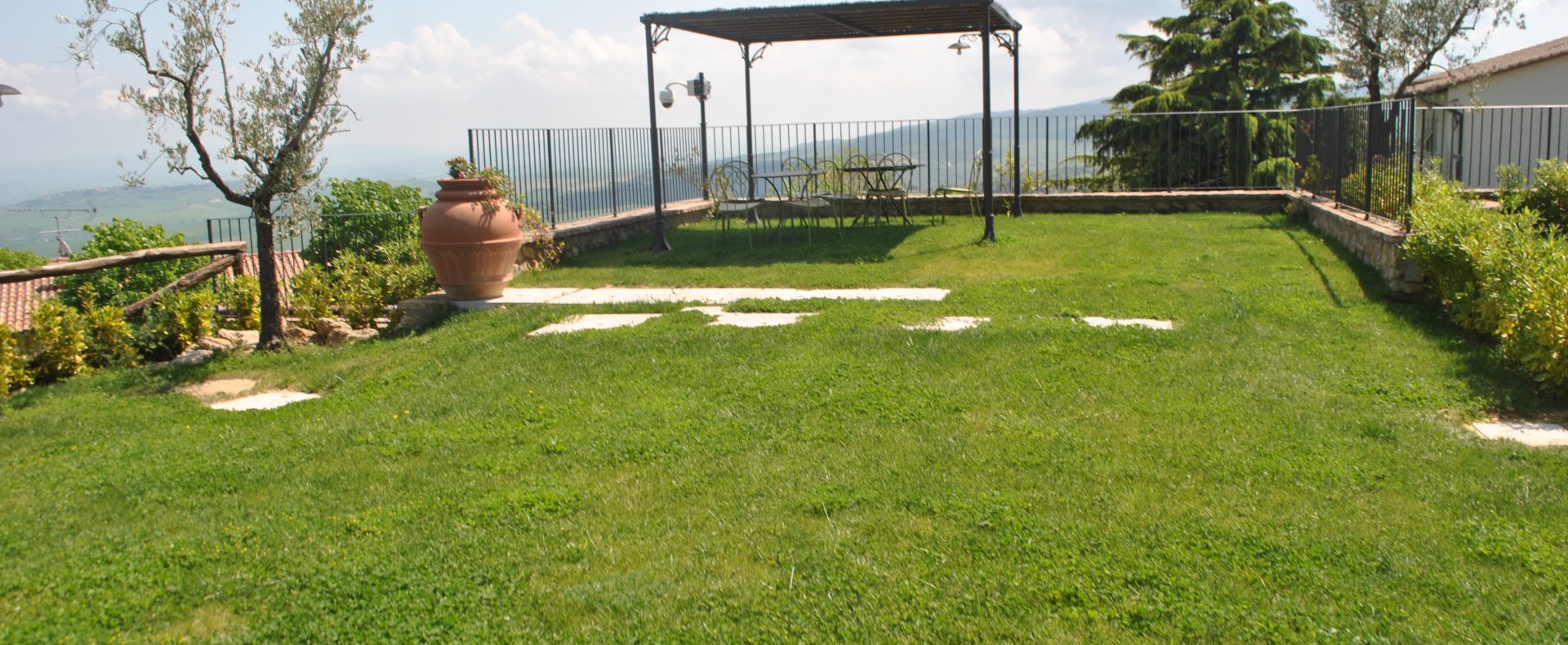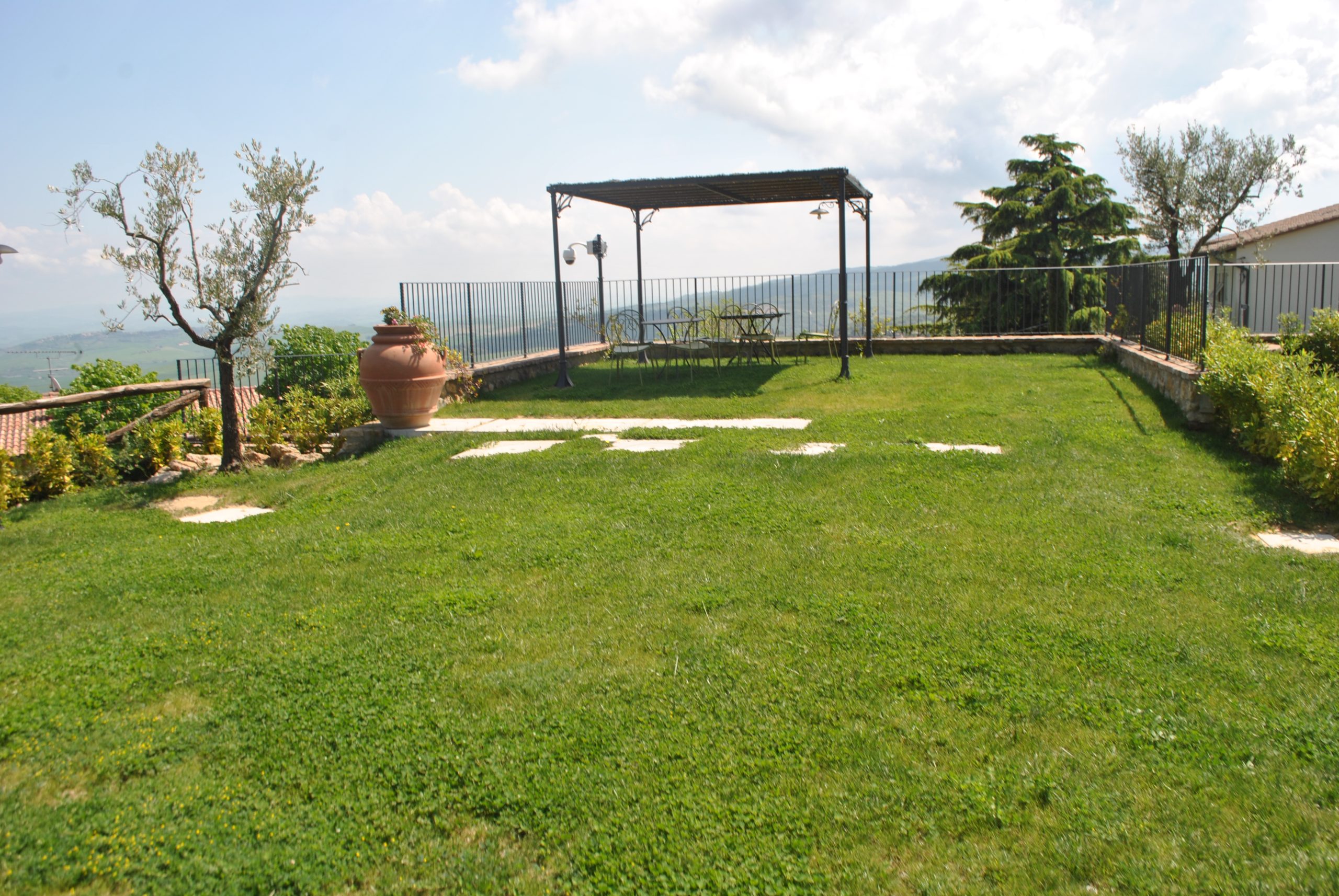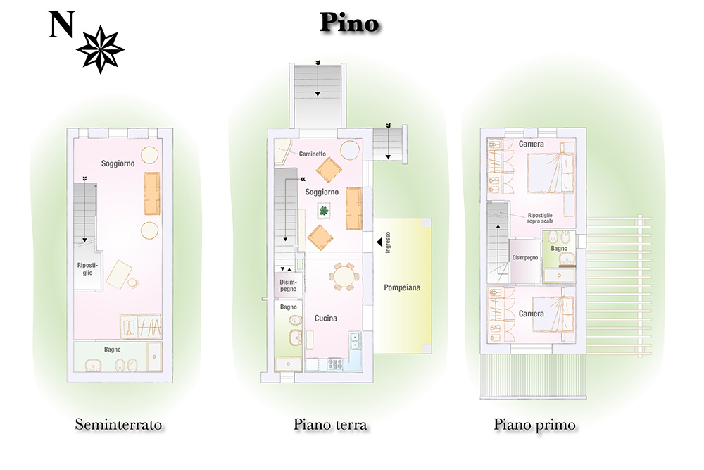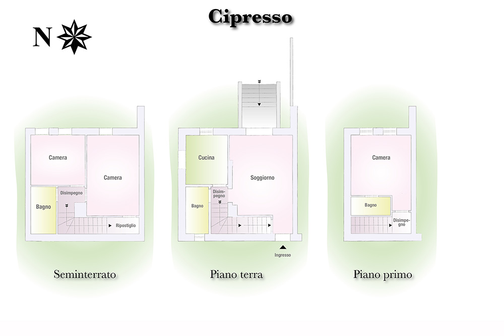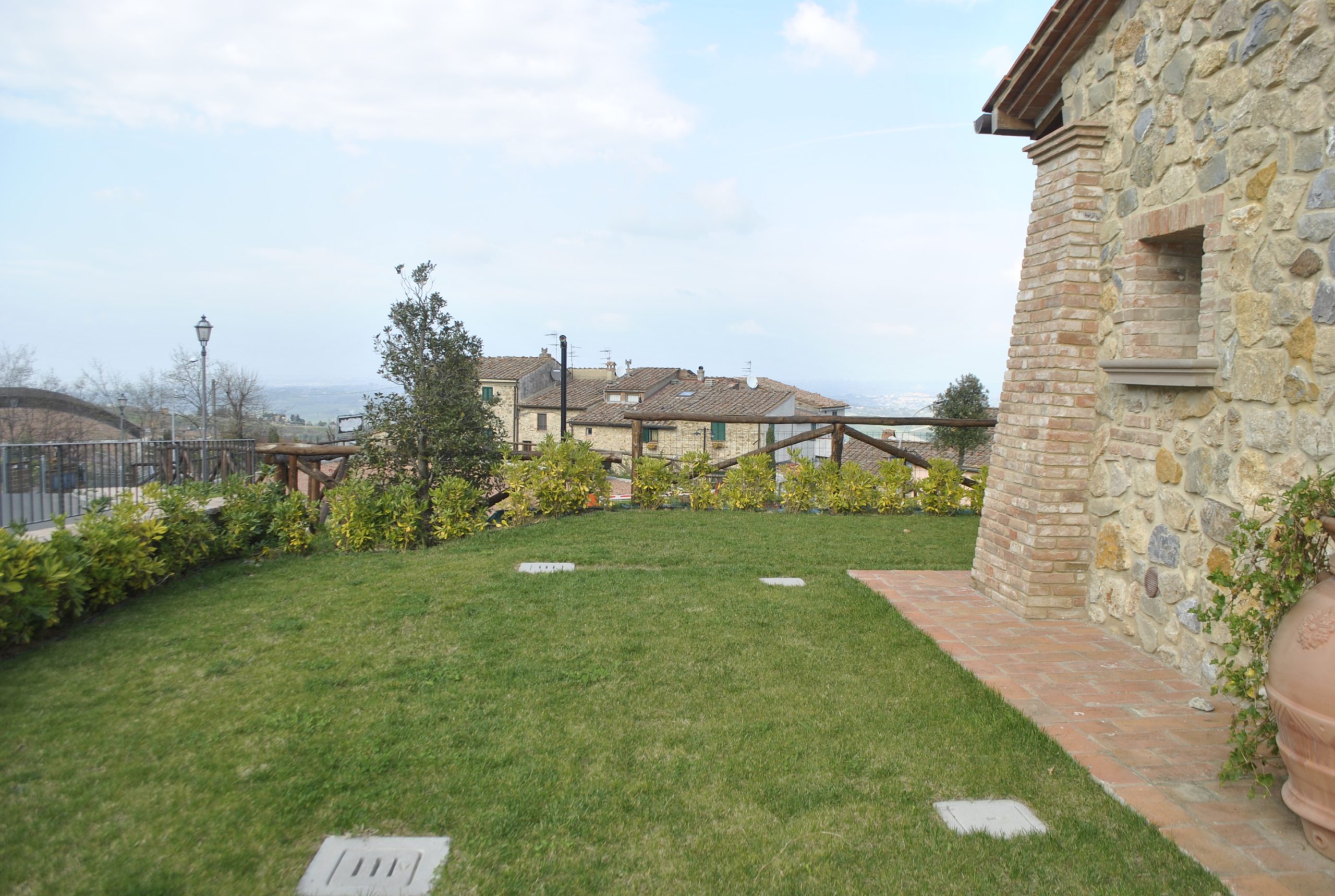 Tomannsbolig med individuell adkomst over to etasjer i tillegg til kjeller. Inkluderer to soverom, tre bad, stor stue og separat spisekjøkken. Leiligheten har en privat hage med tilgang til den offentlige parken og en terrasse med utsikt over Volterra-åsene. Plassene er organisert slik at det er stue med peis, tilstøtende spisekjøkken og lite bad på bakkeplan. I første etasje er det to doble soverom og et stort bad med vindu. Kjelleren inkluderer et lite avslapningsområde, et praktisk oppbevaringsskap under trappen og et bad. Prisantydning: 590.000,00 €