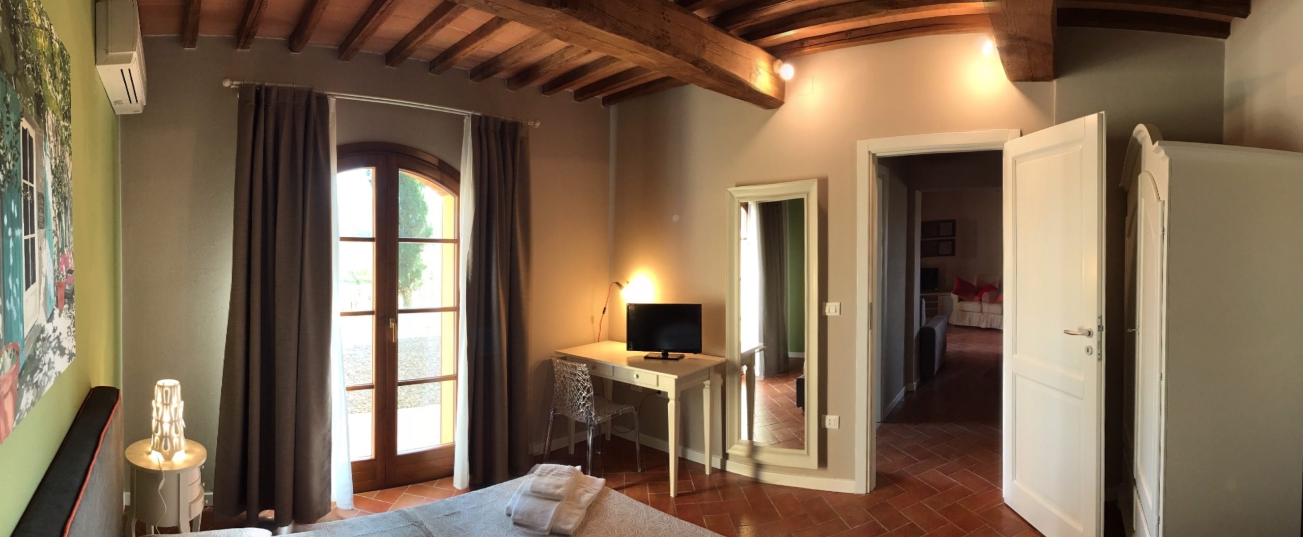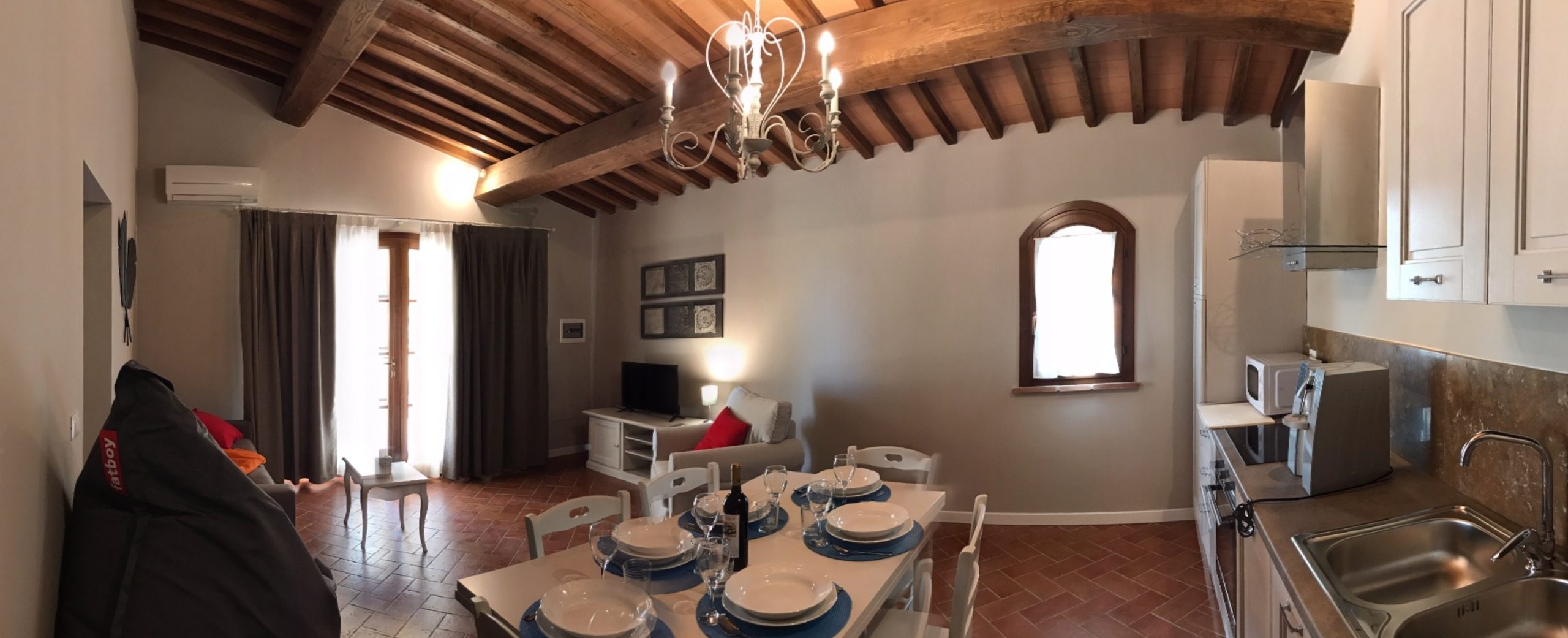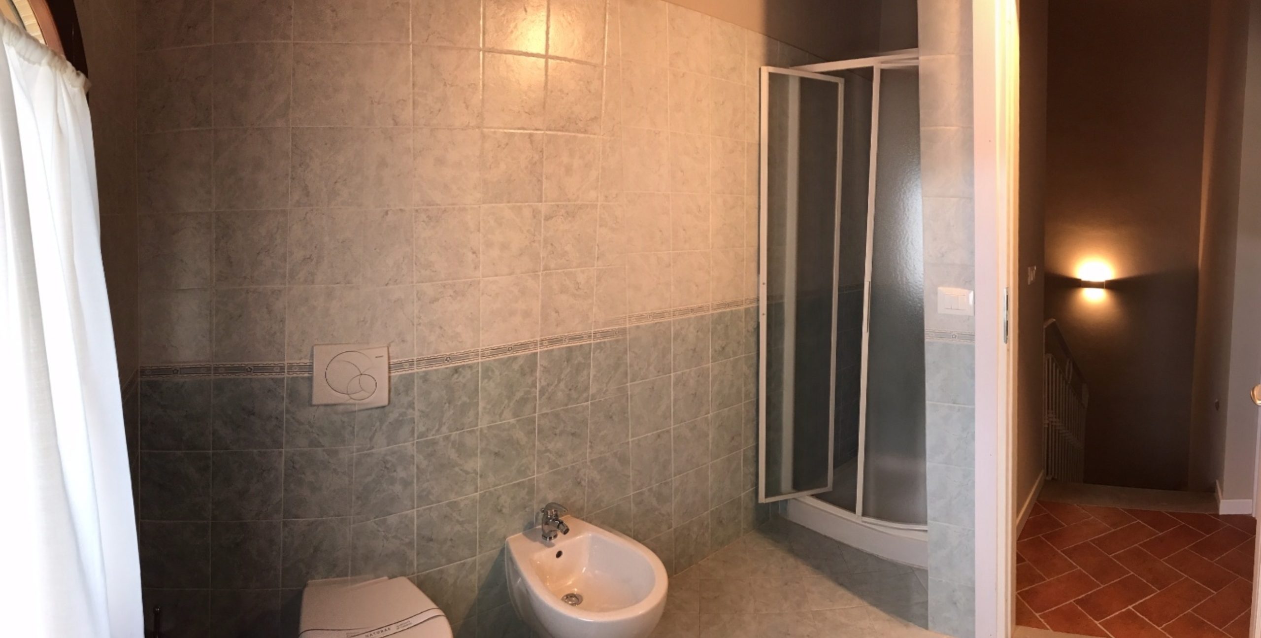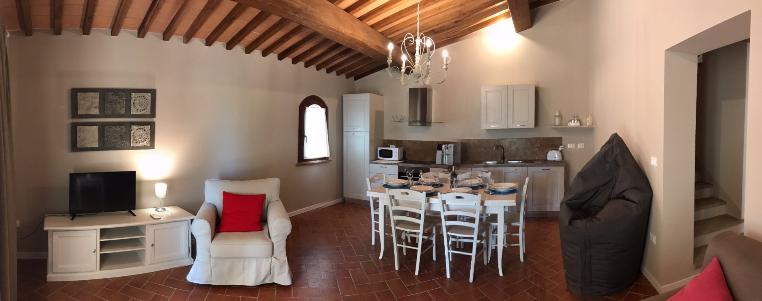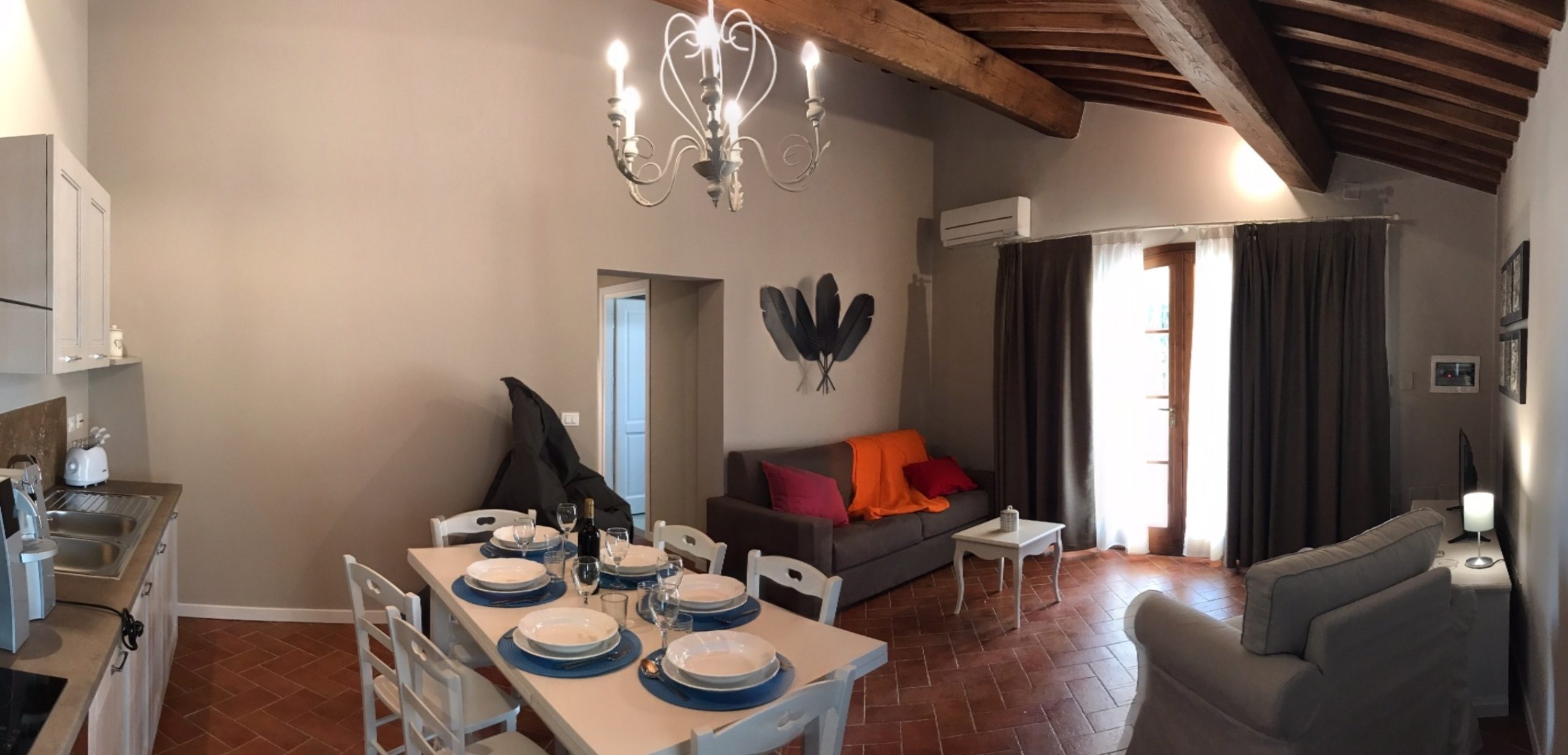 Første etasje består av et utstyrt kjøkken (kjøleskap/fryser, mikrobølgeovn, ovn med fire brennere, servise, spisebord og stoler), en stor stue med en dobbel sovesofa og et dobbelt soverom med en ekstra enkeltseng, hvorfra det er mulig å få tilgang til utsiden. I første etasje finner du også et bad med dusj, bidet og toalett. En trapp fører til andre etasje, hvor det er et dobbeltrom med en ekstra enkeltseng og et bad med dusj, bidet og toalett.