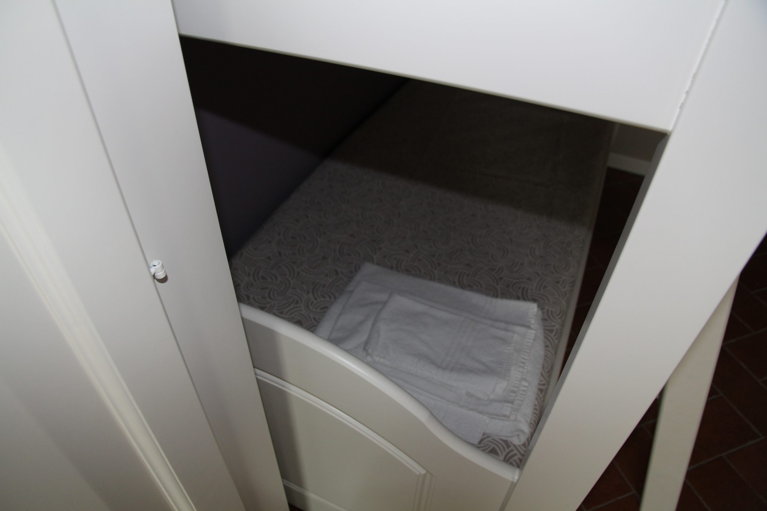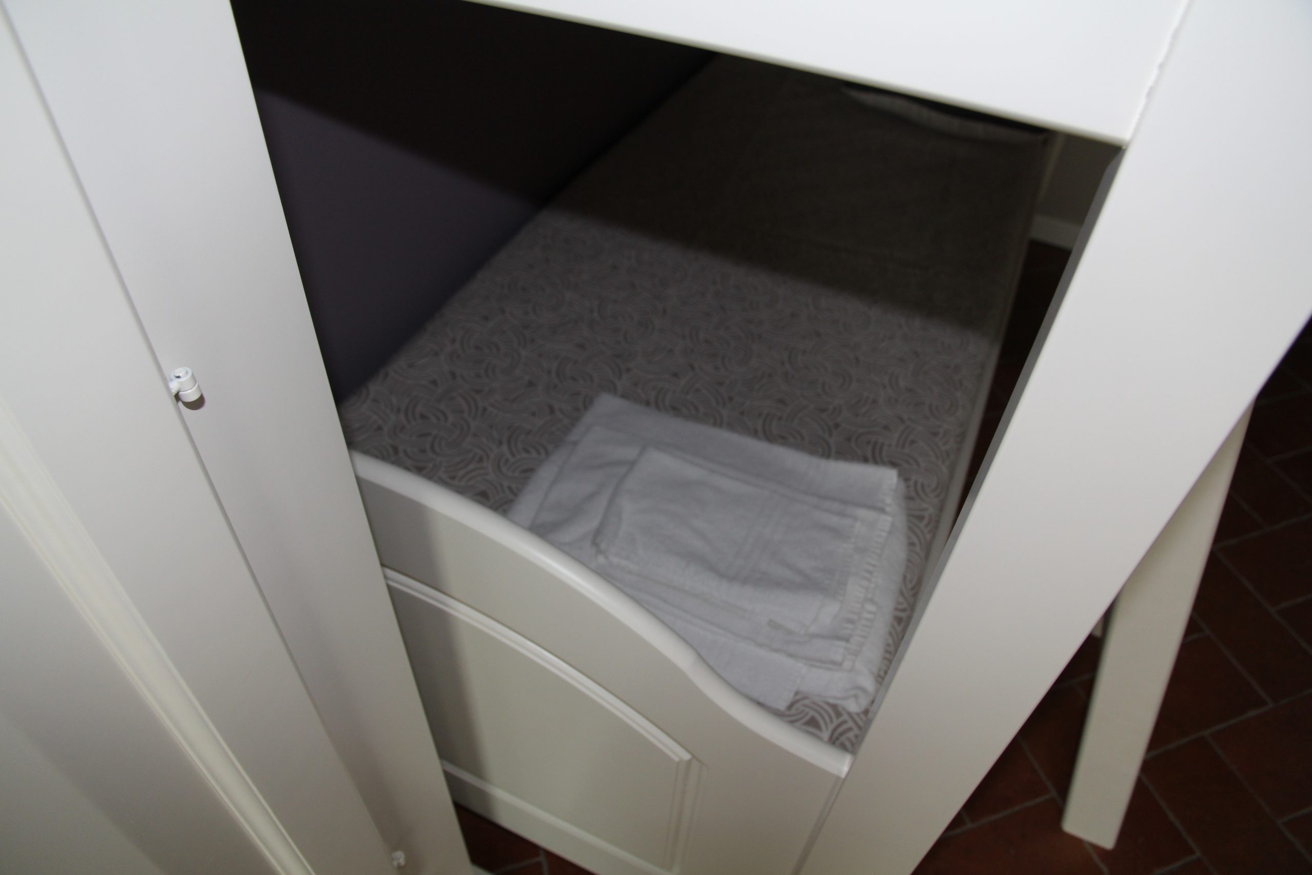 Første etasje består av et stort utstyrt kjøkken (kjøleskap/fryser, mikrobølgeovn, ovn med fire brennere, servise, spisebord og stoler), en stor stue med to sofaer, hvorav den ene er en dobbel sovesofa, og et bad. En trapp fører til andre etasje, hvor det er et dobbelt soverom og et soverom med køyesenger.