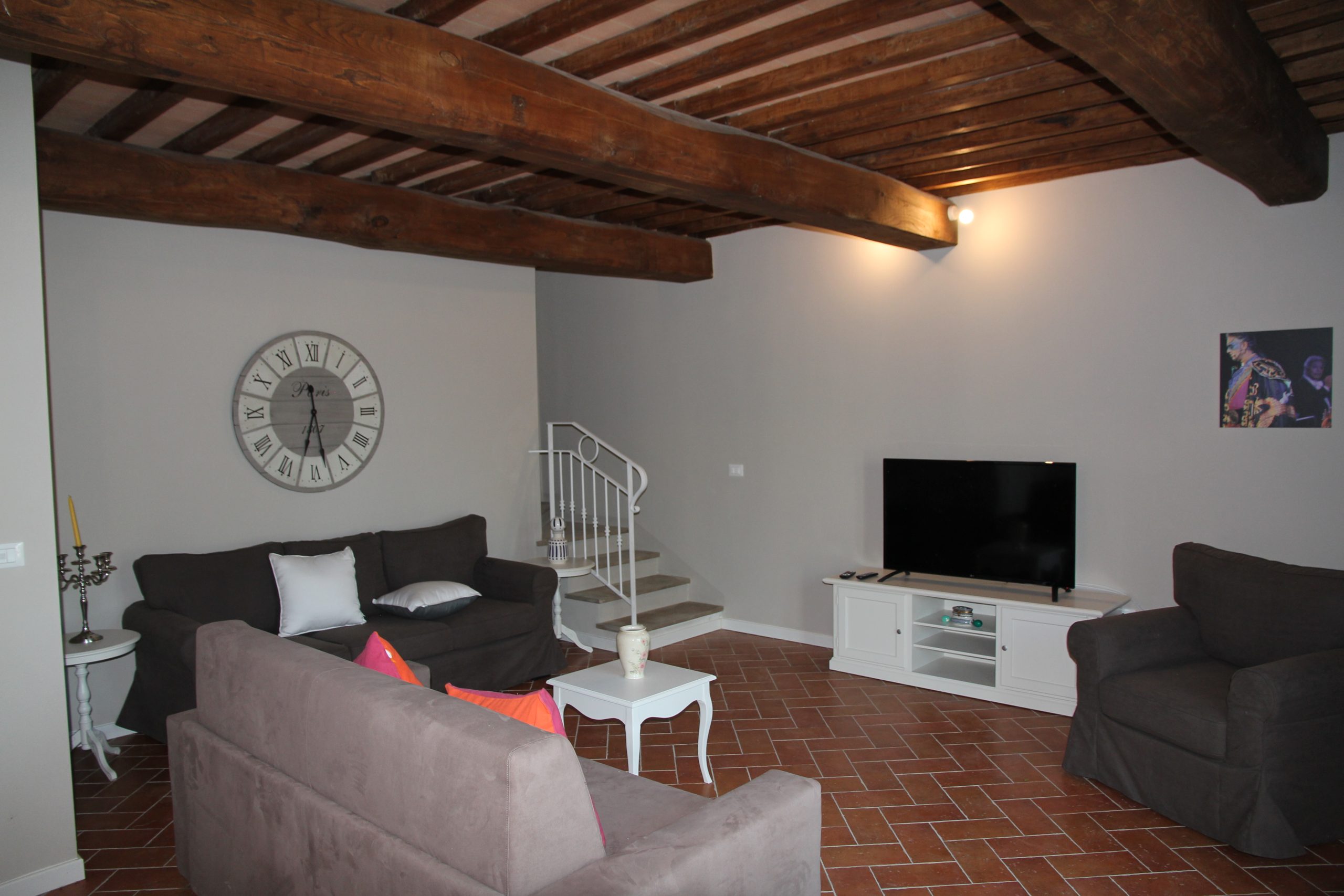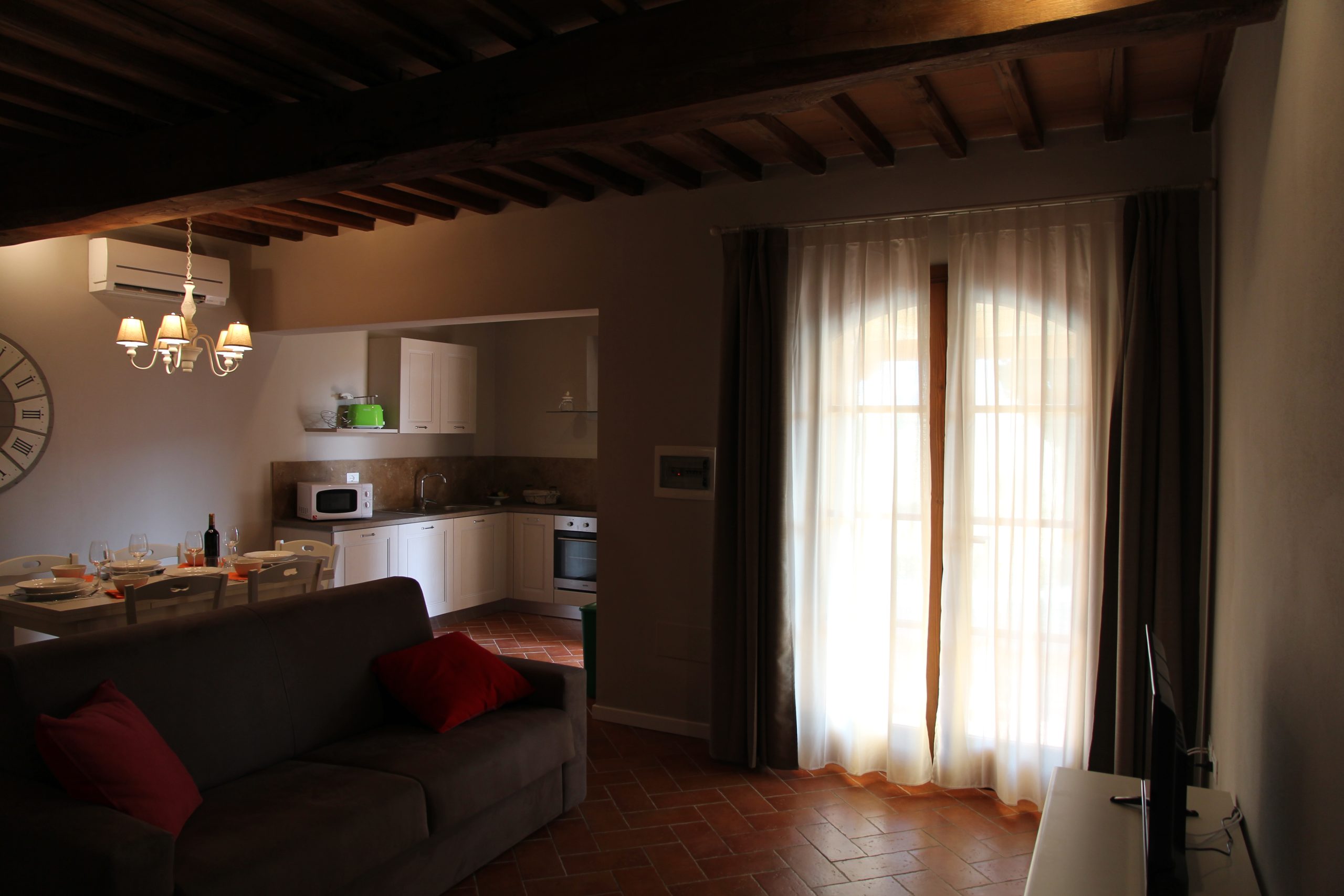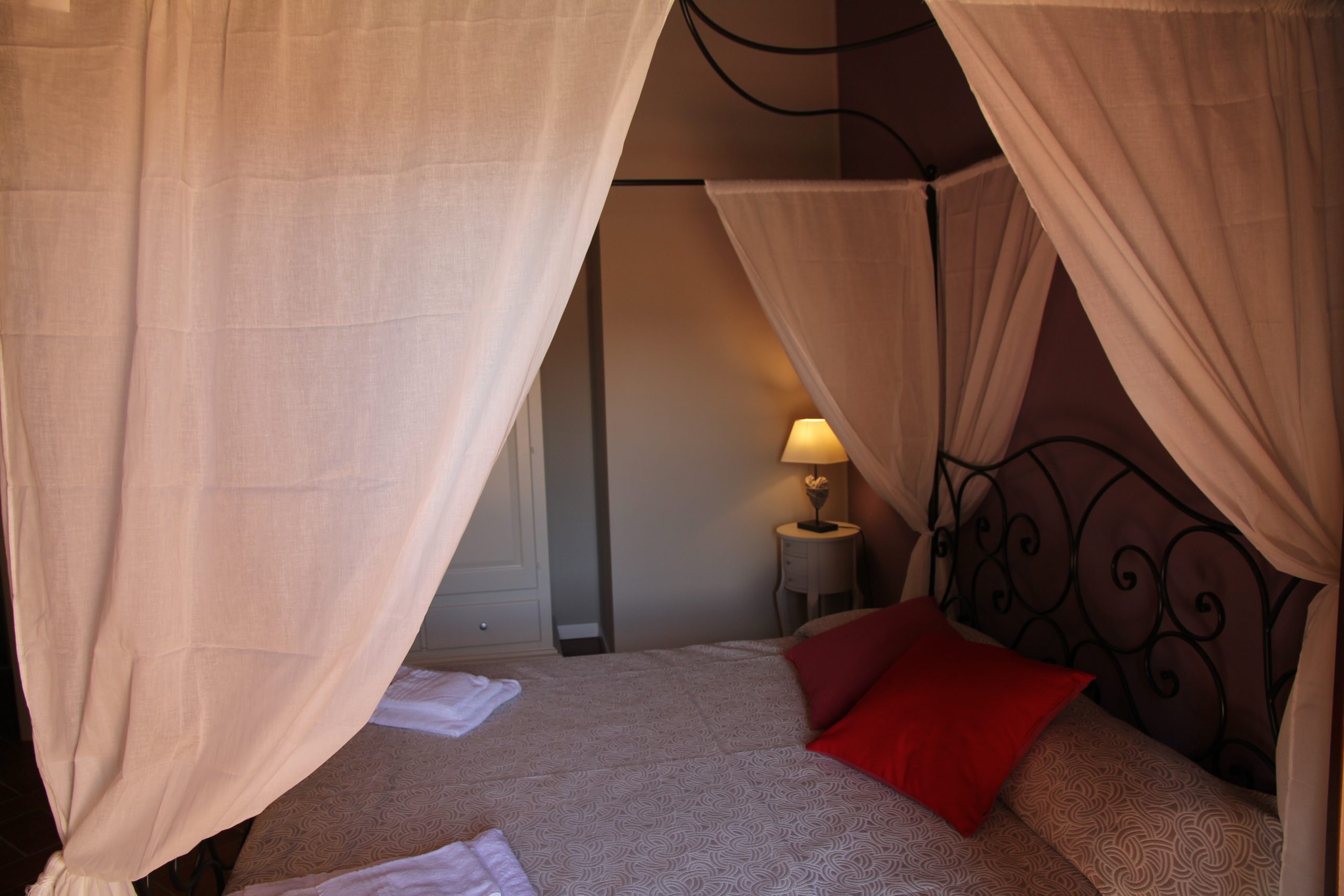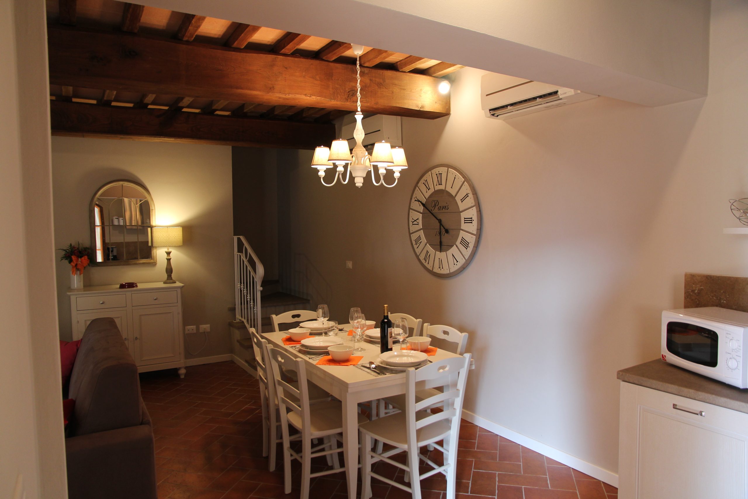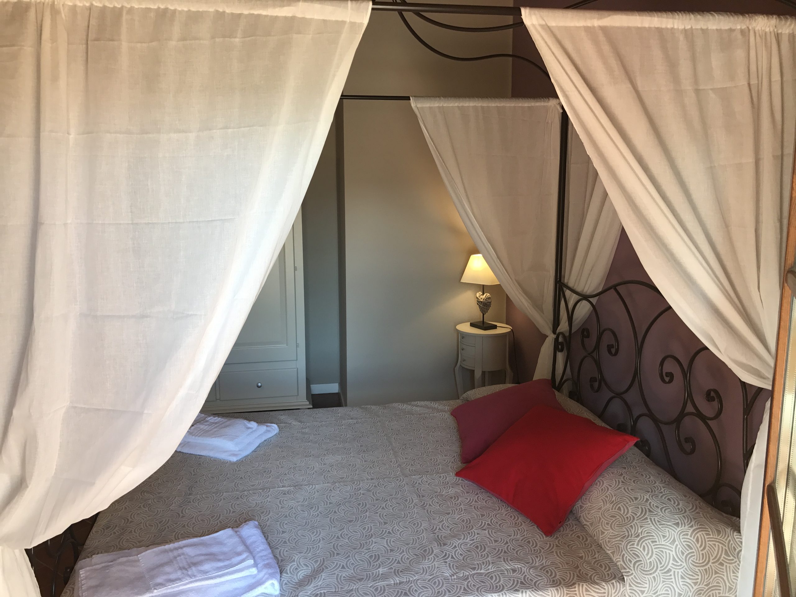 Første etasje består av en stor stue med utstyrt kjøkken (kjøleskap/fryser, mikrobølgeovn, ovn med fire brennere, servise, spisebord og stoler), et lite bad med vask, bidet og toalett, og en sovesofa. I andre etasje er det dobbelt soverom (himmelseng) hvorfra du får tilgang til terrassen med utsikt over bassenget, og et bad med dusj og toalett.