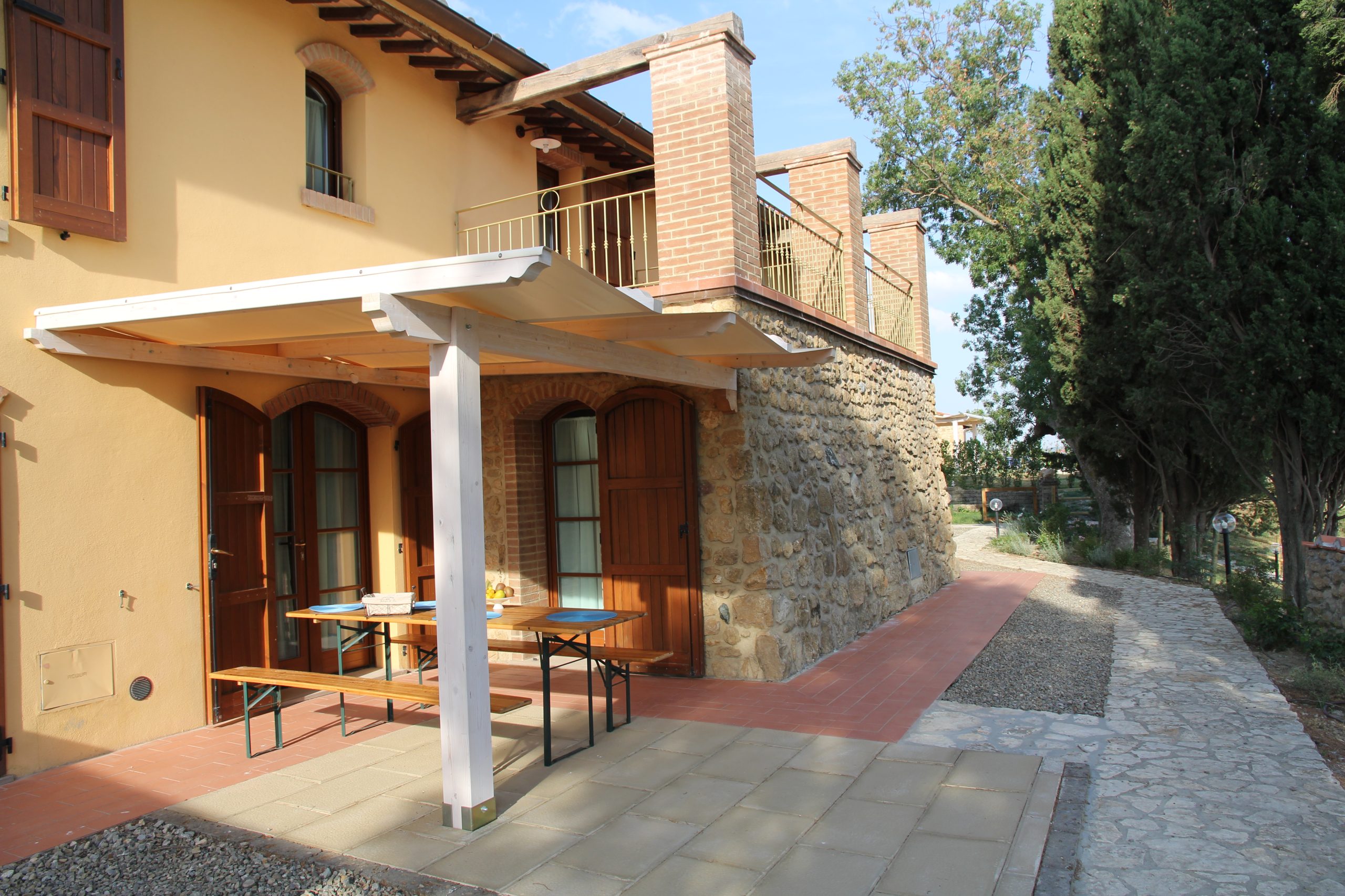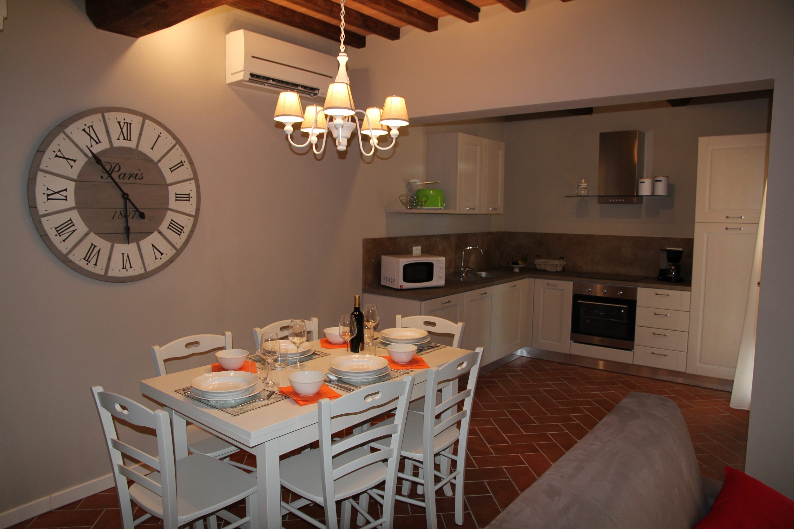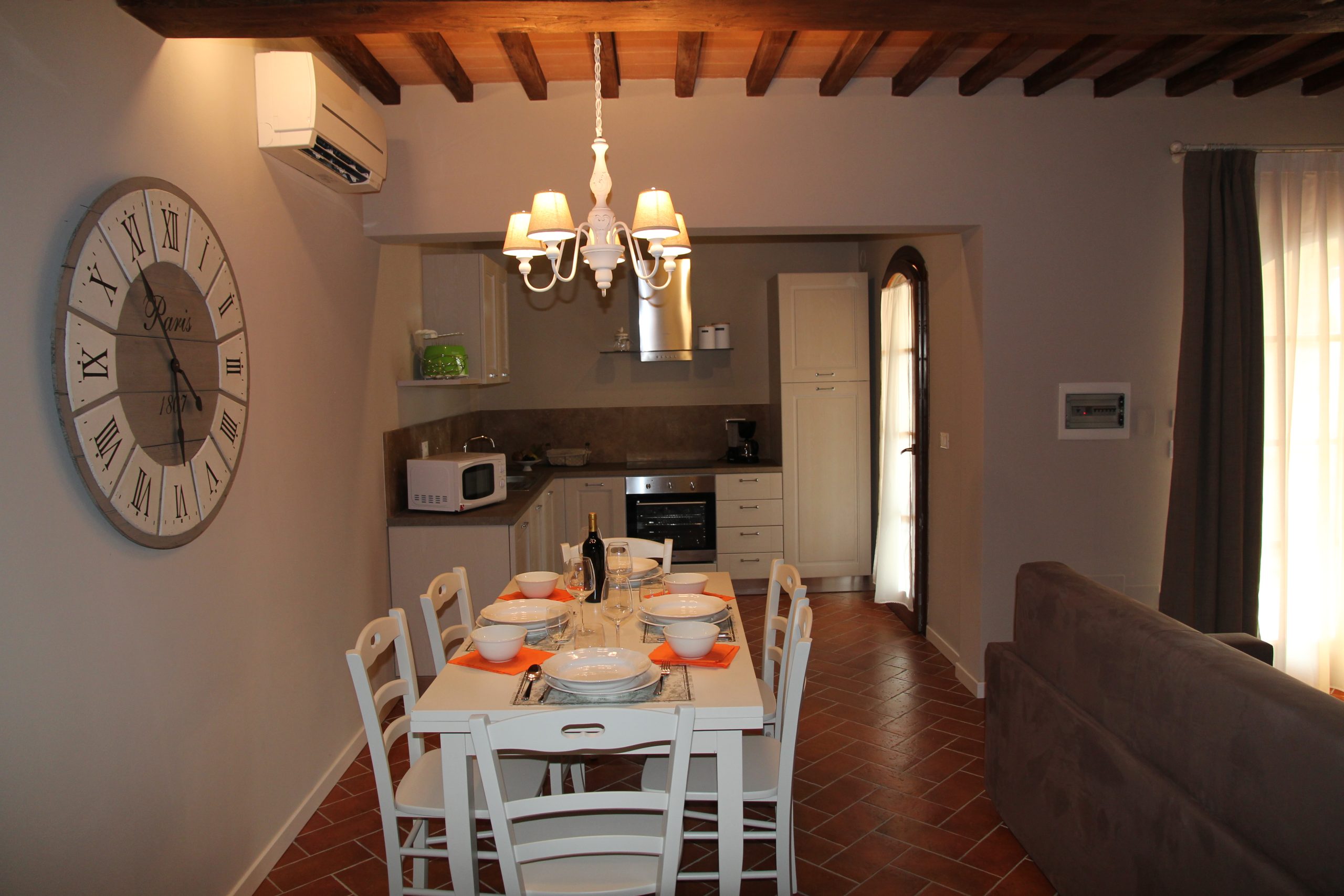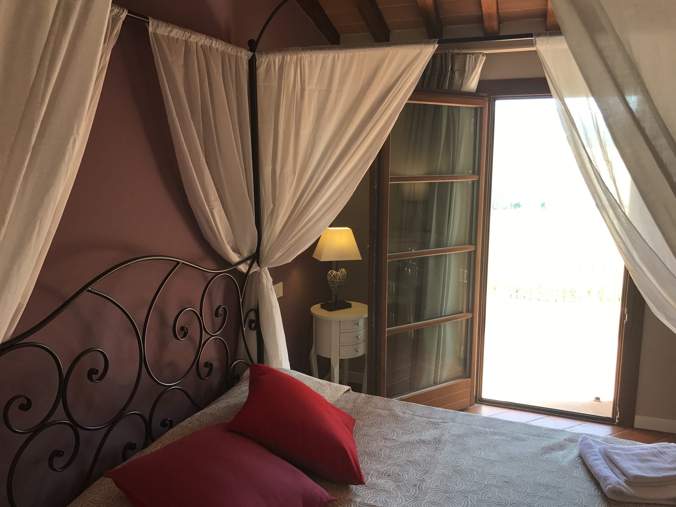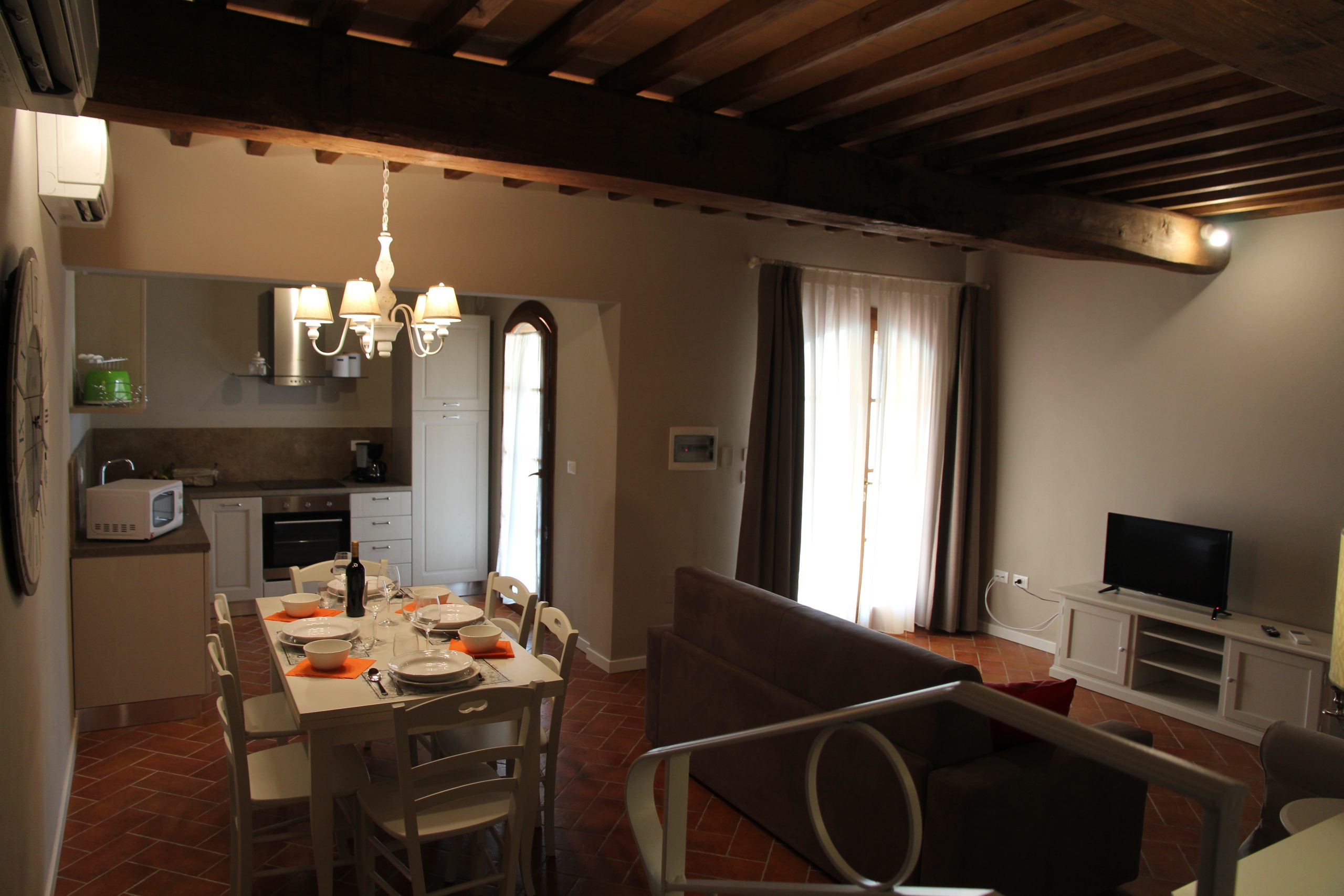 Første etasje består av en stor stue med utstyrt kjøkken (kjøleskap/fryser, mikrobølgeovn, ovn med fire brennere, servise, spisebord og stoler), et lite bad med vask, bidet og toalett, og en sovesofa. I andre etasje er det dobbelt soverom (himmelseng) hvorfra du får tilgang til terrassen med utsikt over bassenget, og et bad med dusj og toalett.