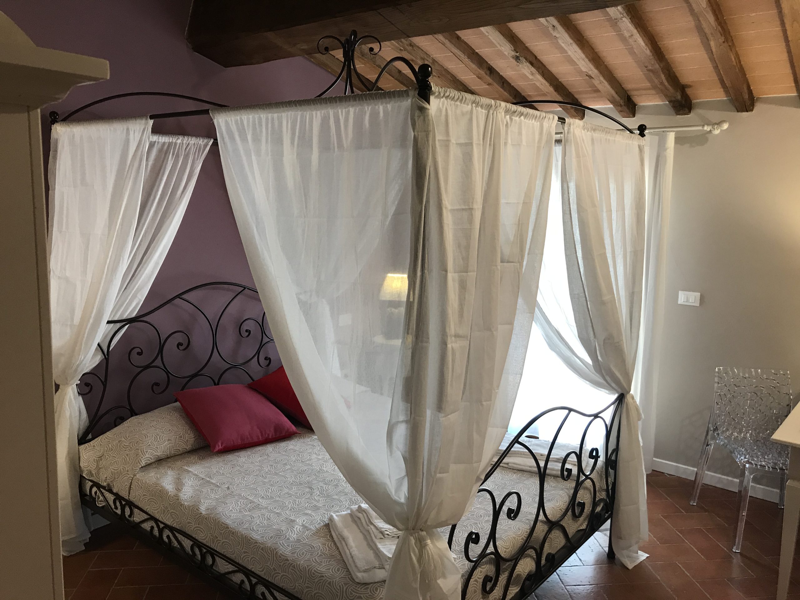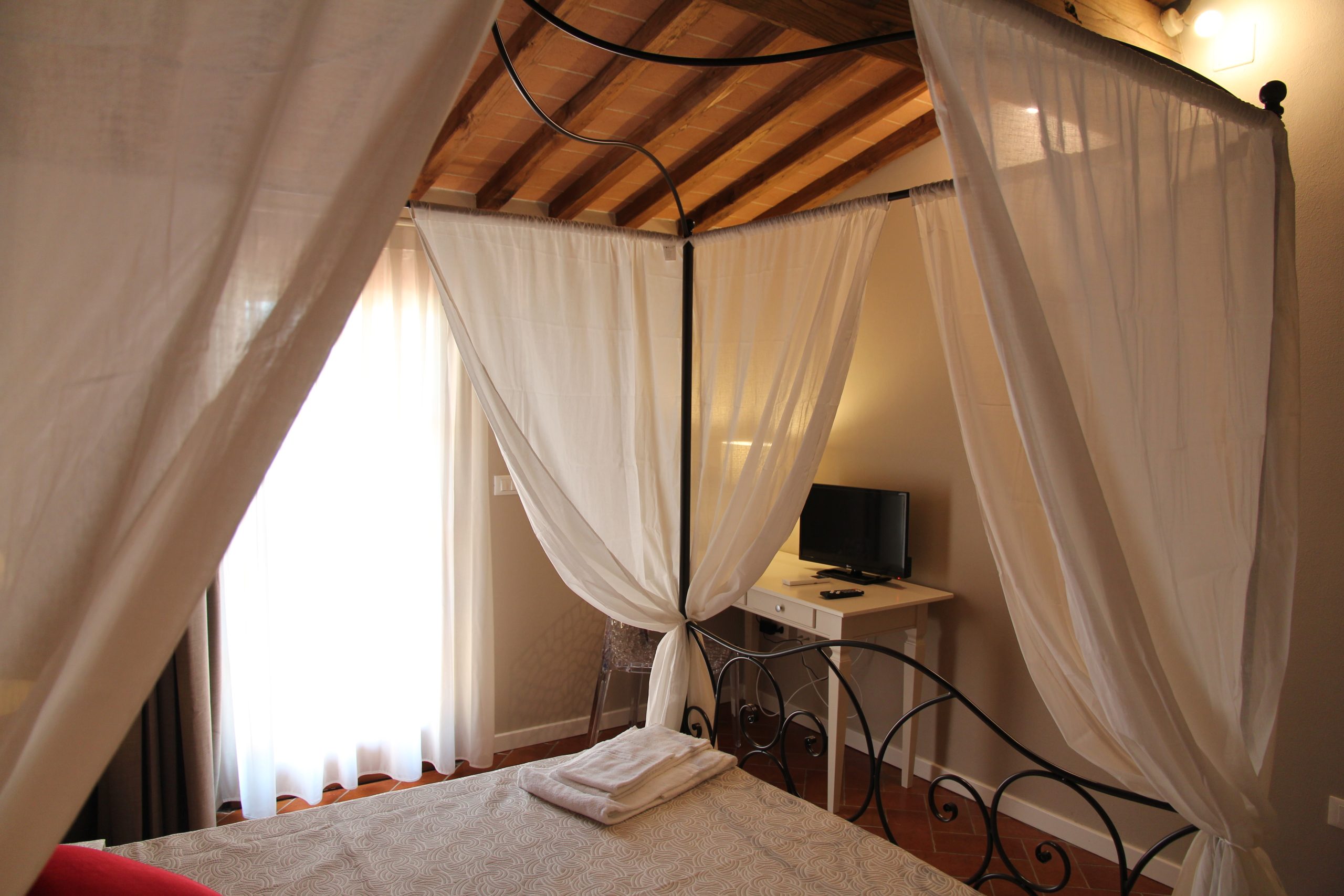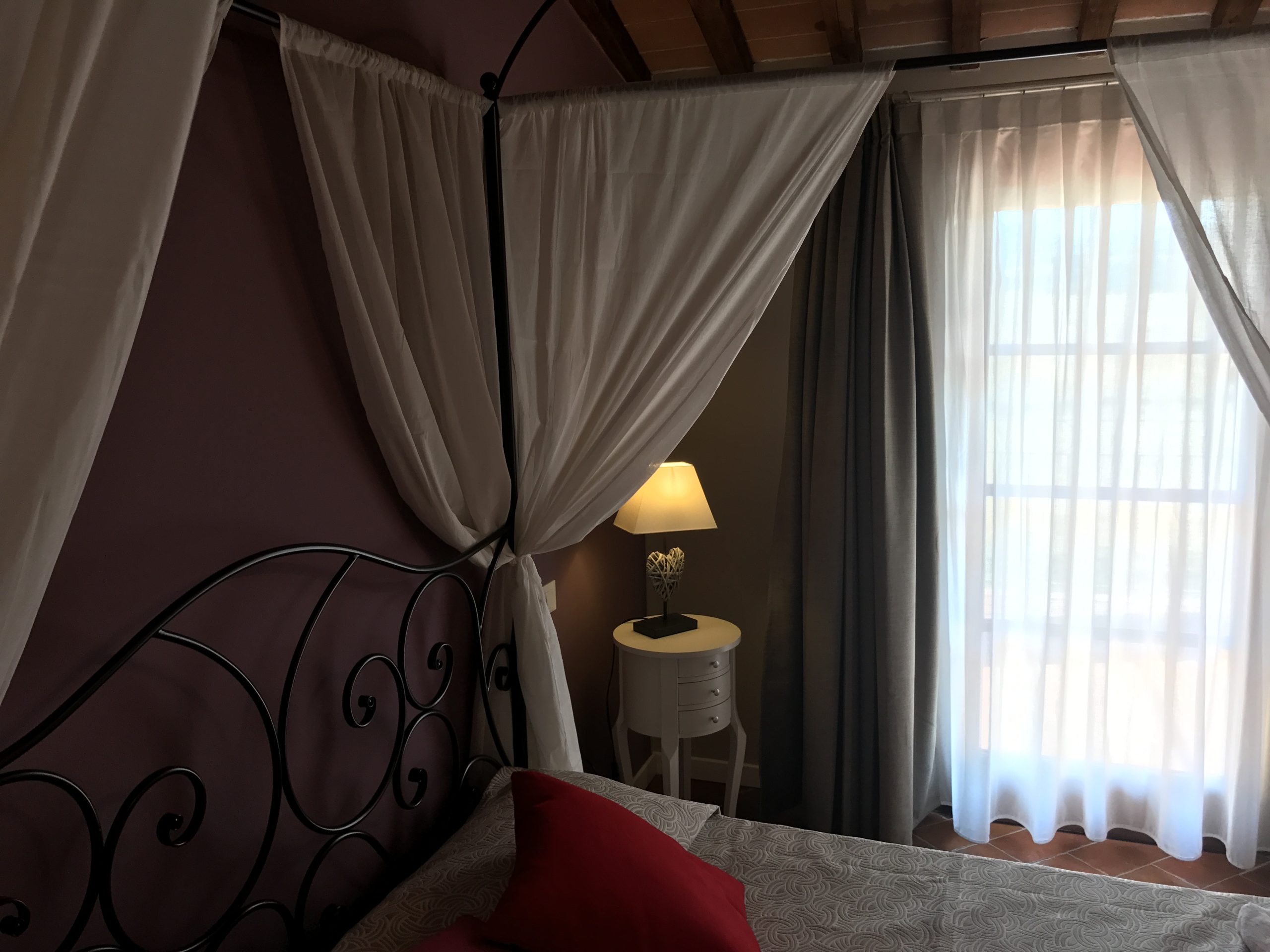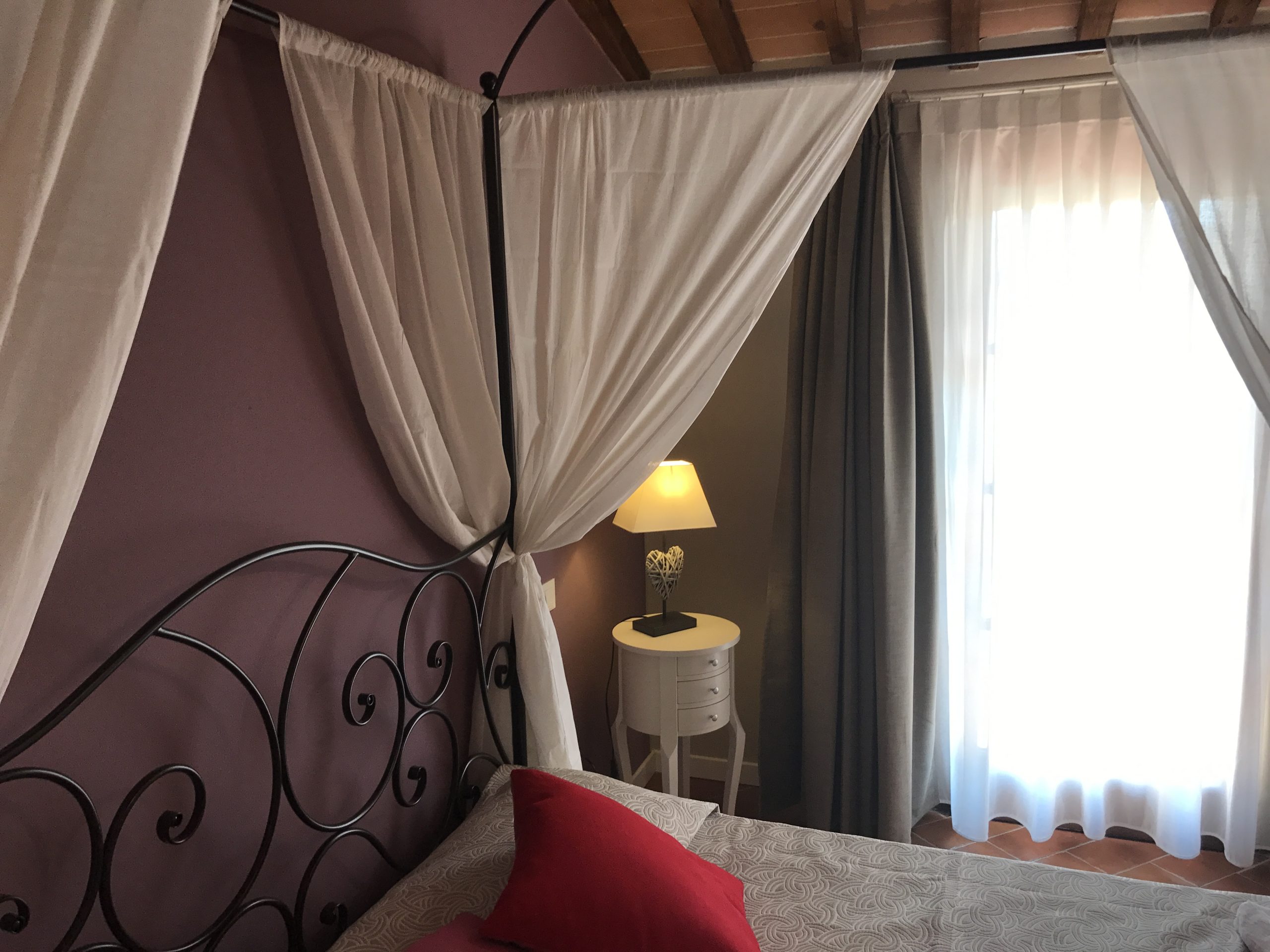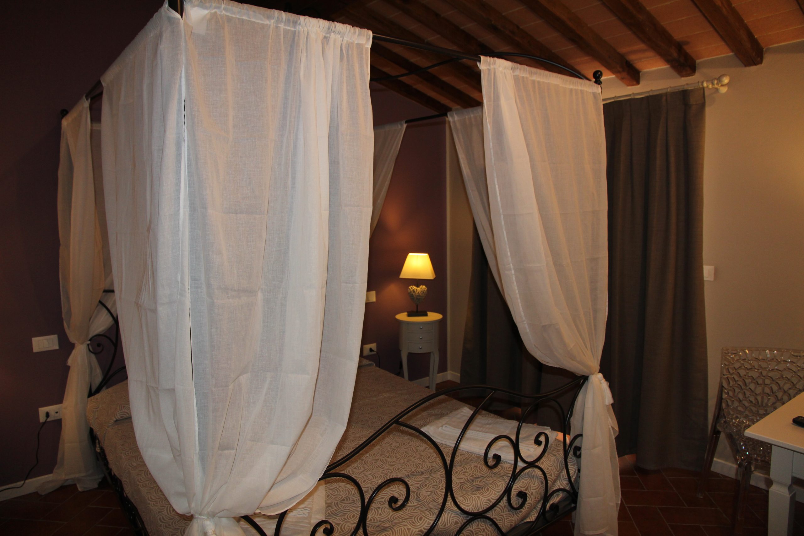 Første etasje består av en stor stue med utstyrt kjøkken (kjøleskap/fryser, mikrobølgeovn, ovn med fire brennere, servise, spisebord og stoler), et lite bad med vask, bidet og toalett, og en sovesofa. I andre etasje er det dobbelt soverom (himmelseng) hvorfra du får tilgang til terrassen med utsikt over bassenget, og et bad med dusj og toalett.