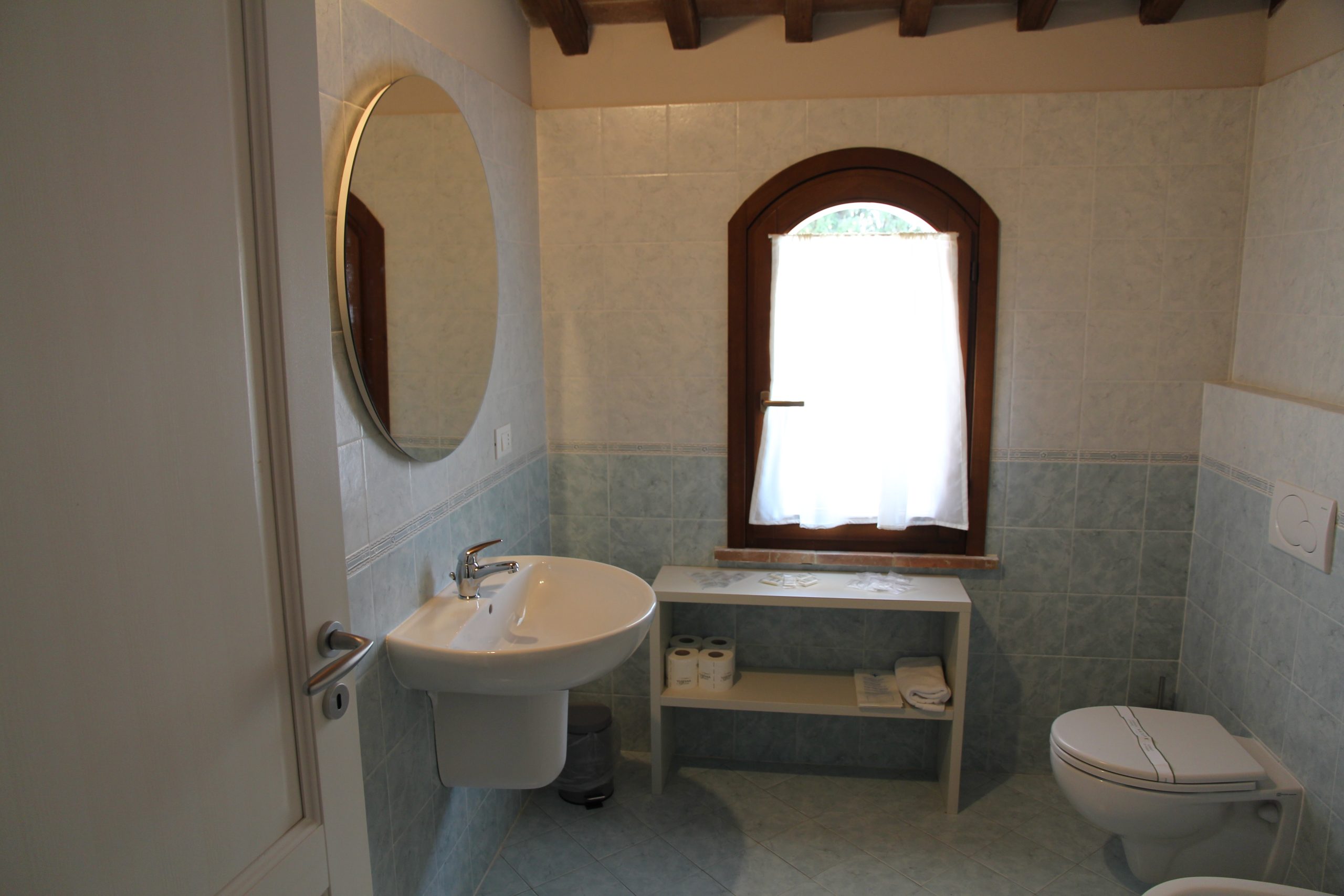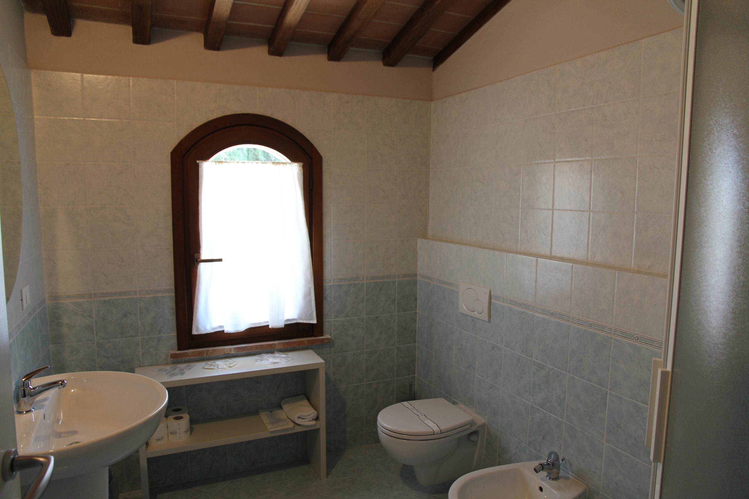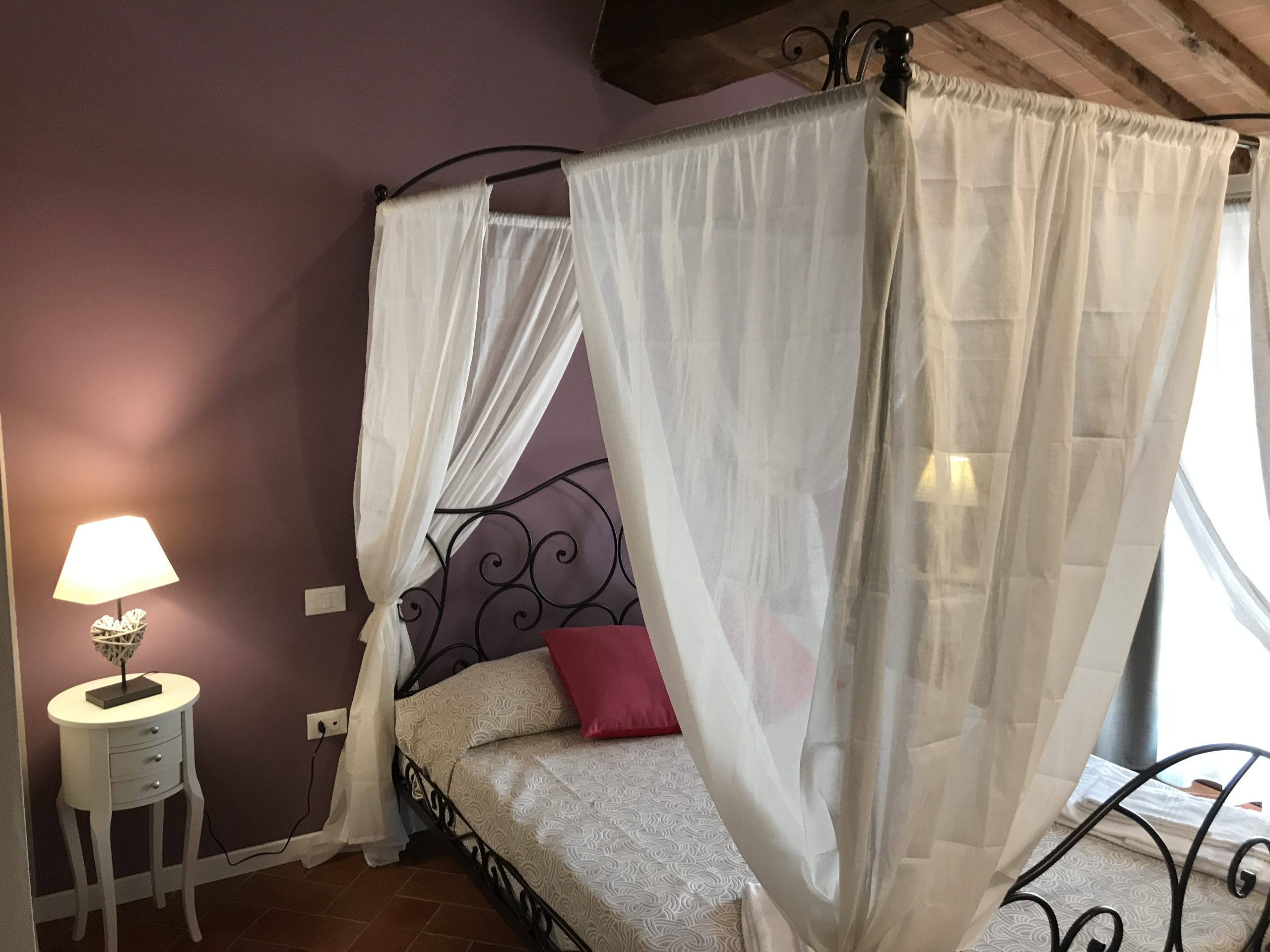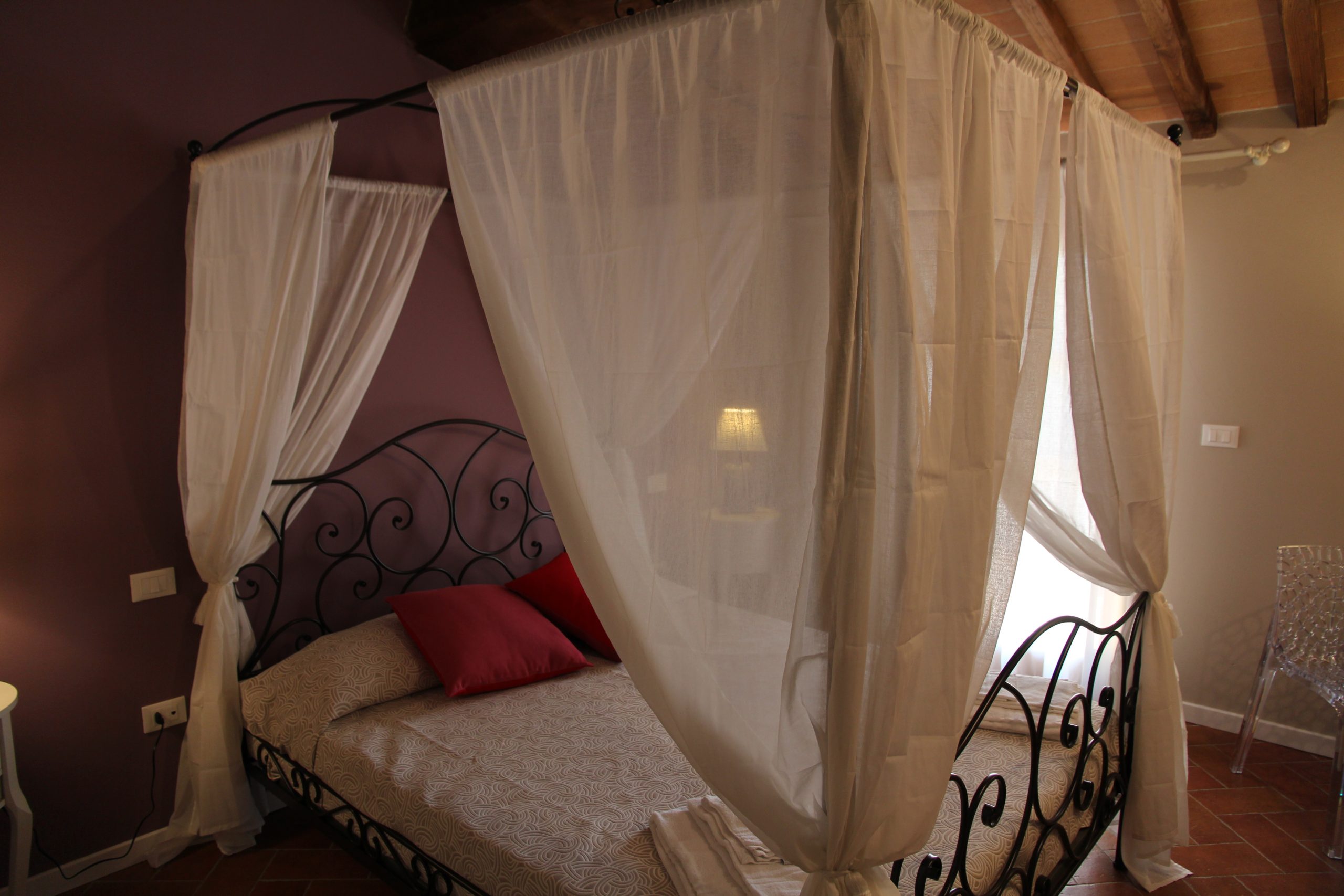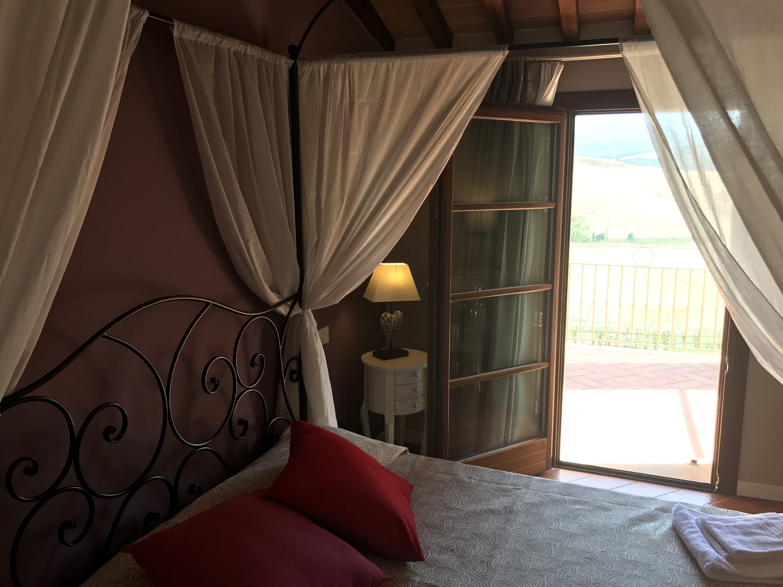 Første etasje består av en stor stue med utstyrt kjøkken (kjøleskap/fryser, mikrobølgeovn, ovn med fire brennere, servise, spisebord og stoler), et lite bad med vask, bidet og toalett, og en sovesofa. I andre etasje er det dobbelt soverom (himmelseng) hvorfra du får tilgang til terrassen med utsikt over bassenget, og et bad med dusj og toalett.