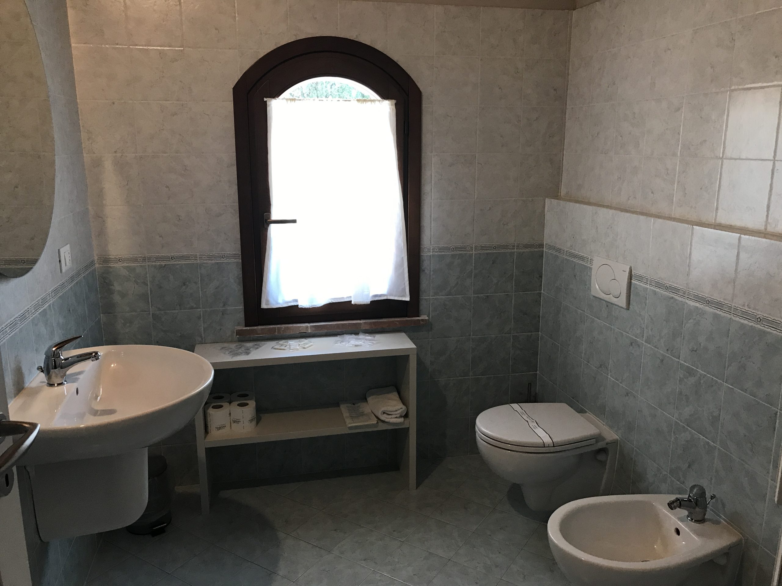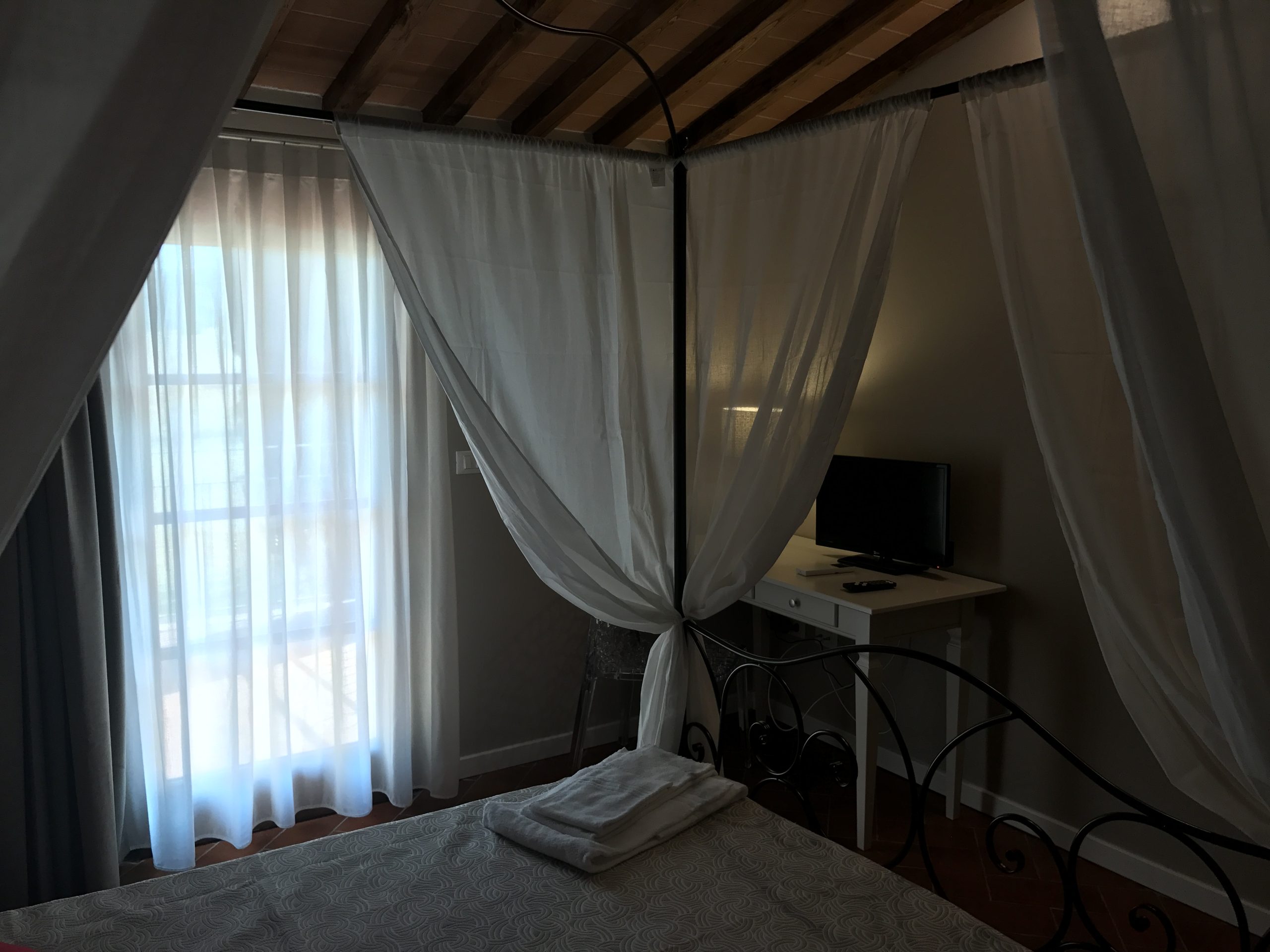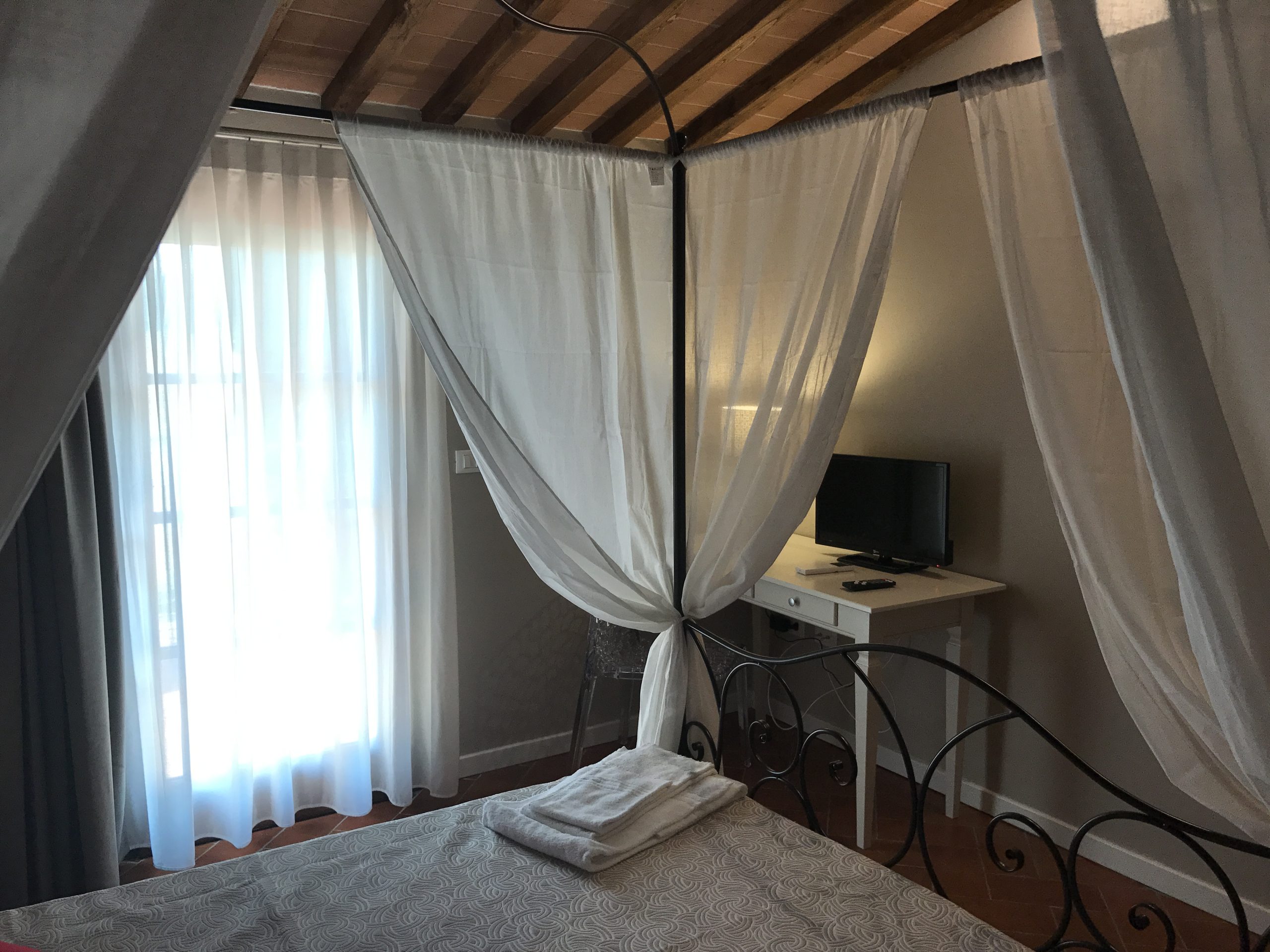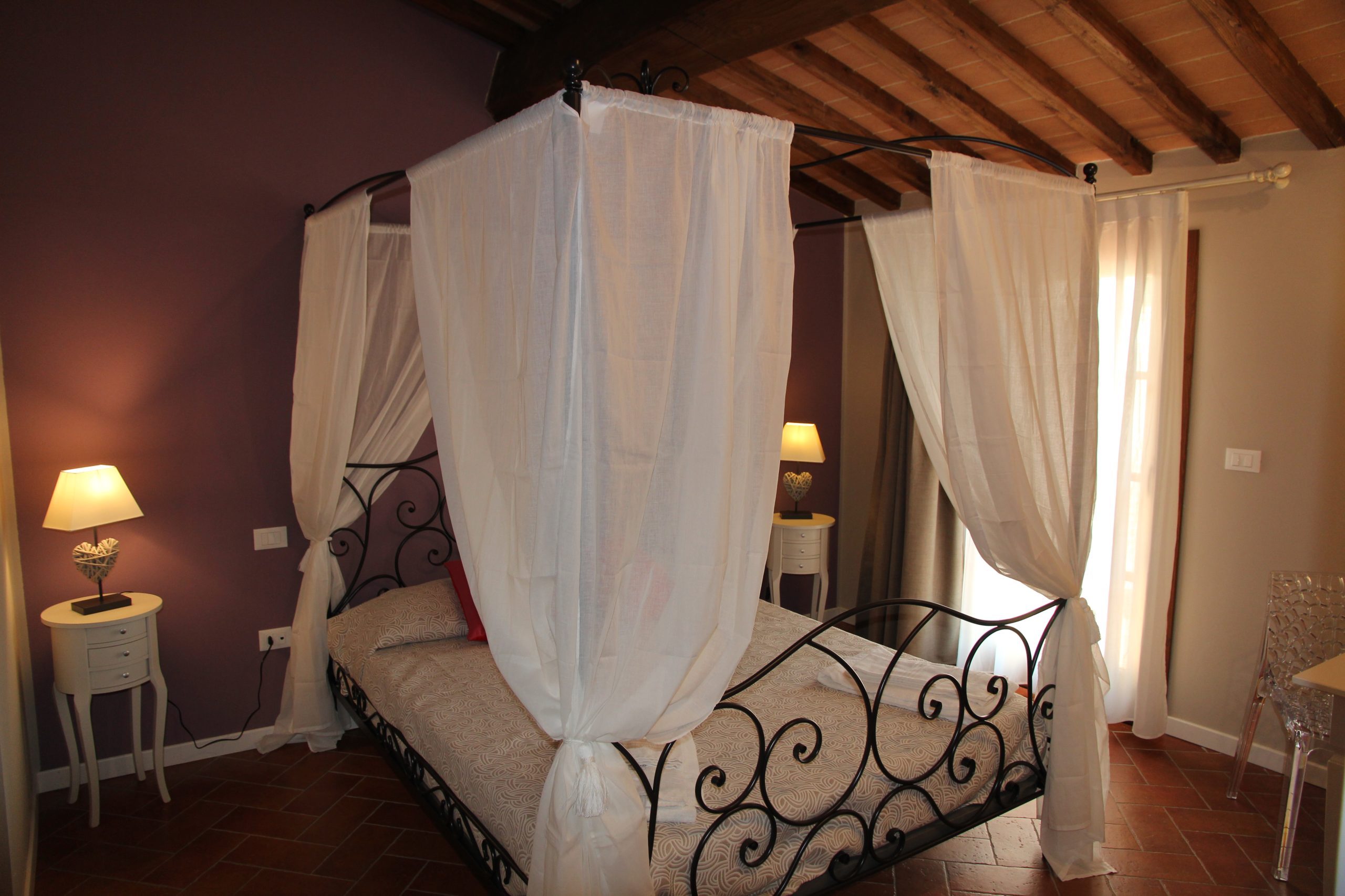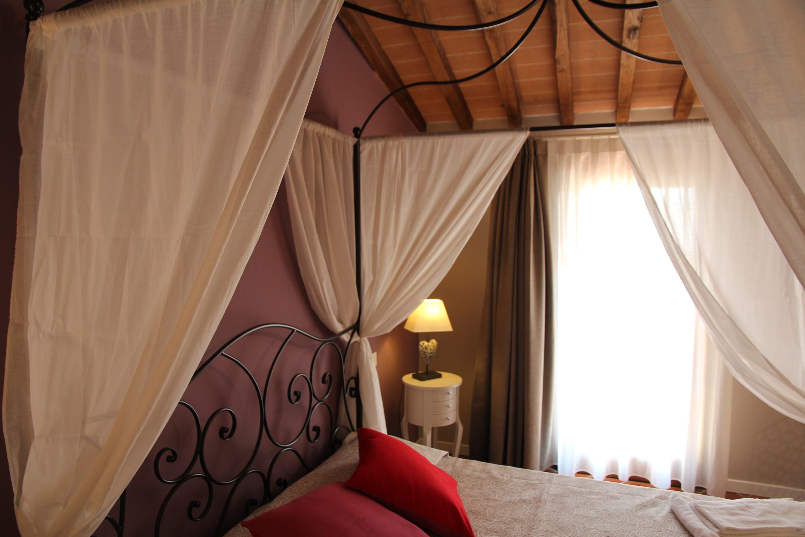 Første etasje består av en stor stue med utstyrt kjøkken (kjøleskap/fryser, mikrobølgeovn, ovn med fire brennere, servise, spisebord og stoler), et lite bad med vask, bidet og toalett, og en sovesofa. I andre etasje er det dobbelt soverom (himmelseng) hvorfra du får tilgang til terrassen med utsikt over bassenget, og et bad med dusj og toalett.