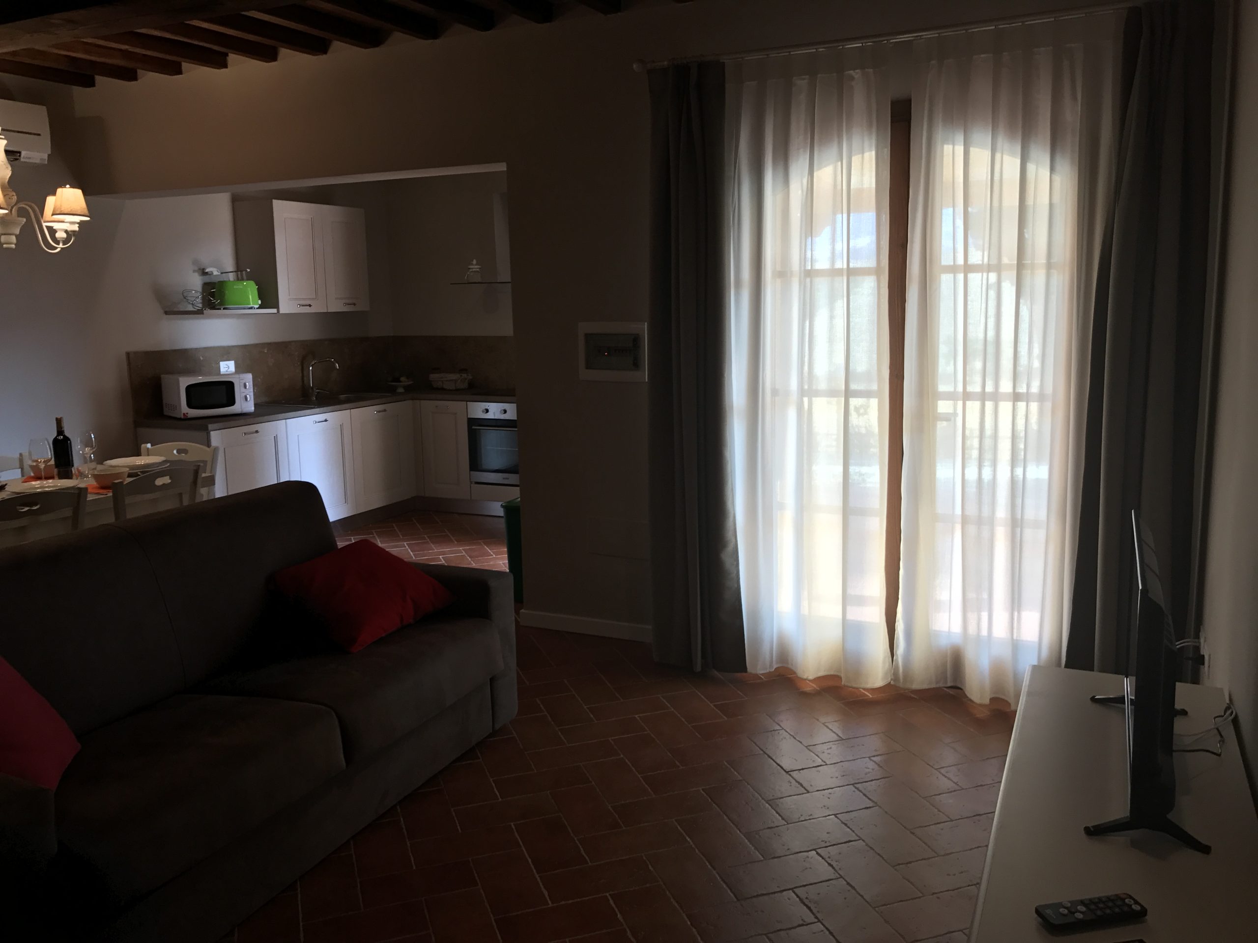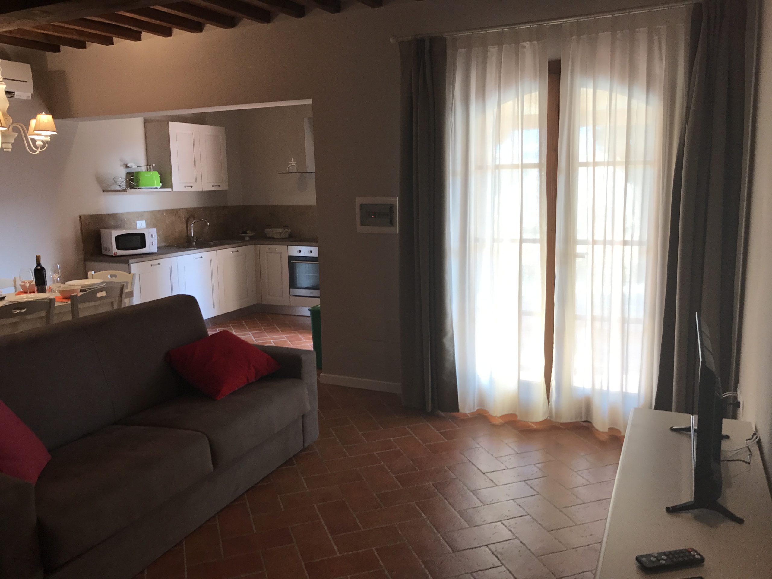 Fra stuen har du tilgang til den private terrassen med grill, bord og stoler. Leiligheten er utstyrt med air condition, vaskemaskin og wifi internett.